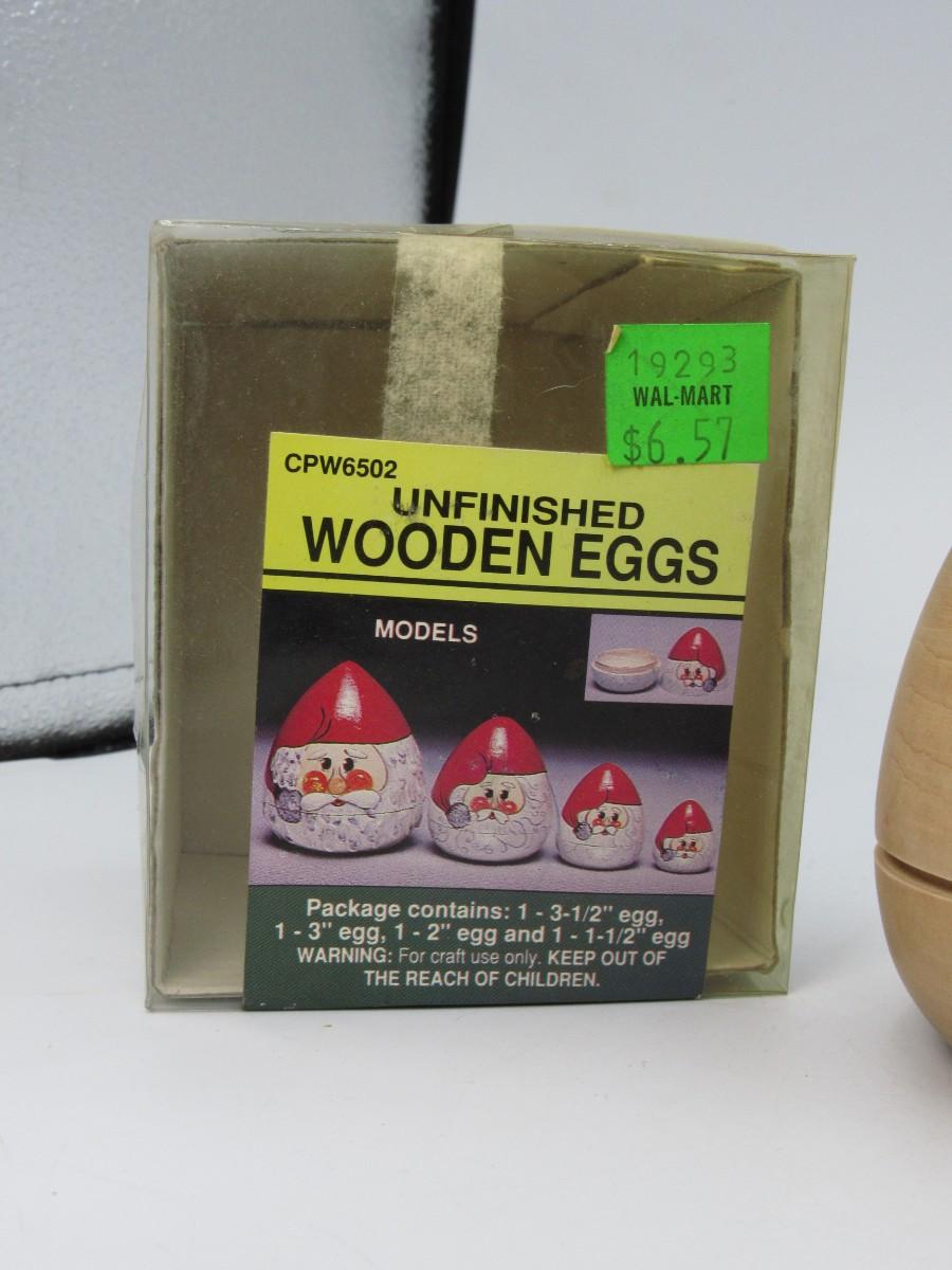 There is no damage to the wooden eggs and is in good useable condition. Check pictures for more details and sizing.
