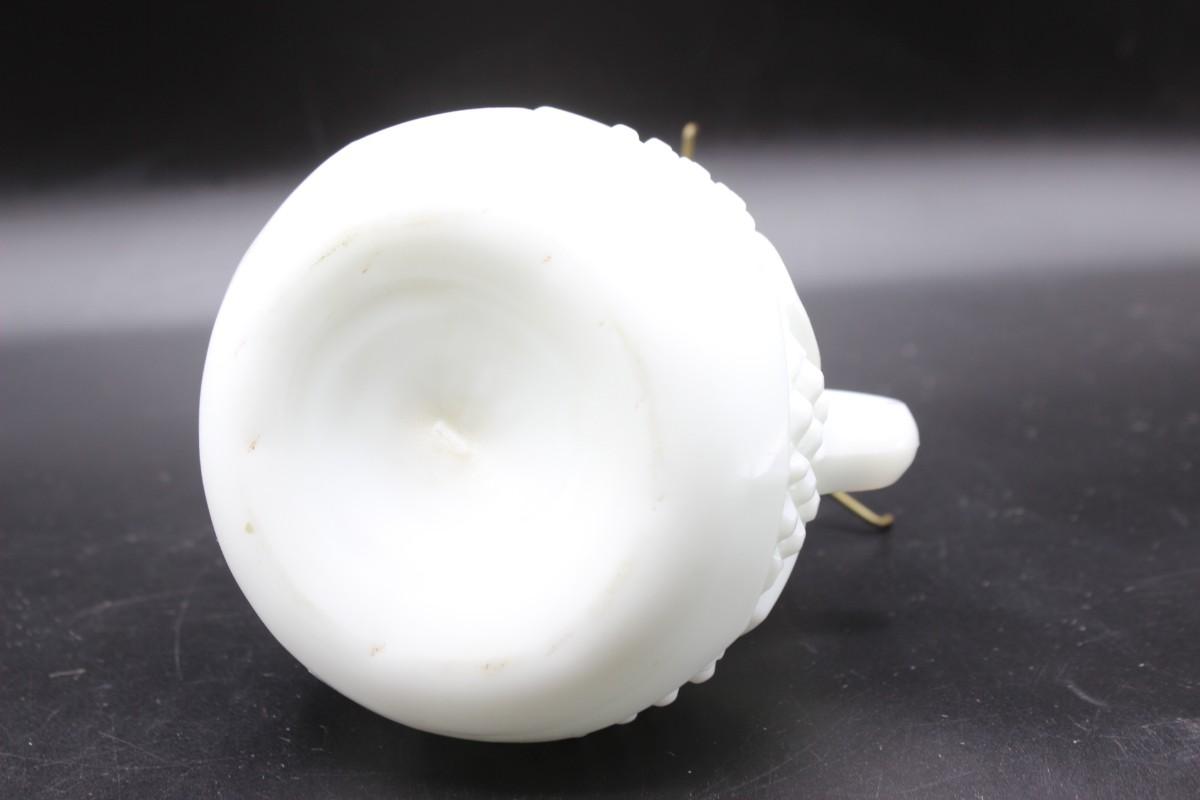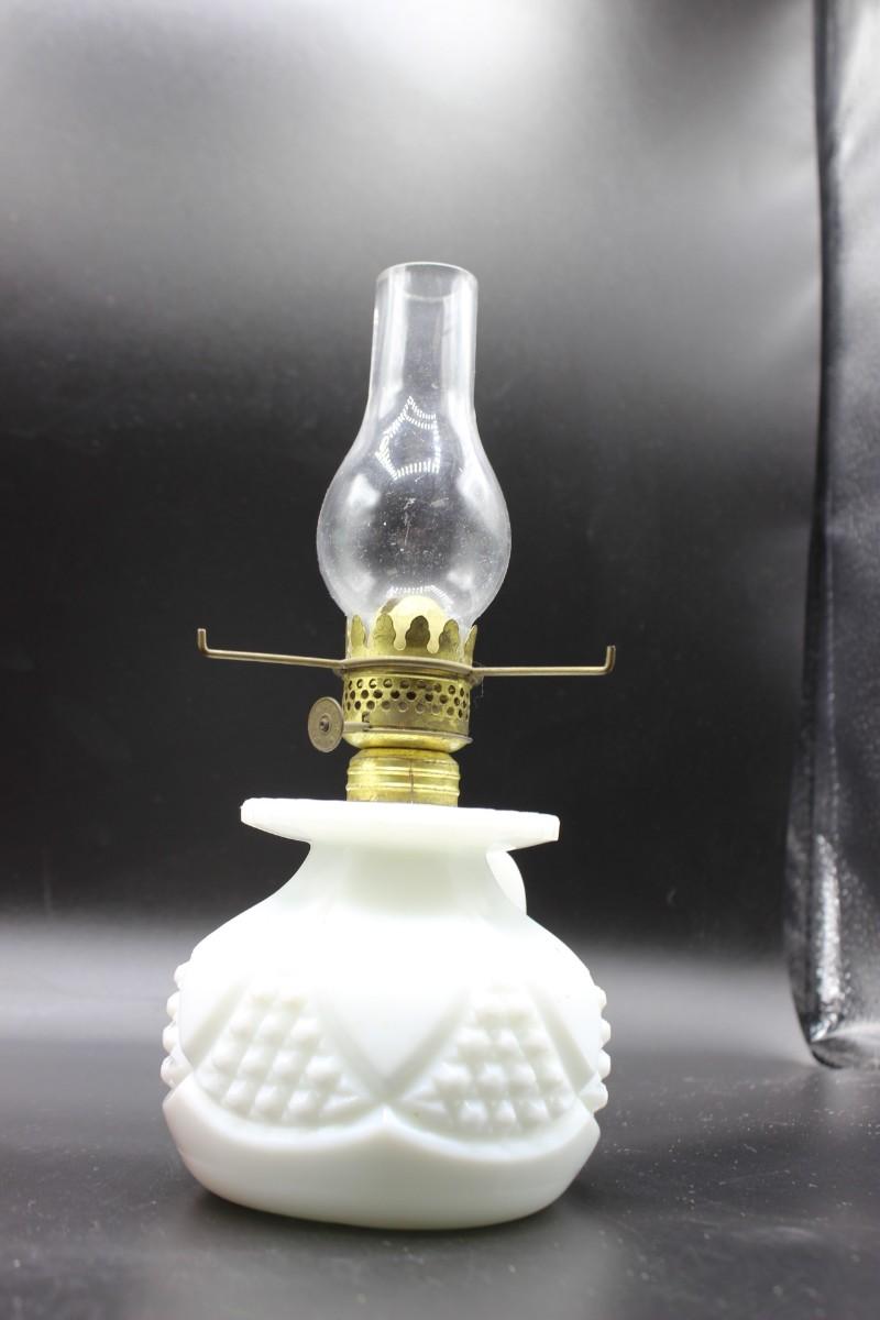 Vintage Imperial Milk Glass Tulip & Cane Bunding Oil Lamp, there's no cracks or chips to the piece and is in good vintage condition. Check pictures for more details and for sizing. Has not been tested.