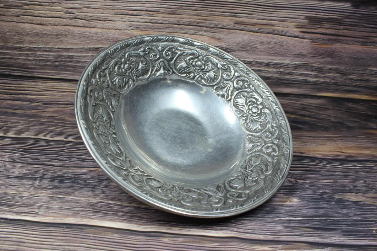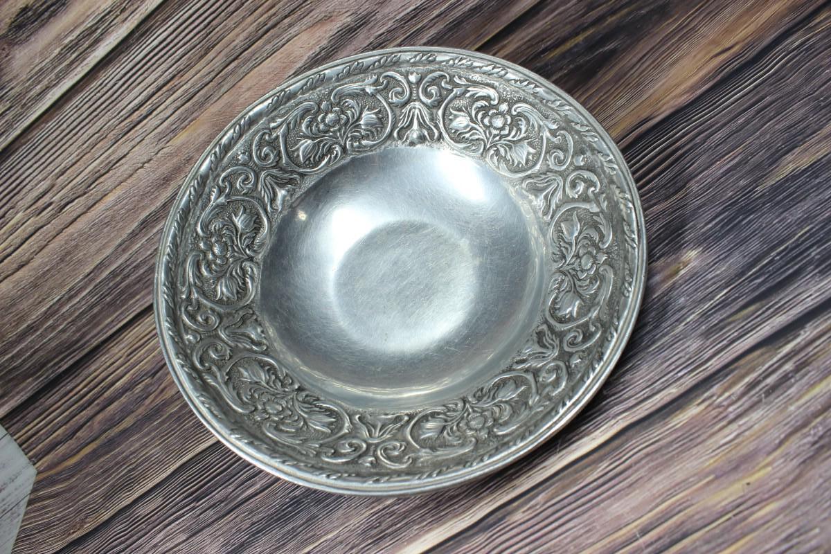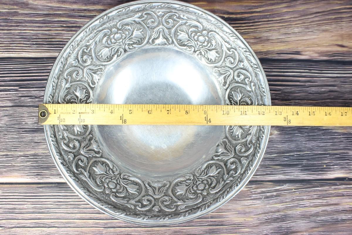 Wilton Armetale Pewter Serving Bowl Floral Embossed Pattern, there is no damage to the serving bowl and is in good condition. Check pictures for more details and for sizing.