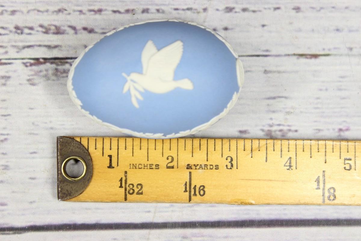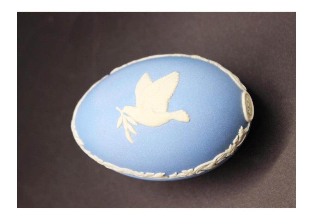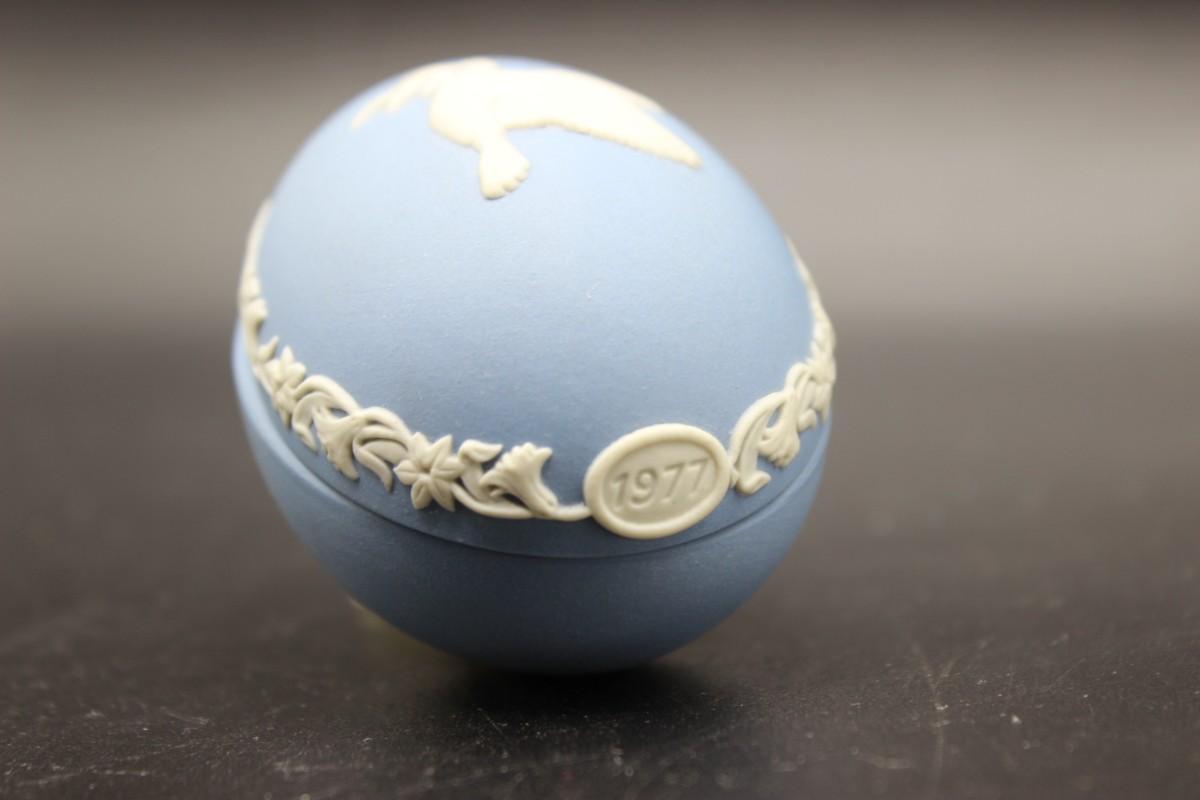 Wedgwood Blue Jasperware Dove Easter Egg for 1977, there are no cracks or chips to the piece and is in good vintage condition. Check pictures for more details and for sizing, the egg is about 3 inches wide.
