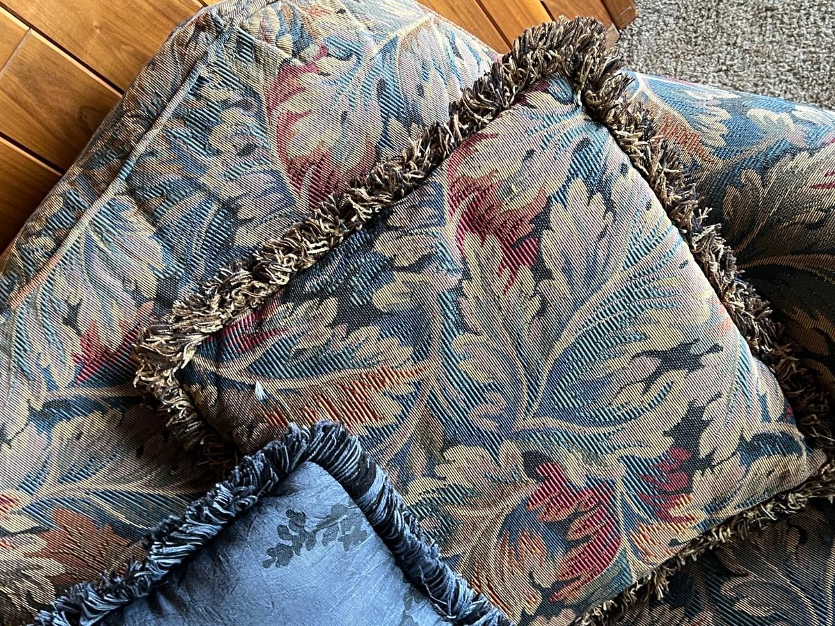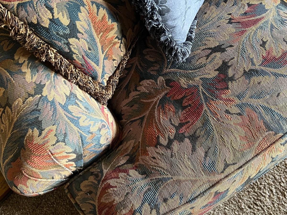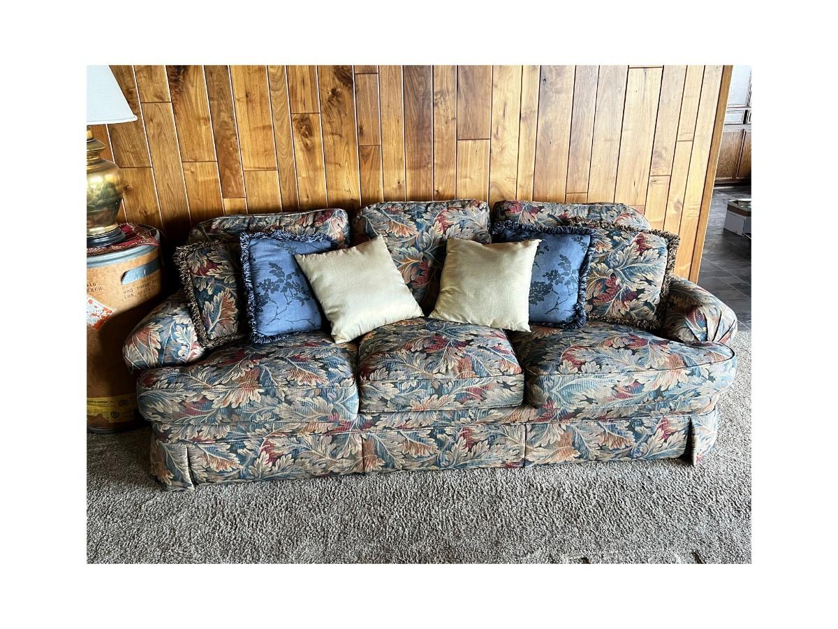 Dark Multicolor Floral Leaf Pattern Sofa Couch. In good used condition. Overstuffed three cushion couch. Rich tone color pattern.