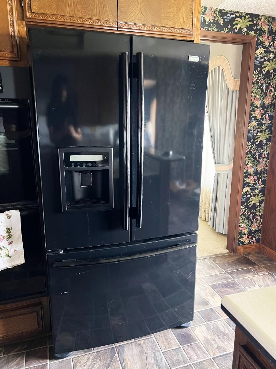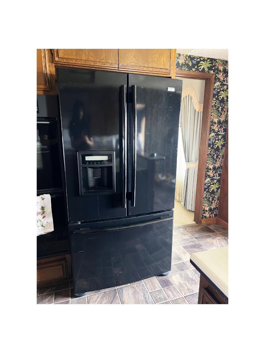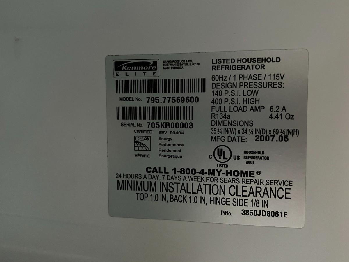 Black Kenmore Elite French Door Freezer on the Bottom Refrigerator Fridge. Model #795.77569600. Mfg. 2007. Works. In good used condition. Ice & water in the door.