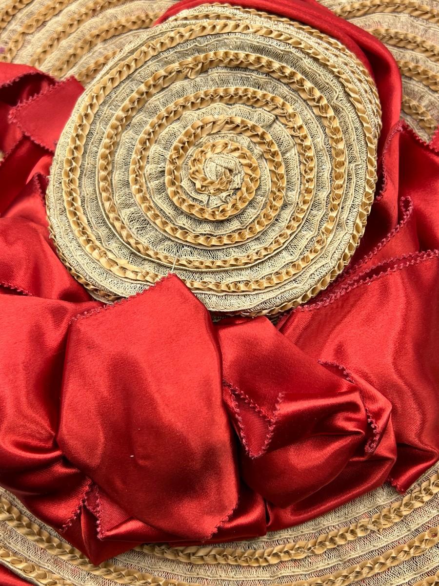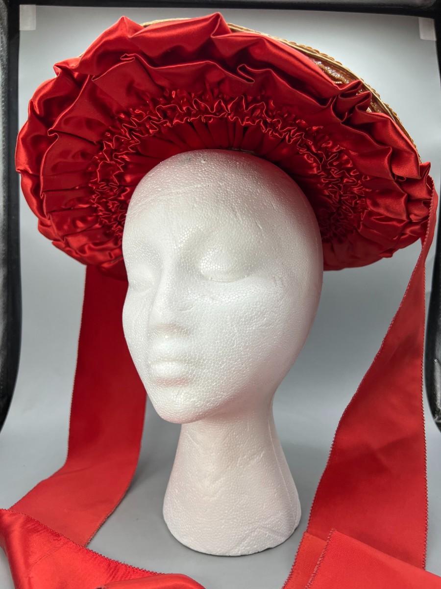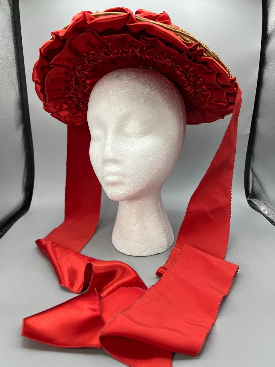 Vintage Red Scarlet Cloth Ribbon Prairie Straw Dress Sun Hat