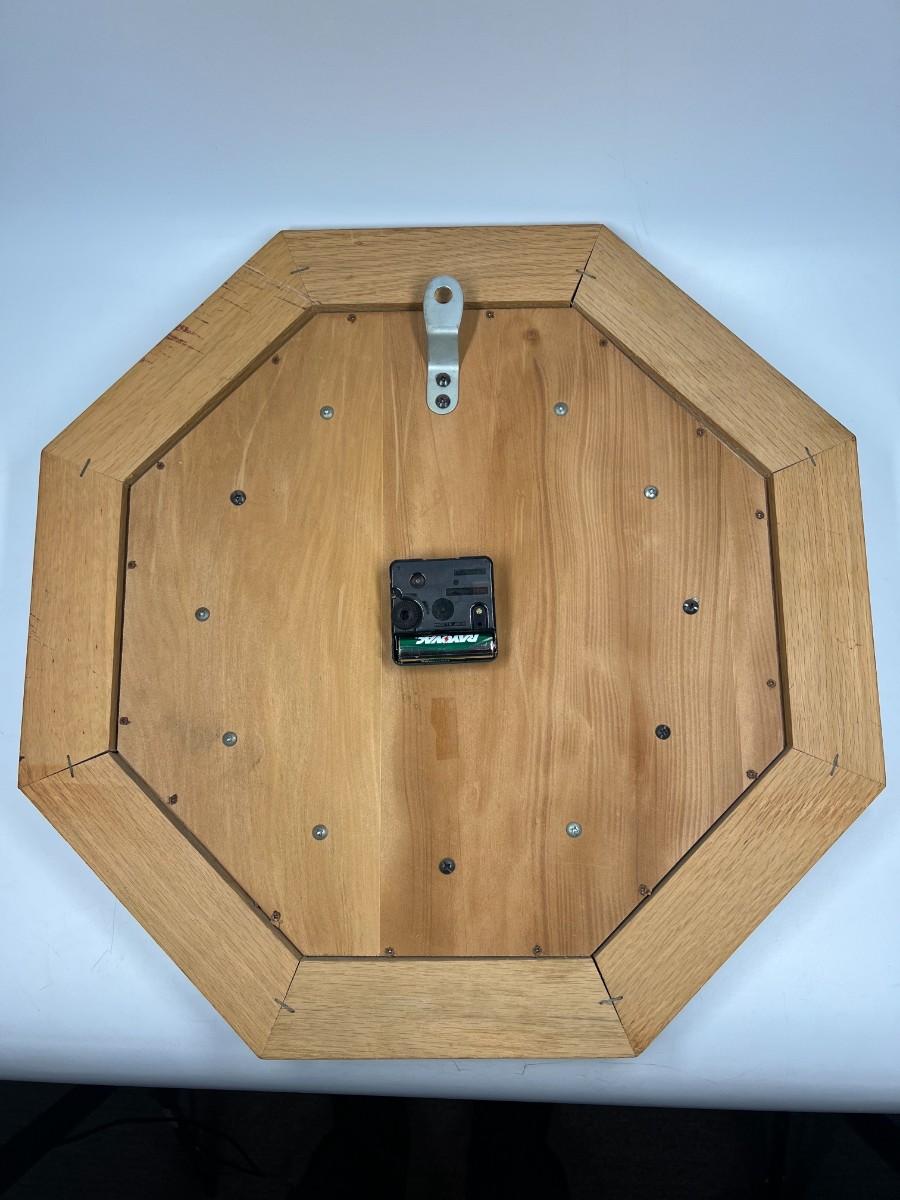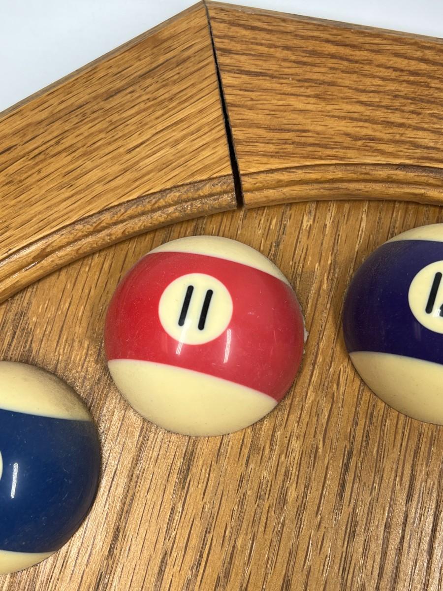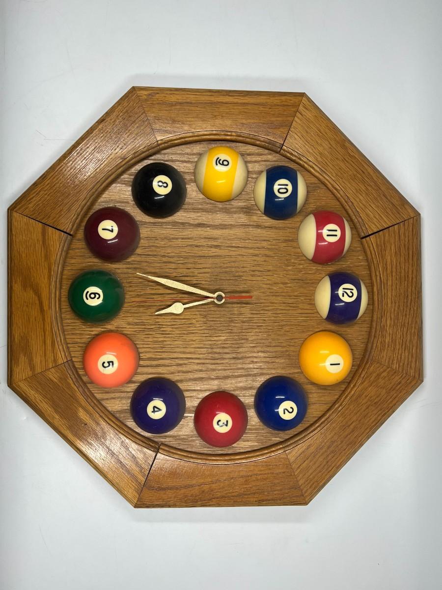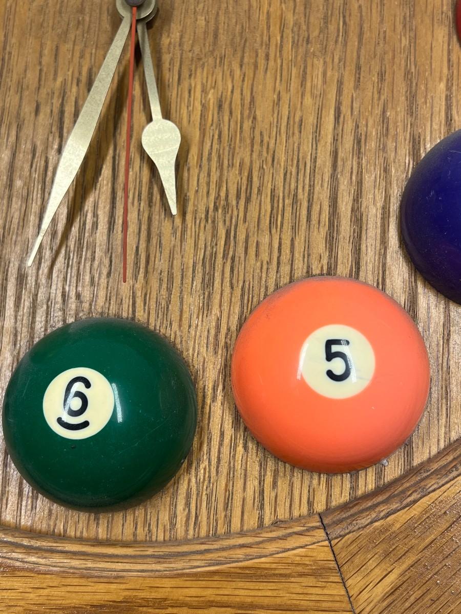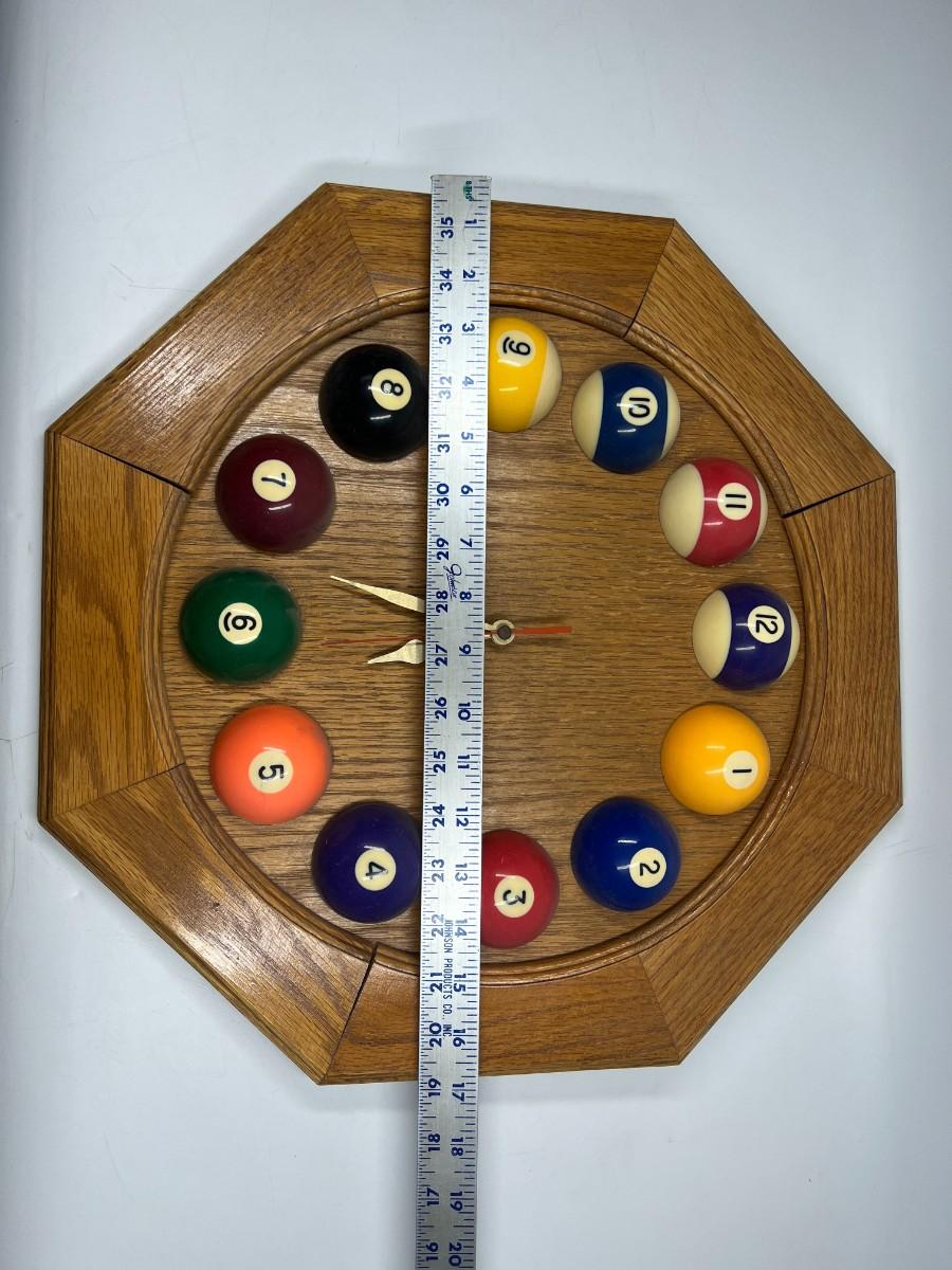 There is some wear to the clock and has not been tested with new batteries. Battery powered billiard themed wall clock. Has red sweep second hand.
