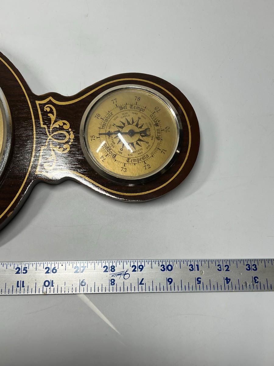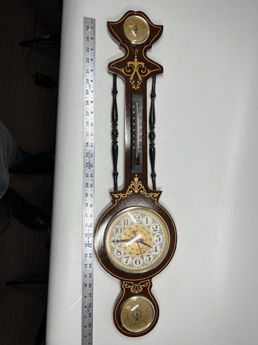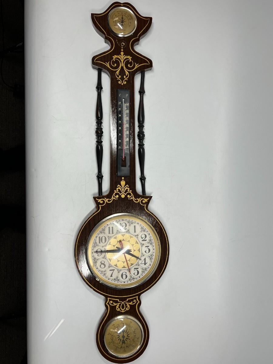 Battery Operated Wall Clock Barometer Thermometer. Fair vintage condition, though one glass piece is loose. Untested and has not been tested with new batteries.