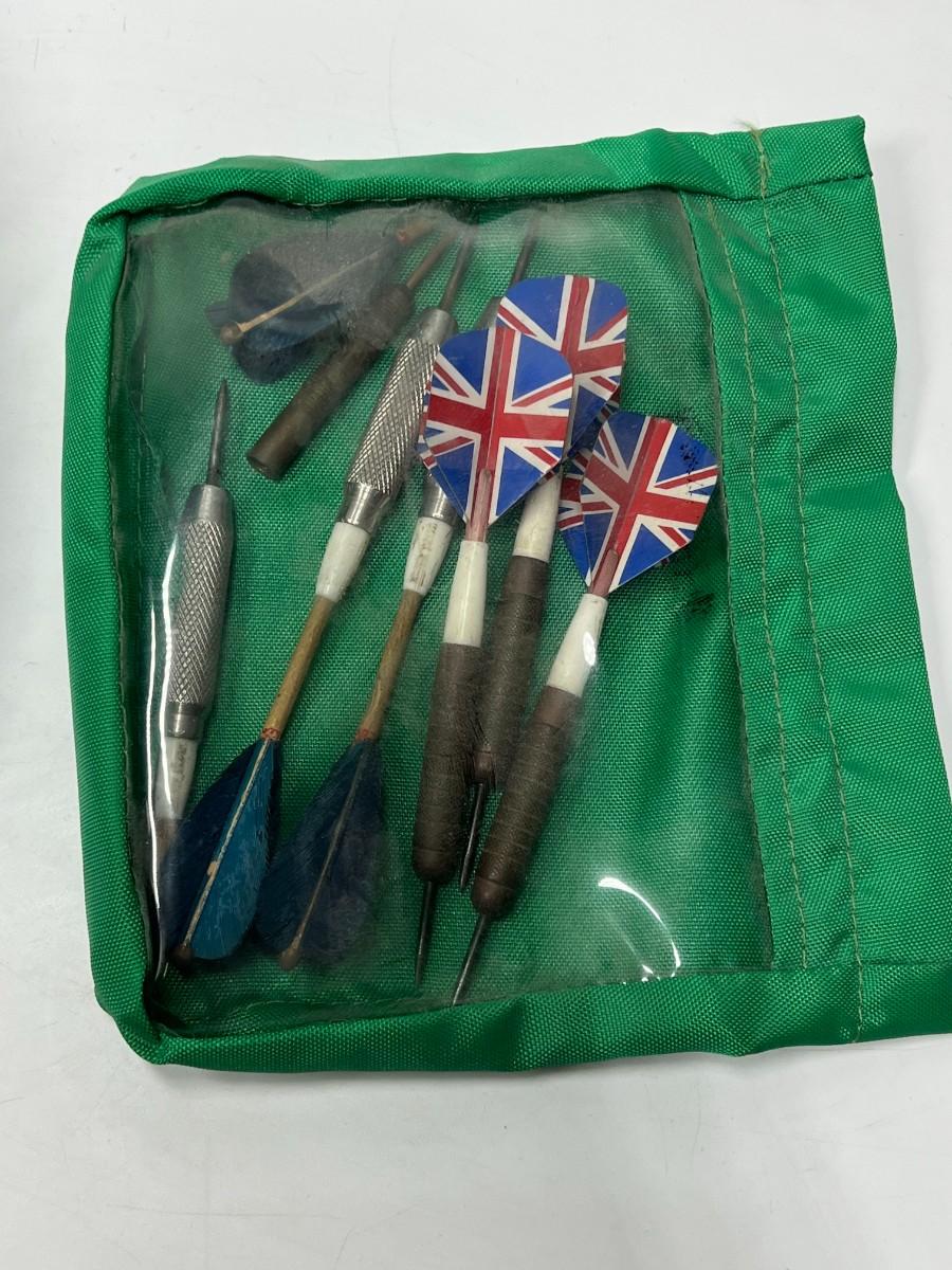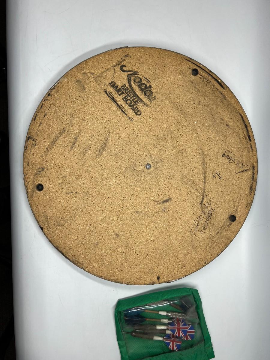 There is some wear to the dart board and the darts, but there is no significant damage and is in overall good playable of displayable condition. Check pictures for more details and for sizing.