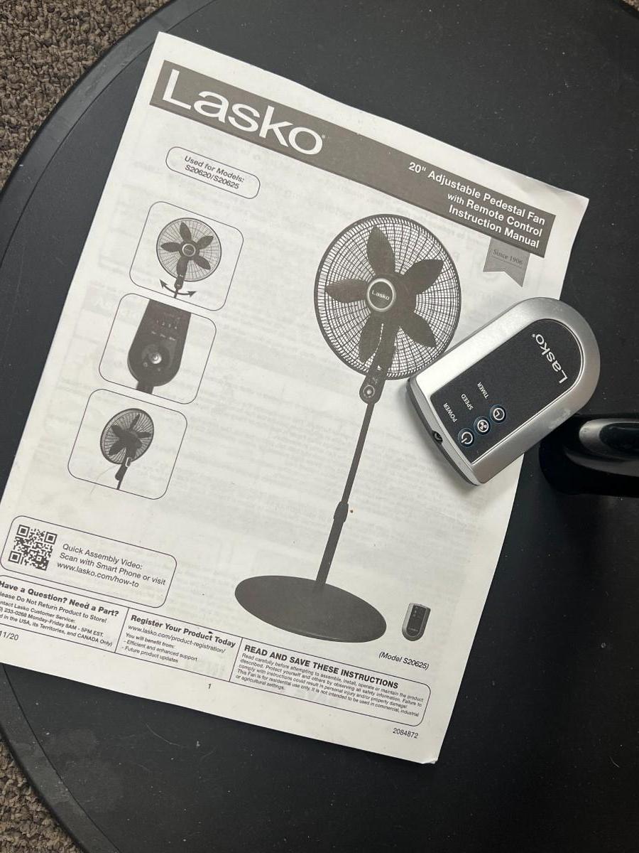 Lasko 20" Adjustable Pedestal Fan with Remote Control & Instructions