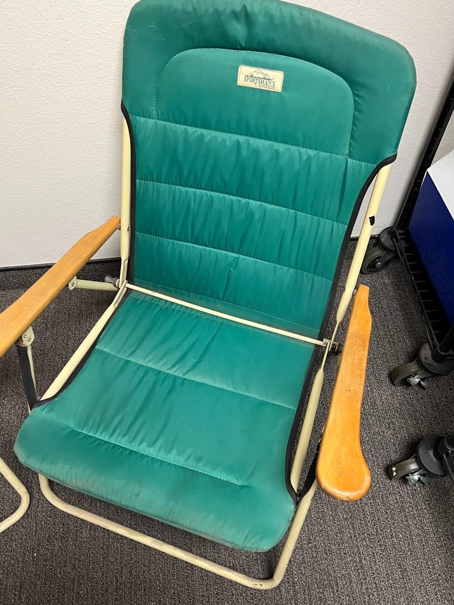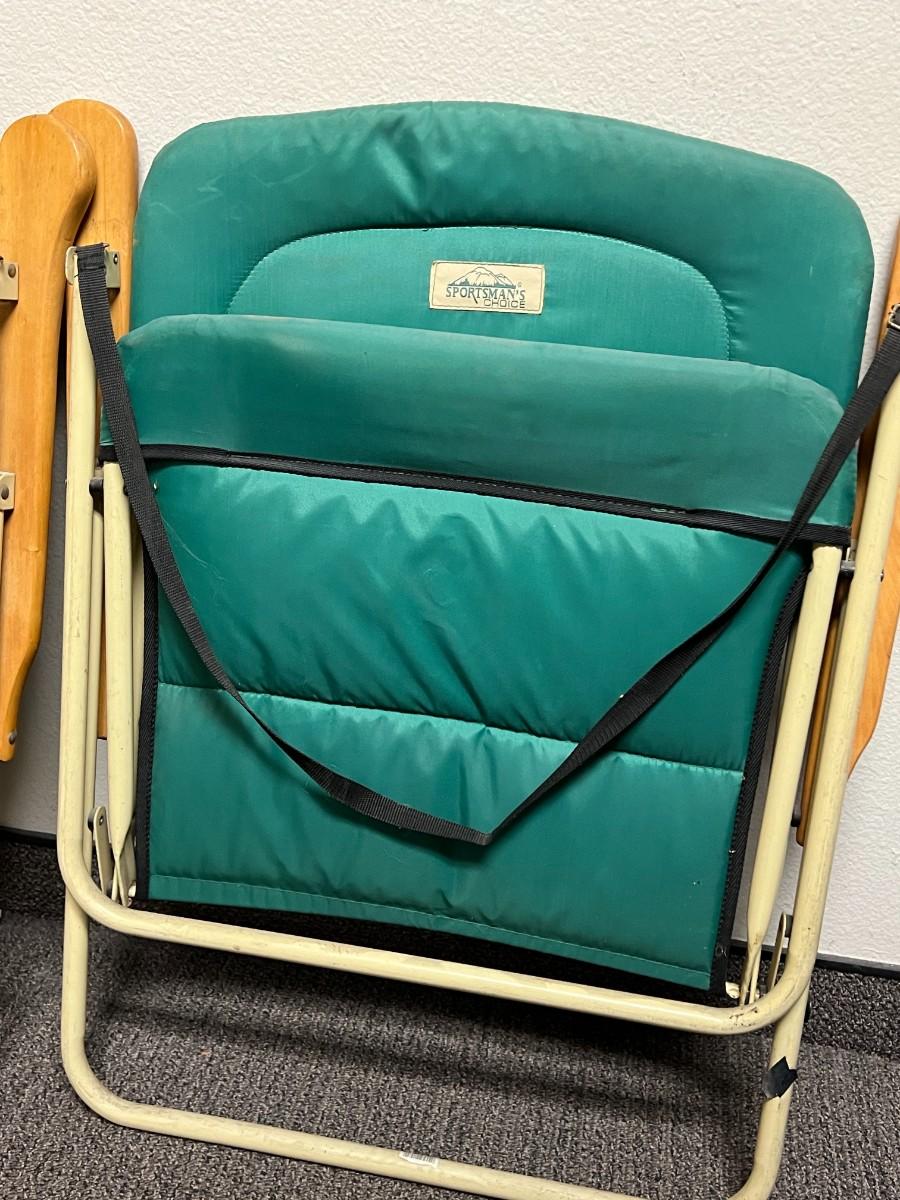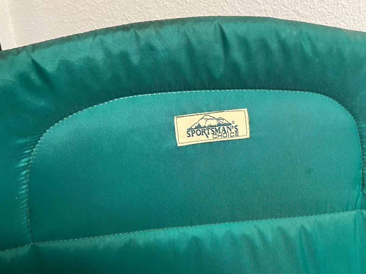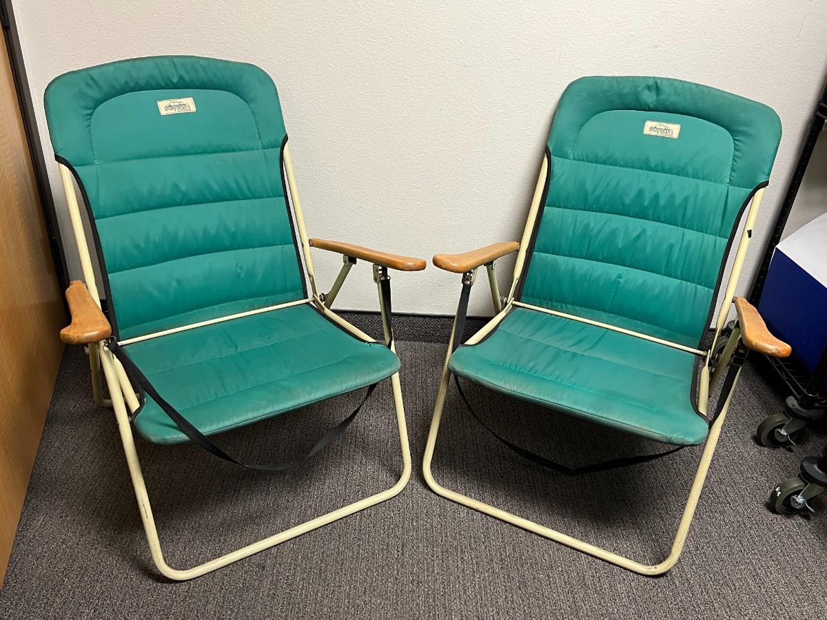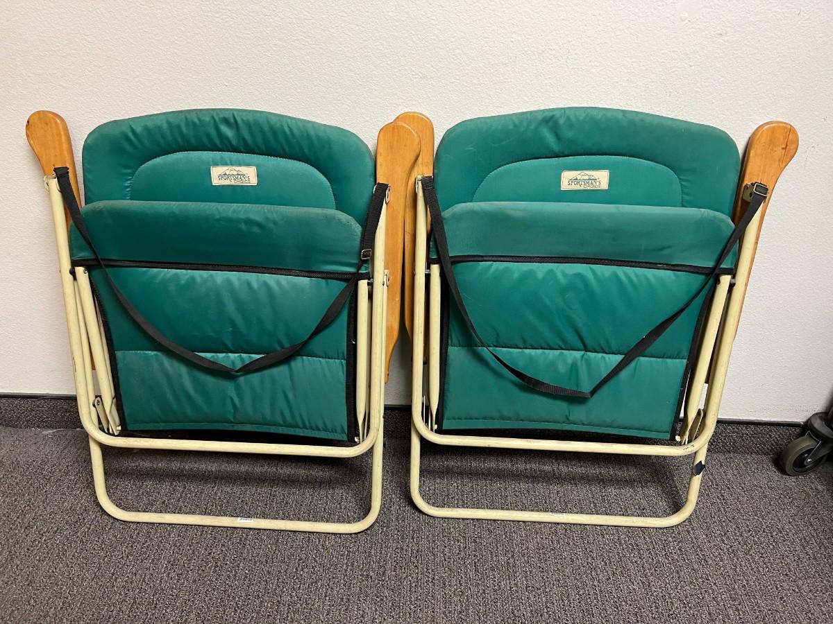 Pair of Green Sportsman's Choice Folding Camp Beach Chairs with Carry Strap. In good used condition. No holes, maybe light discoloration from age and storage. Fold easily.