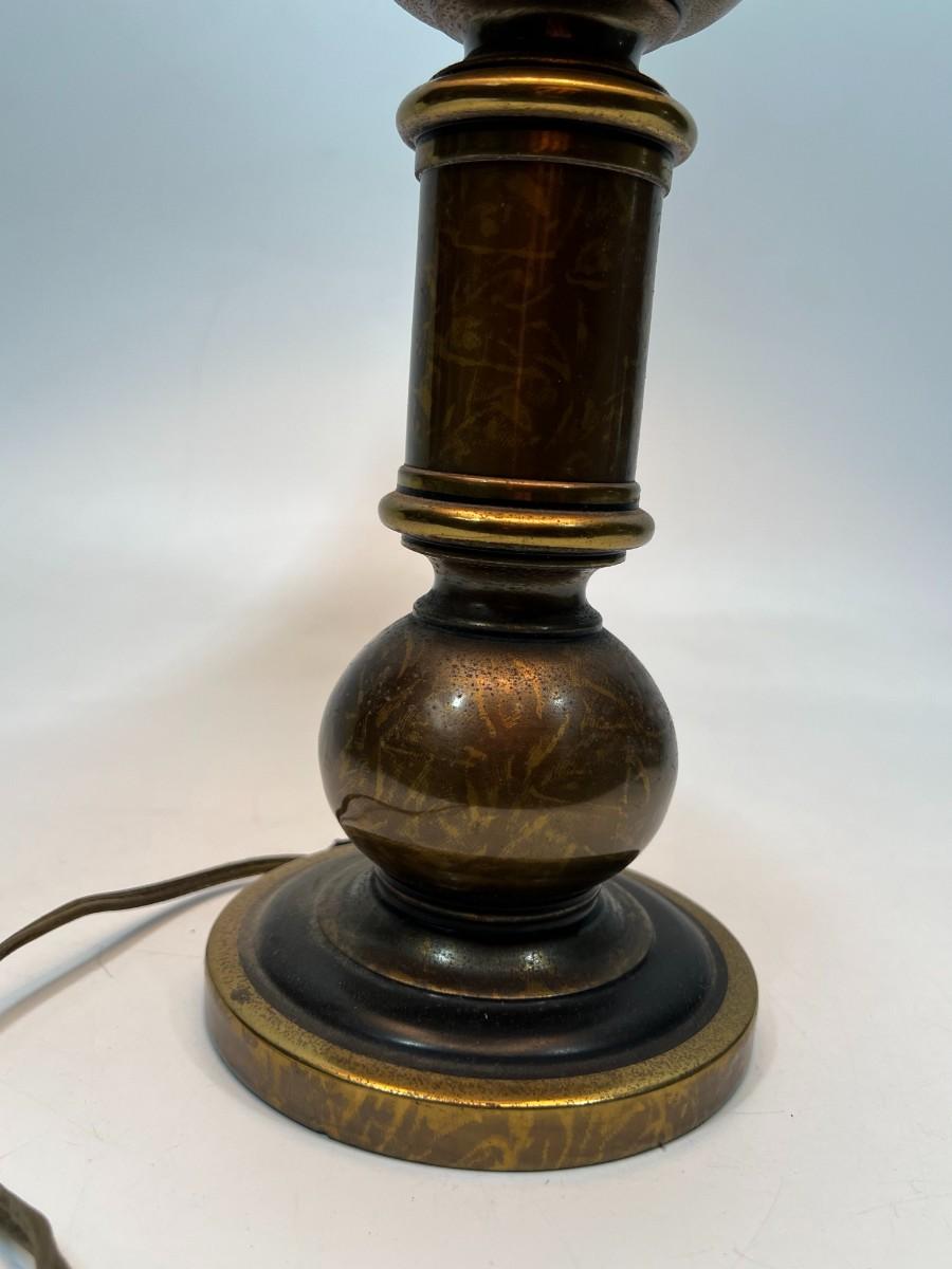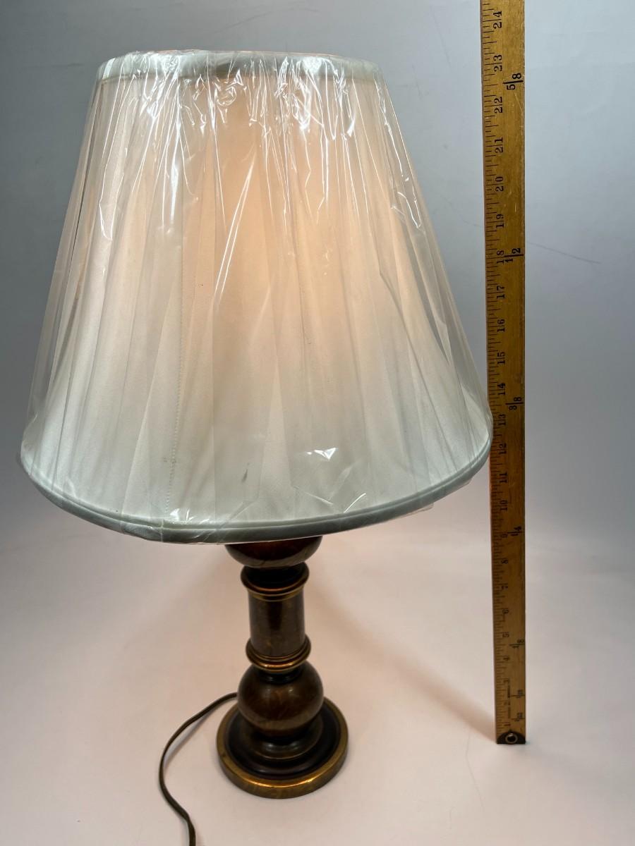 Vintage Brass Candlestick Style Table Lamp with Shade. Works. In vintage condition. About 24" size.