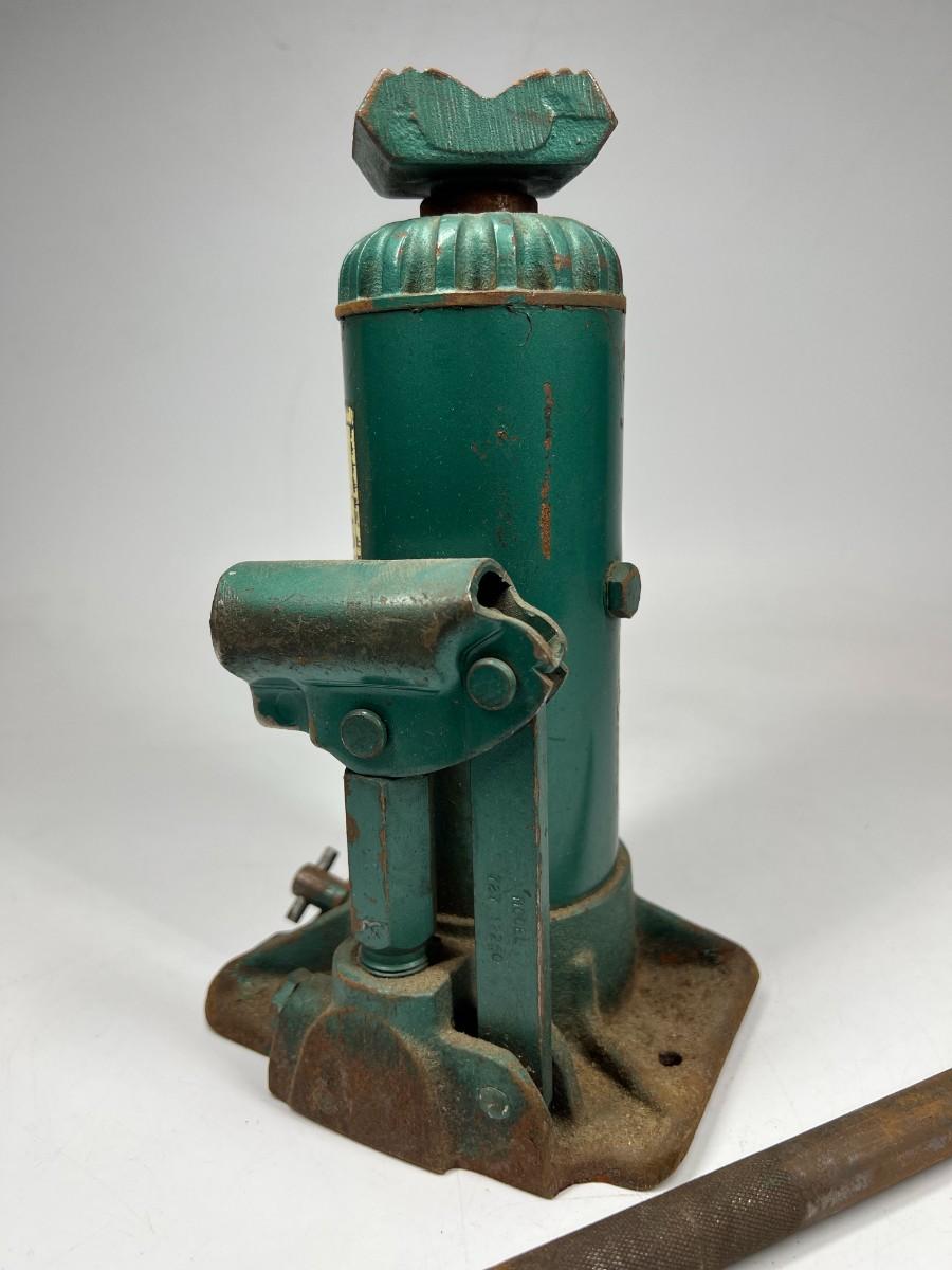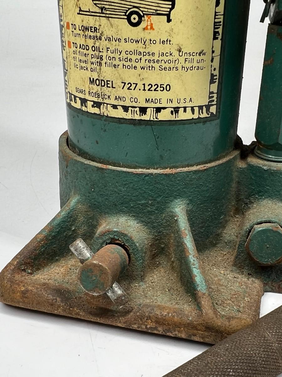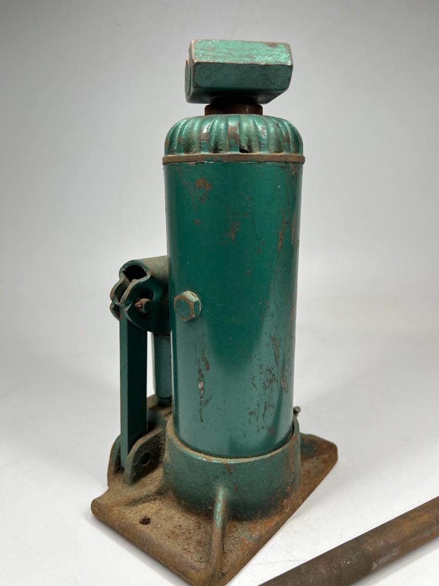 Vintage Green Sportsman's Trailer Jack Sears Bottle Jack. Vintage condition. Displays great.