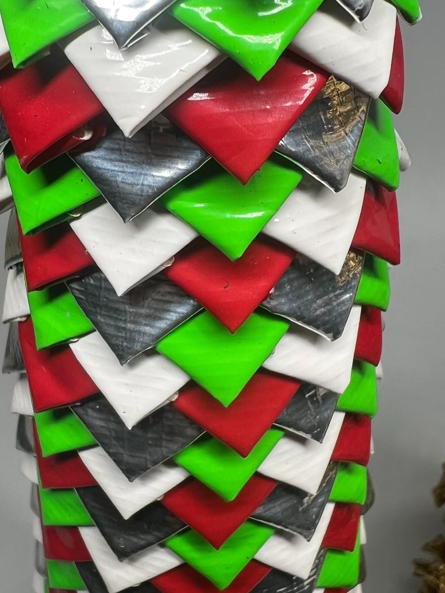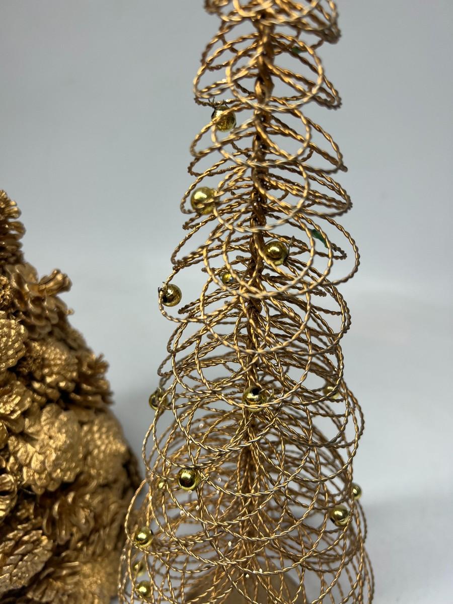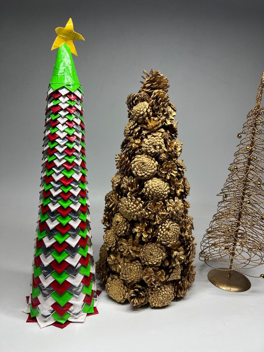 Lot of Tall Thin Christmas Tree Decorative Decor Duct Tape Crafted, Gold Spray Painted Pinecones, & Metal Wire Tree