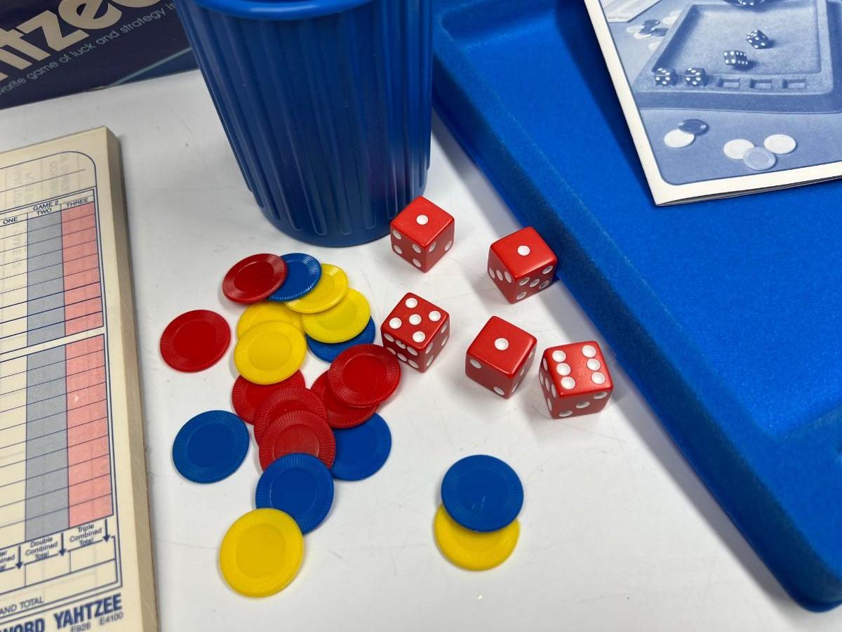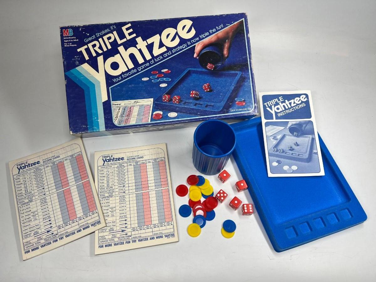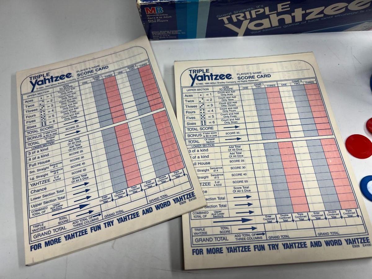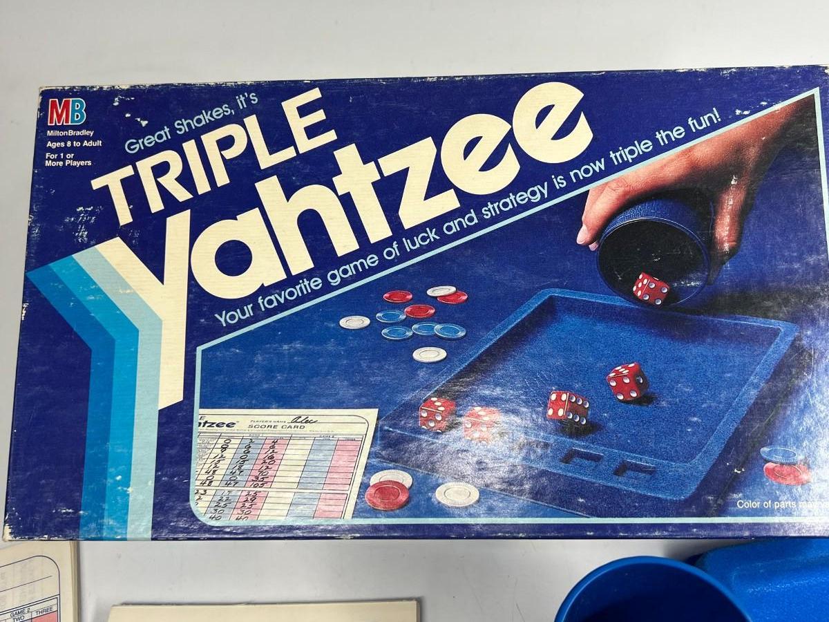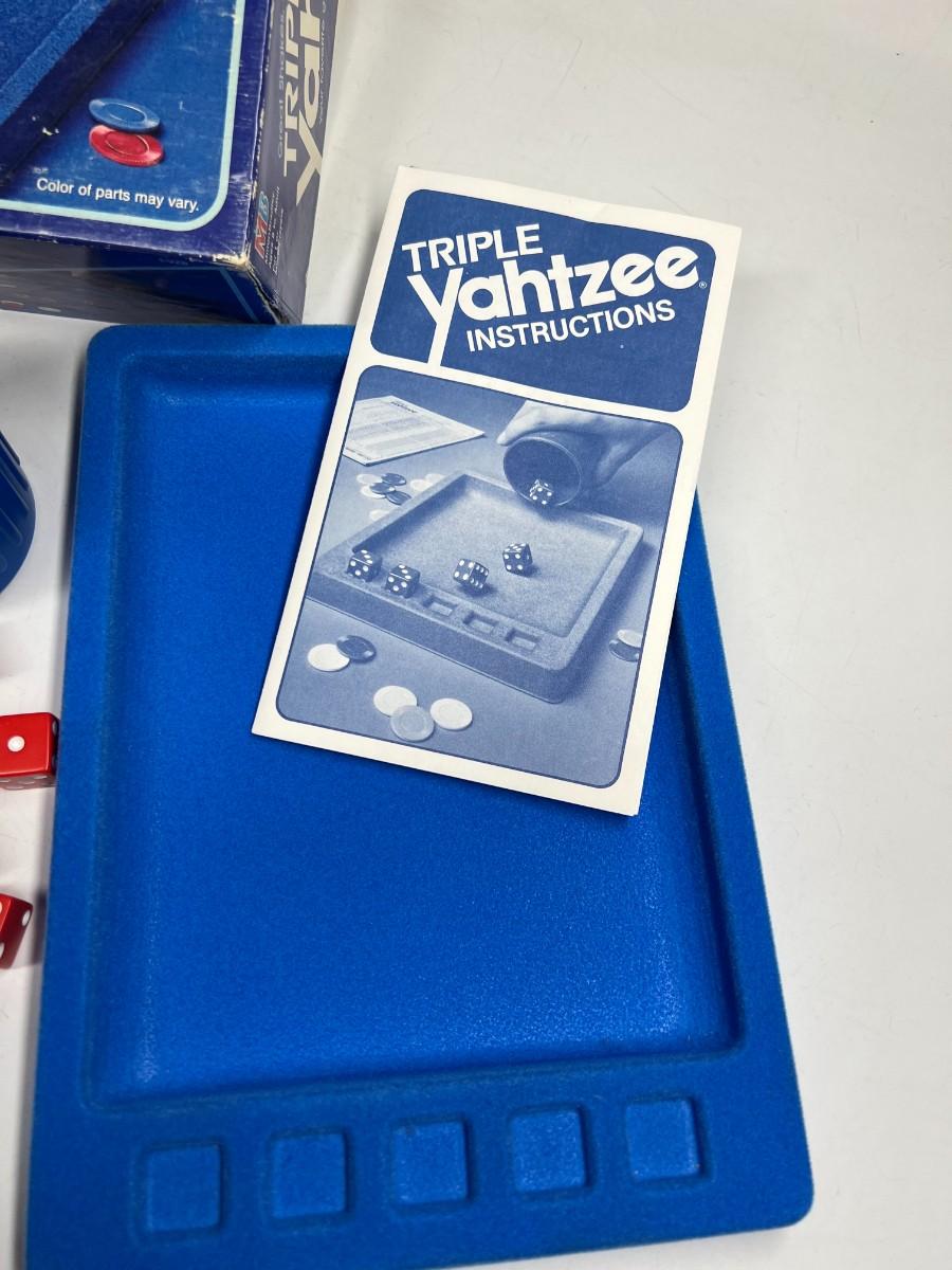 Retro Triple Yahtzee Dice Game. Good condition. Blue cup and dice board.