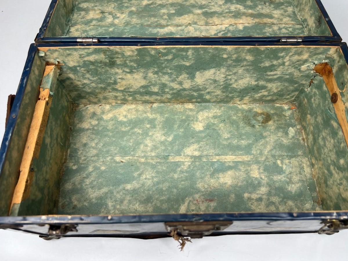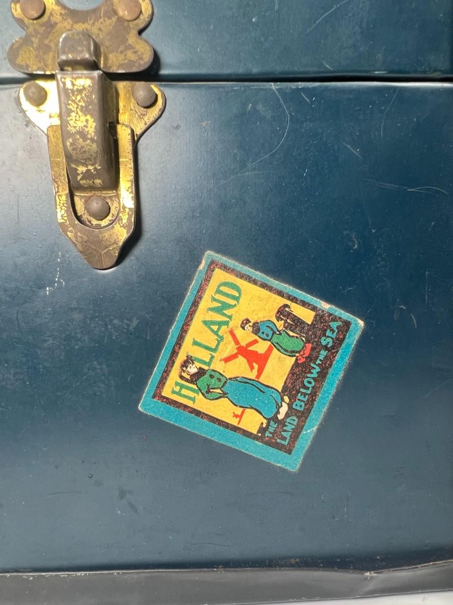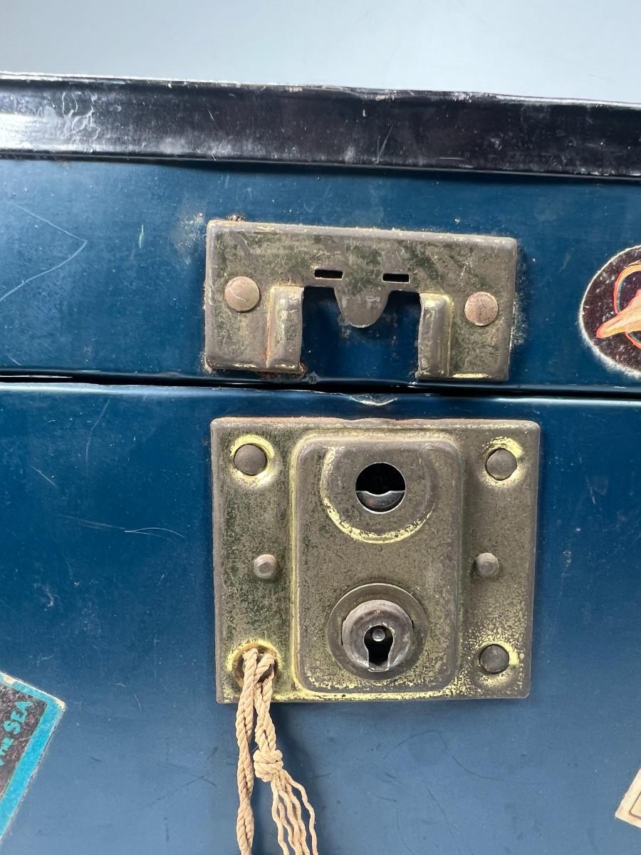 There is noticeable vintage wear all over the box, but there is no significant damage and is in overall fair condition. The lock latch is broken, check pictures for more details and for sizing.