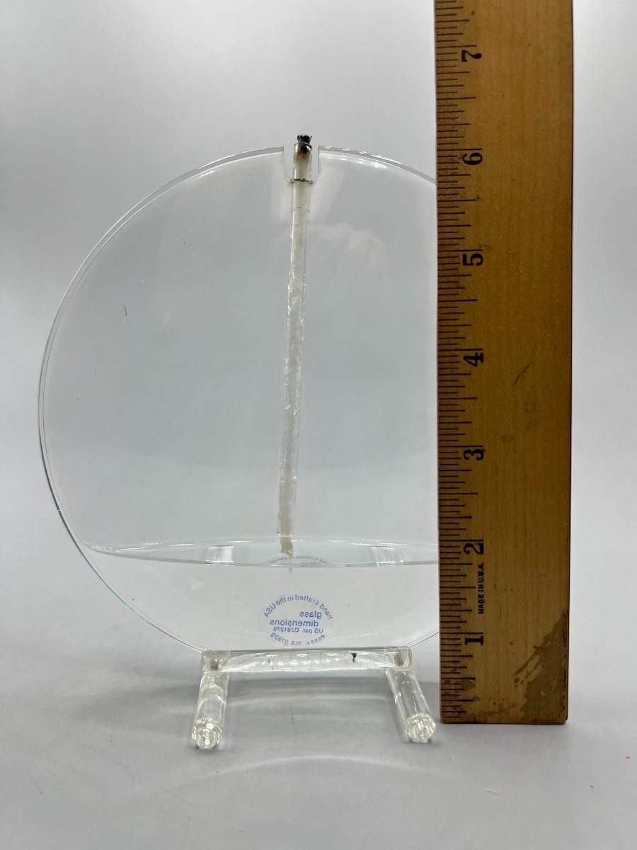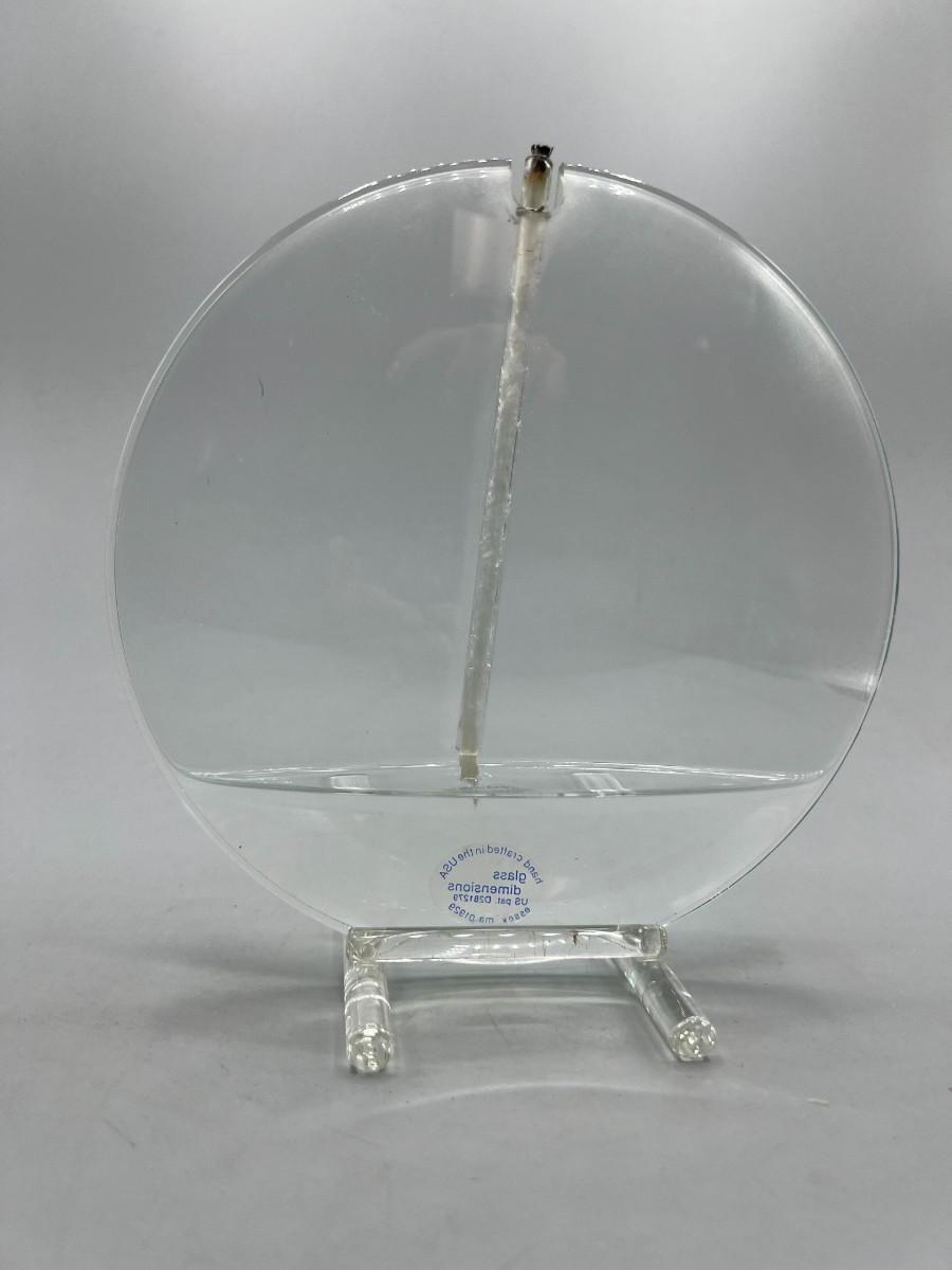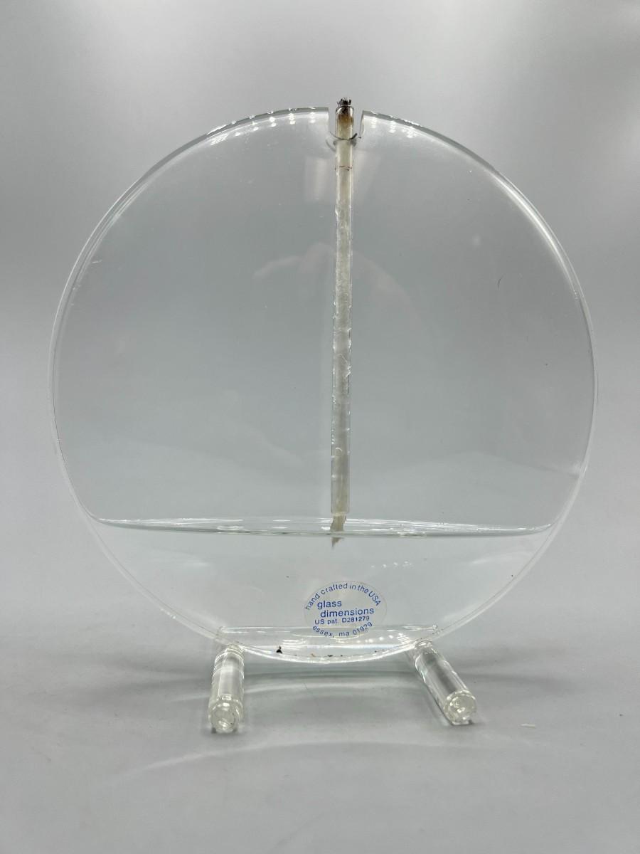 Hand Crafted Glass Dimensions Round Disc Oil Lamp. In good condition. Has oil in it. About 6" size.