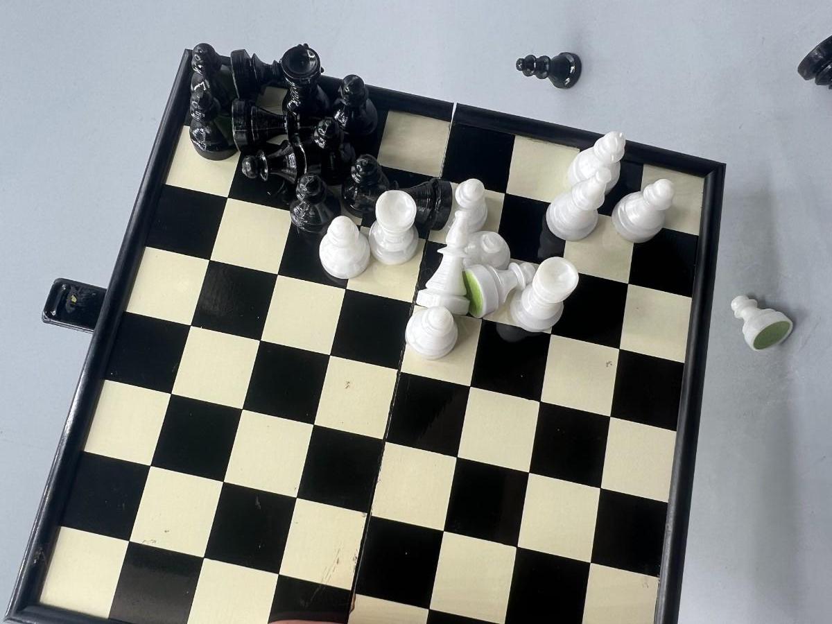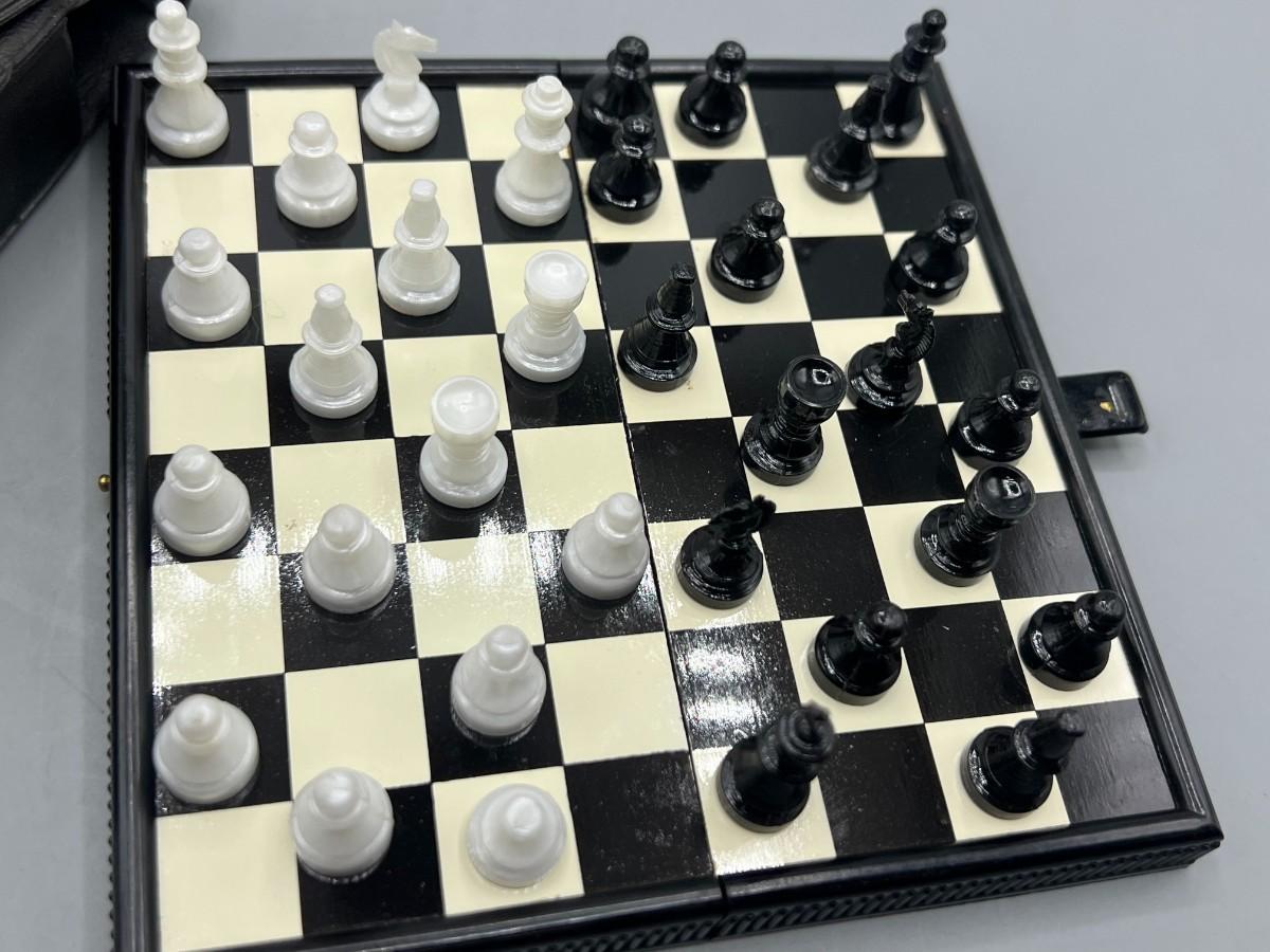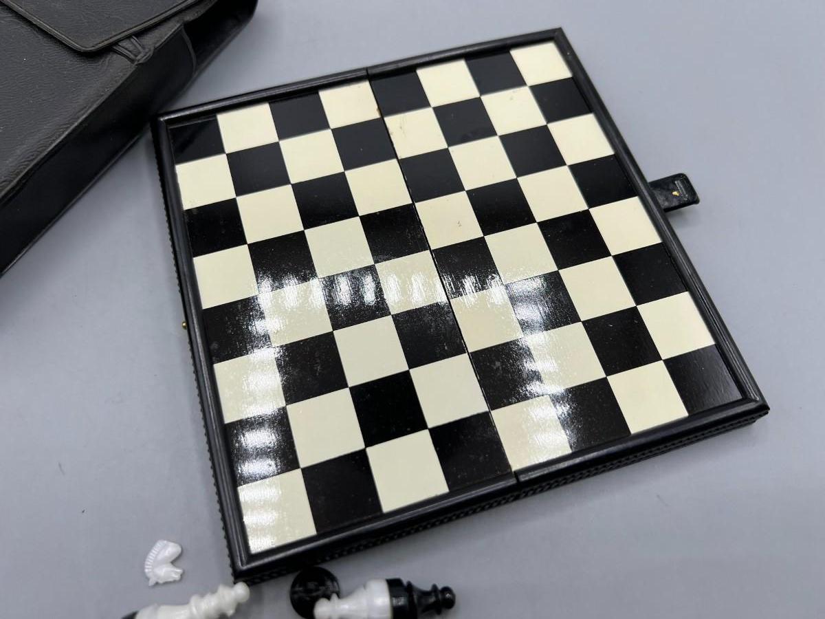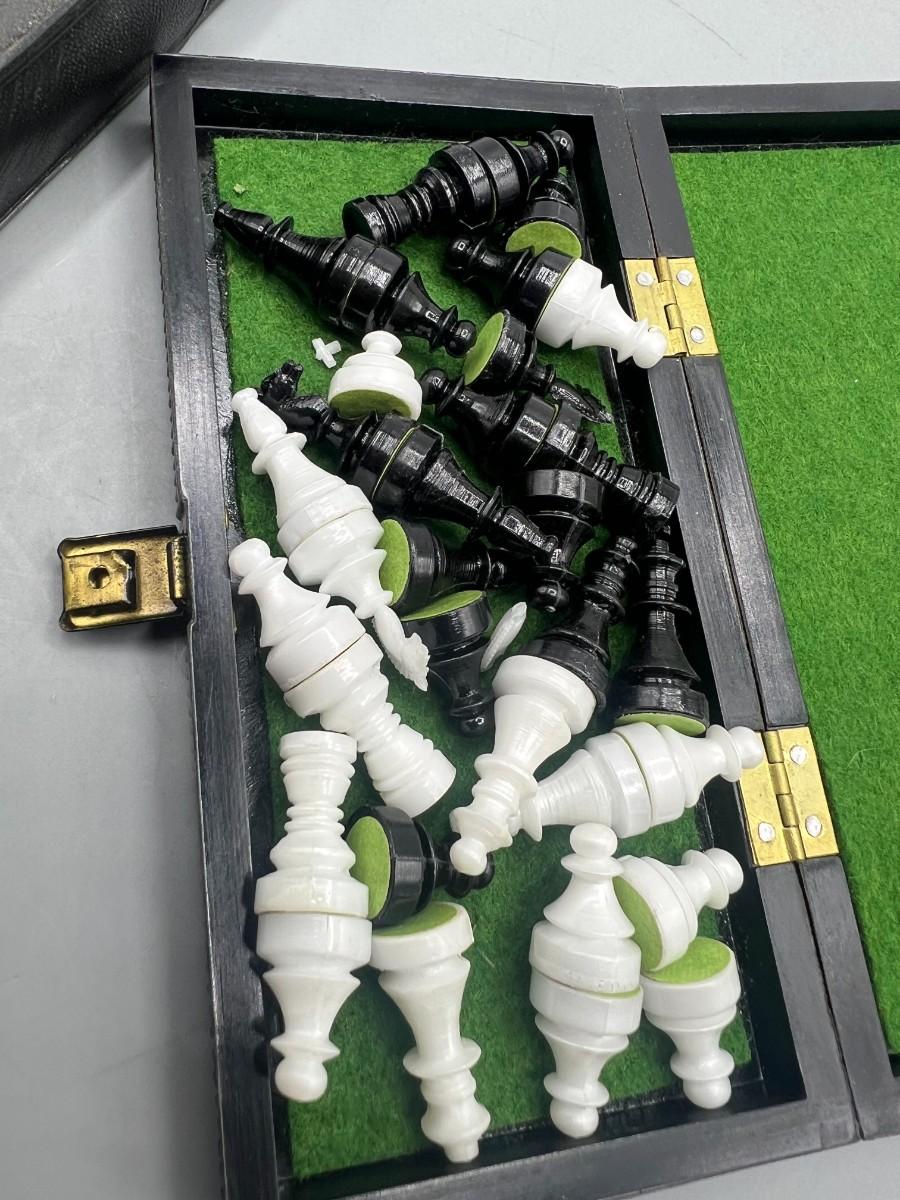 Vintage Pocket Size Travel Chess Set with Carry Case. In vintage condition. Looks complete but there is a broken knight piece.
