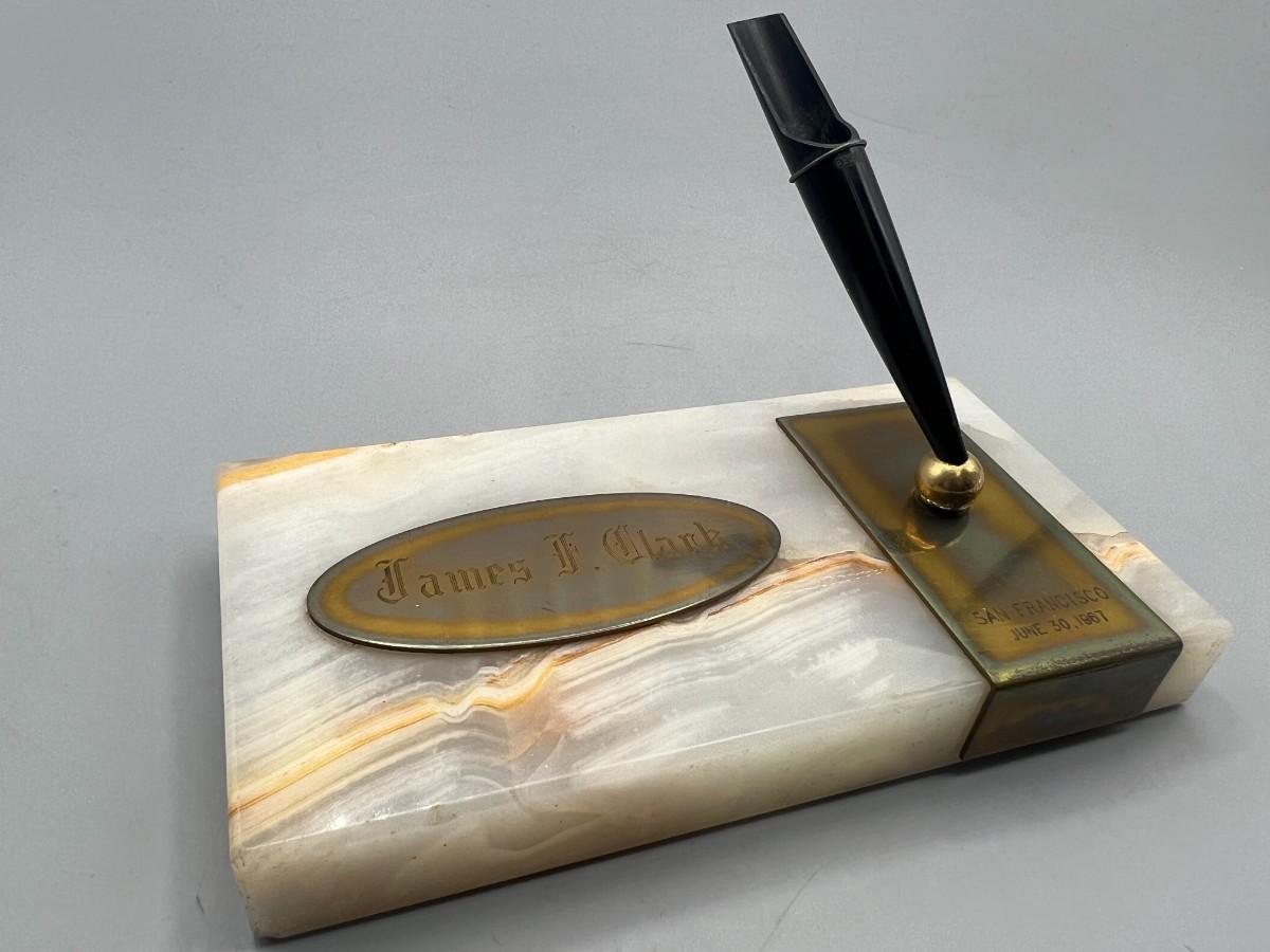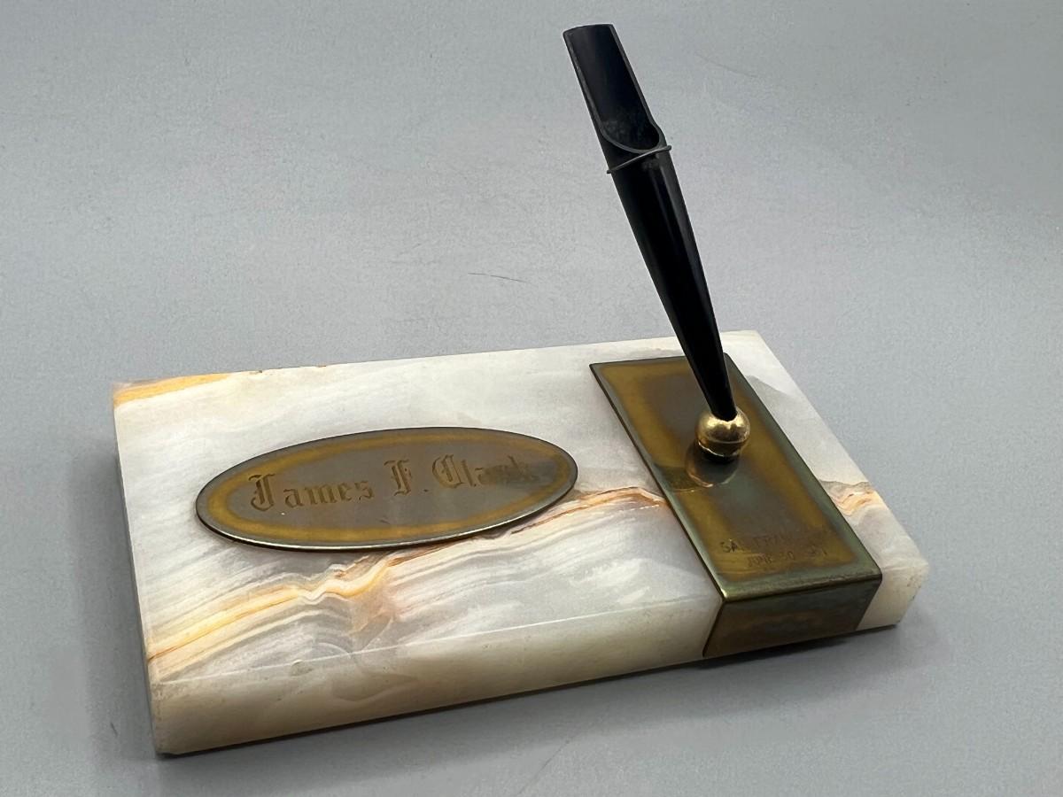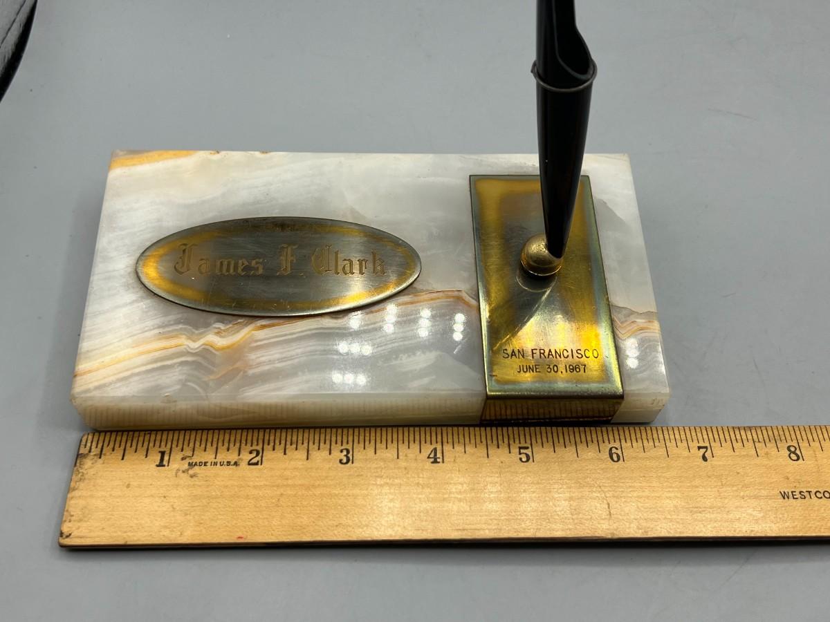 Vintage Personalized Marble Desktop Pen Holder San Francisco 1967. In good condition. Has previous owners name on plaque separate from dated part, may be able to remove.