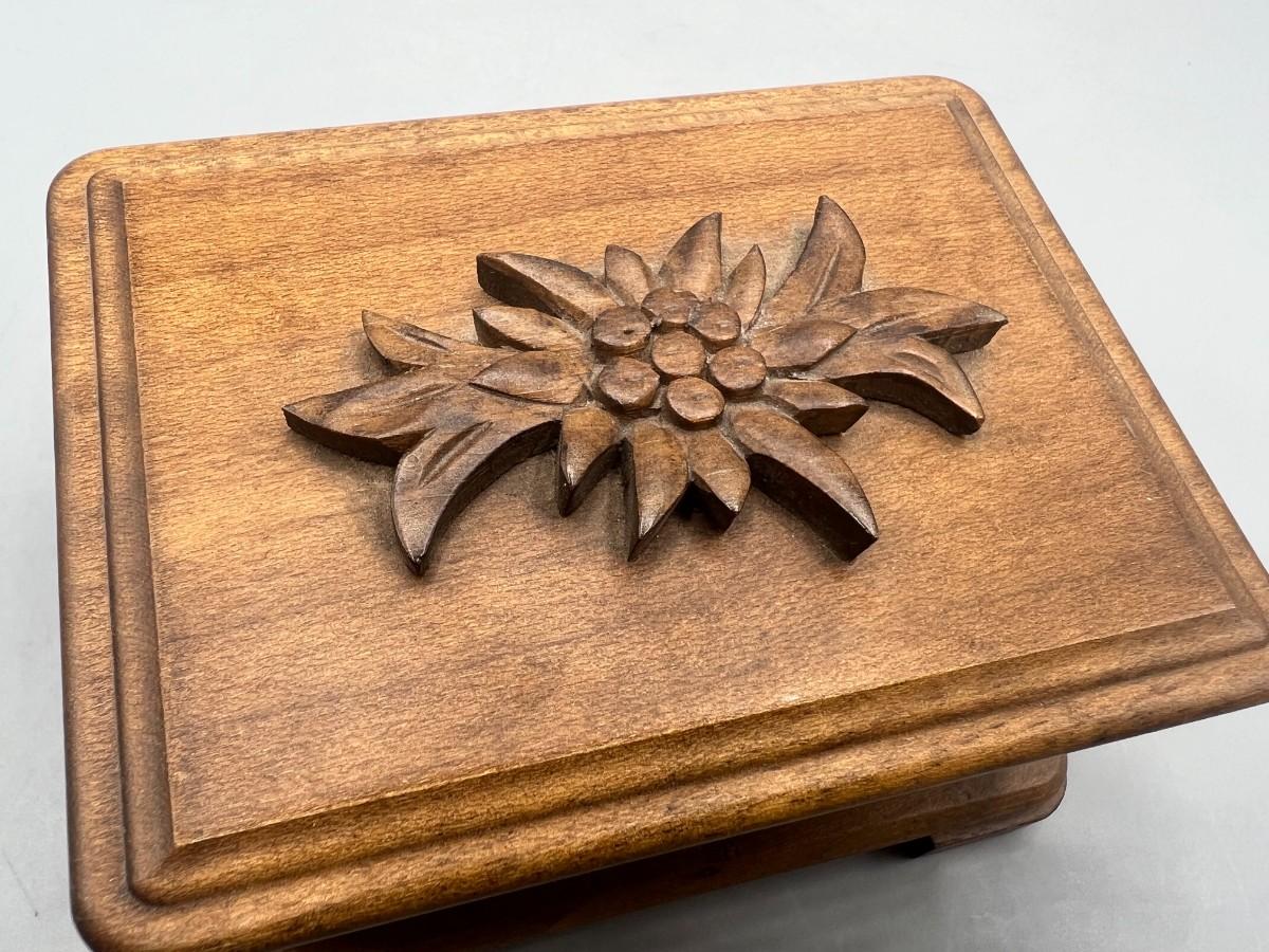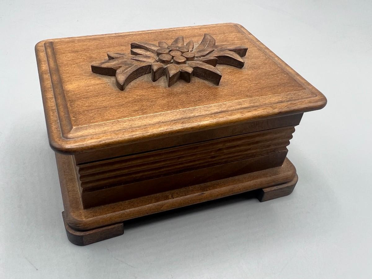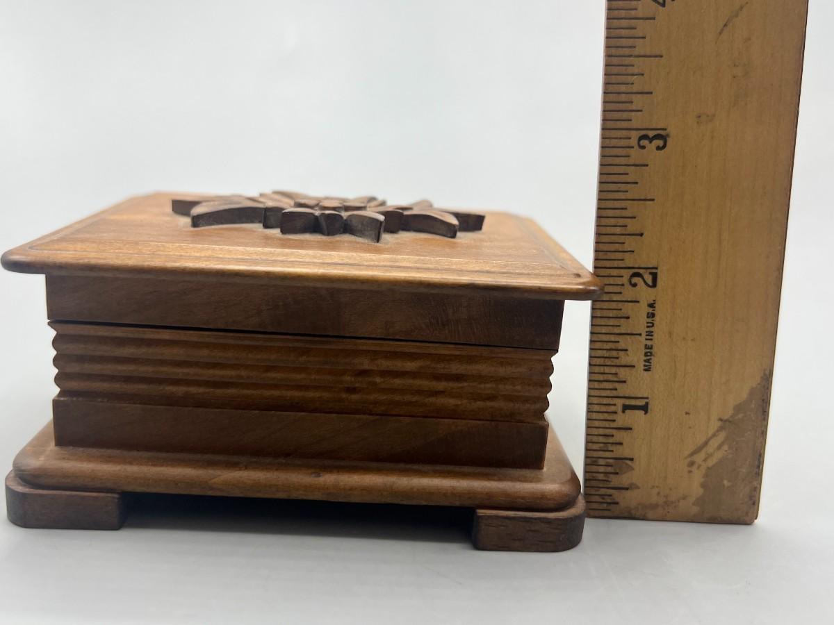 Small Carved Wood Trinket Jewelry Box Flower Top Design