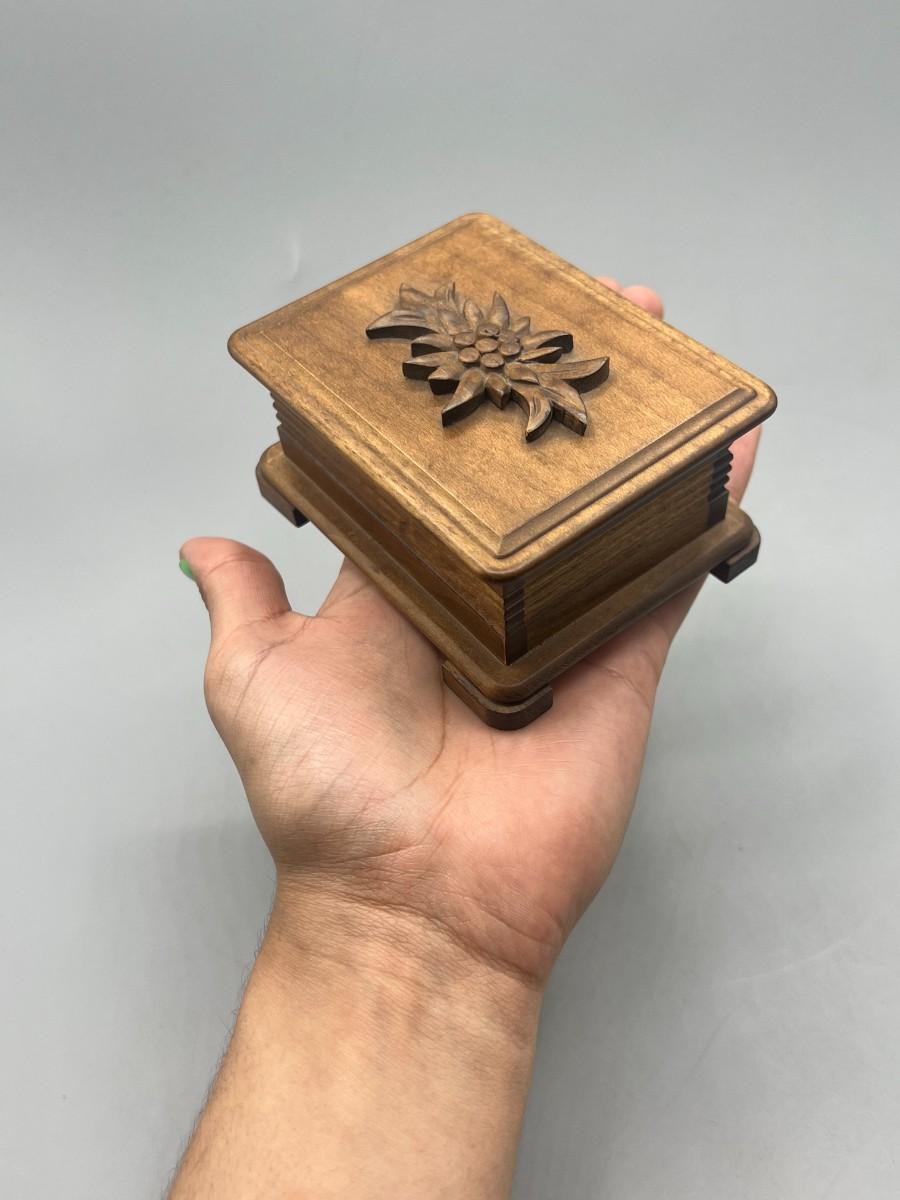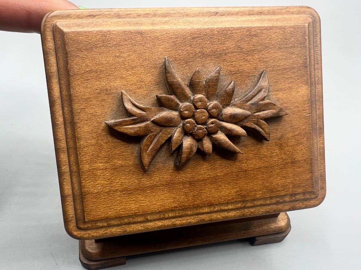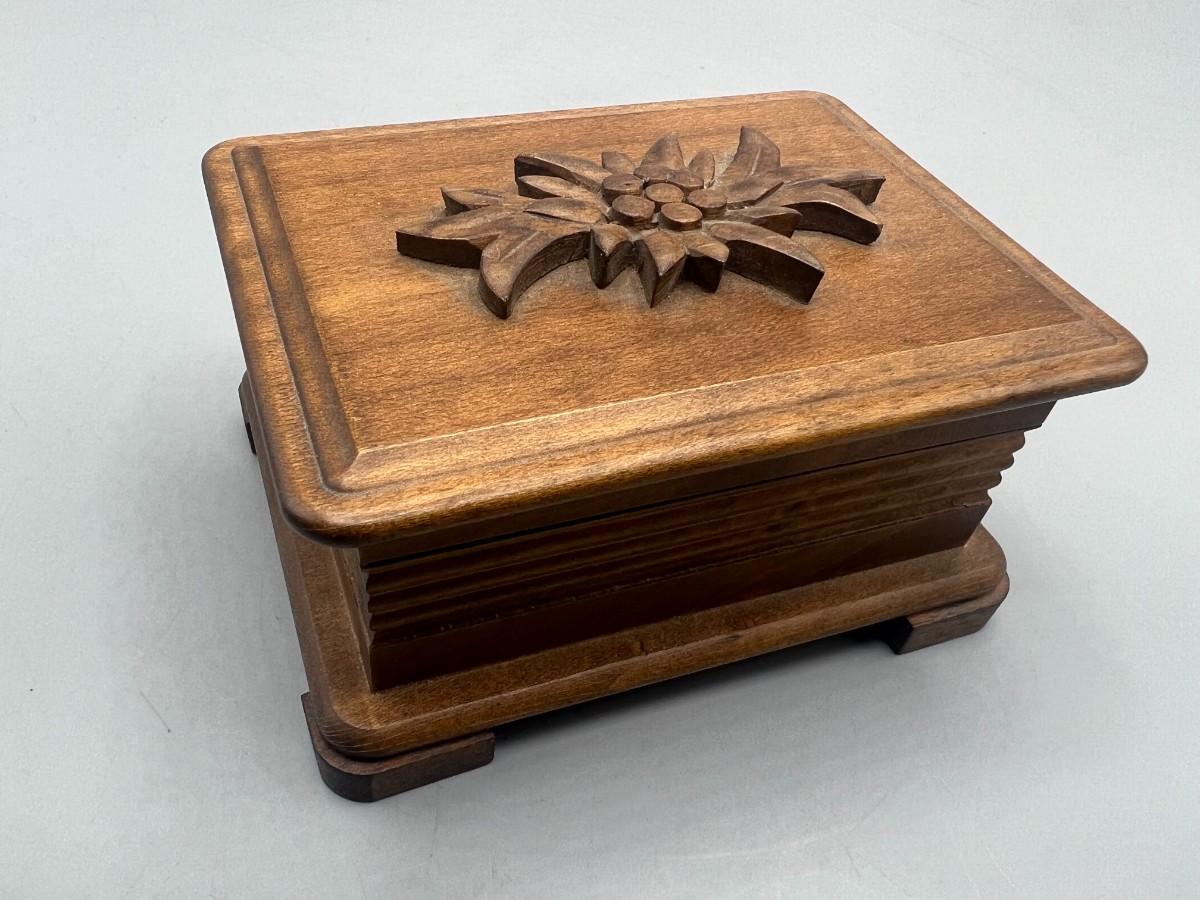 Small Carved Wood Trinket Jewelry Box Flower Top Design