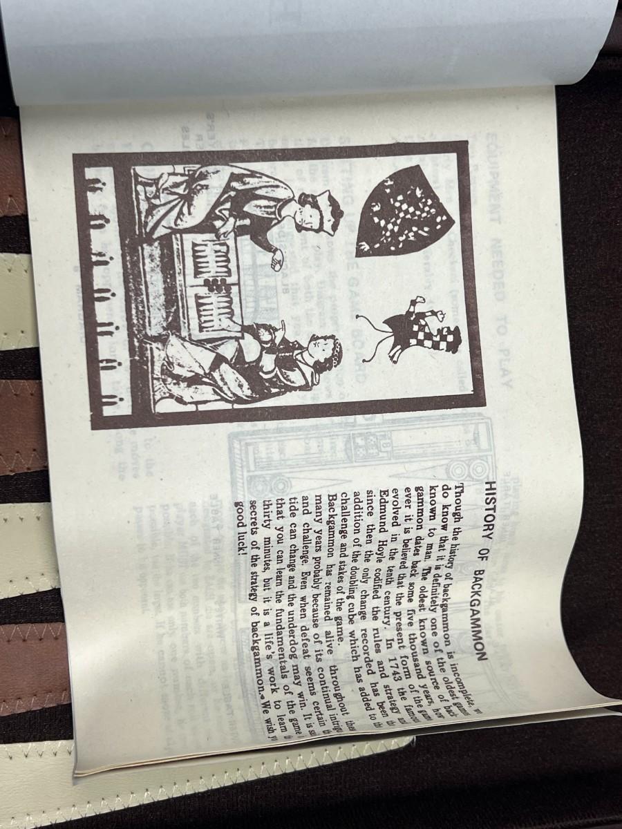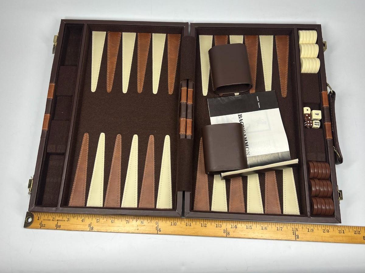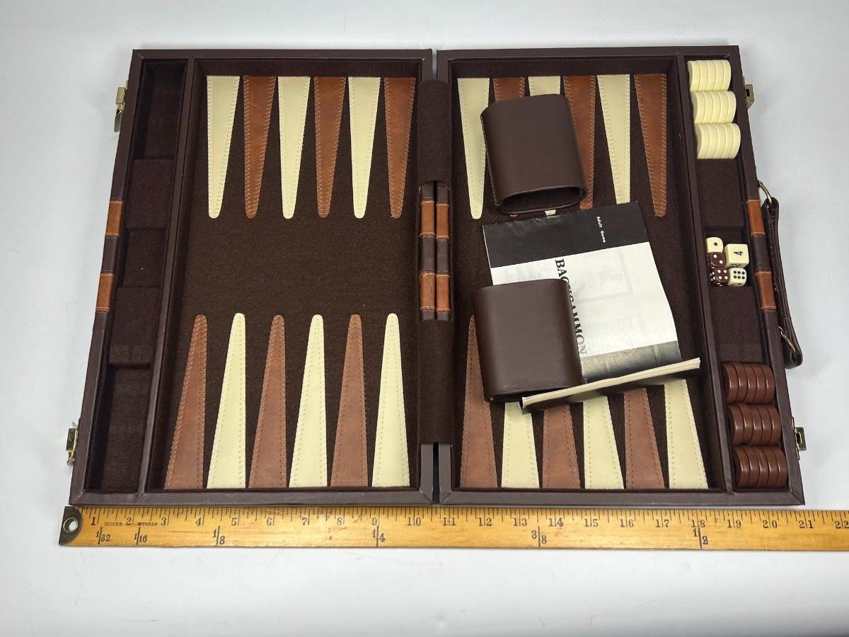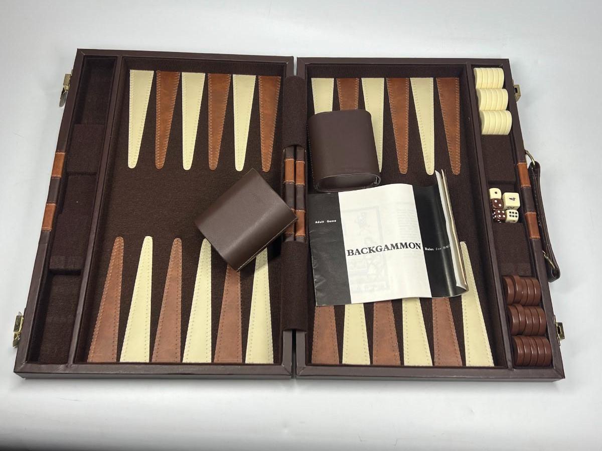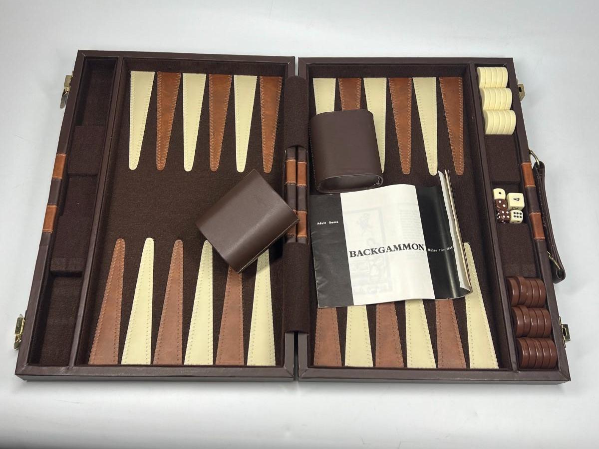 Retro Traditional Brown and White Backgammon Game Set in Carry Case. In good condition. Has instruction booklet and original cardboard shipper box. May be unused.