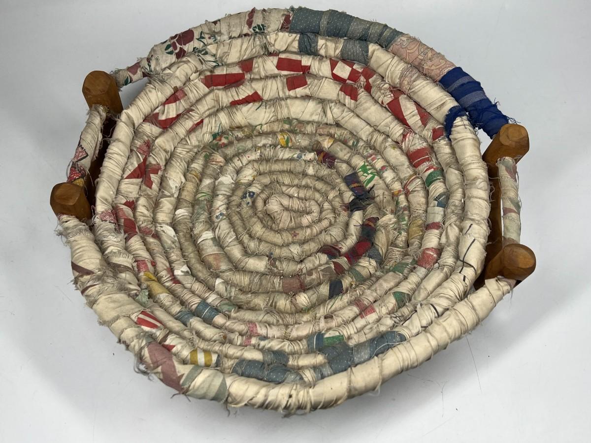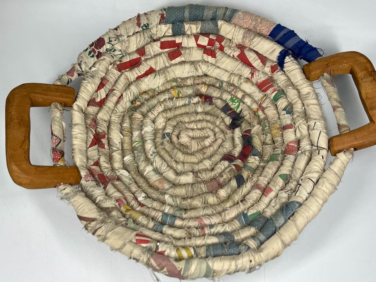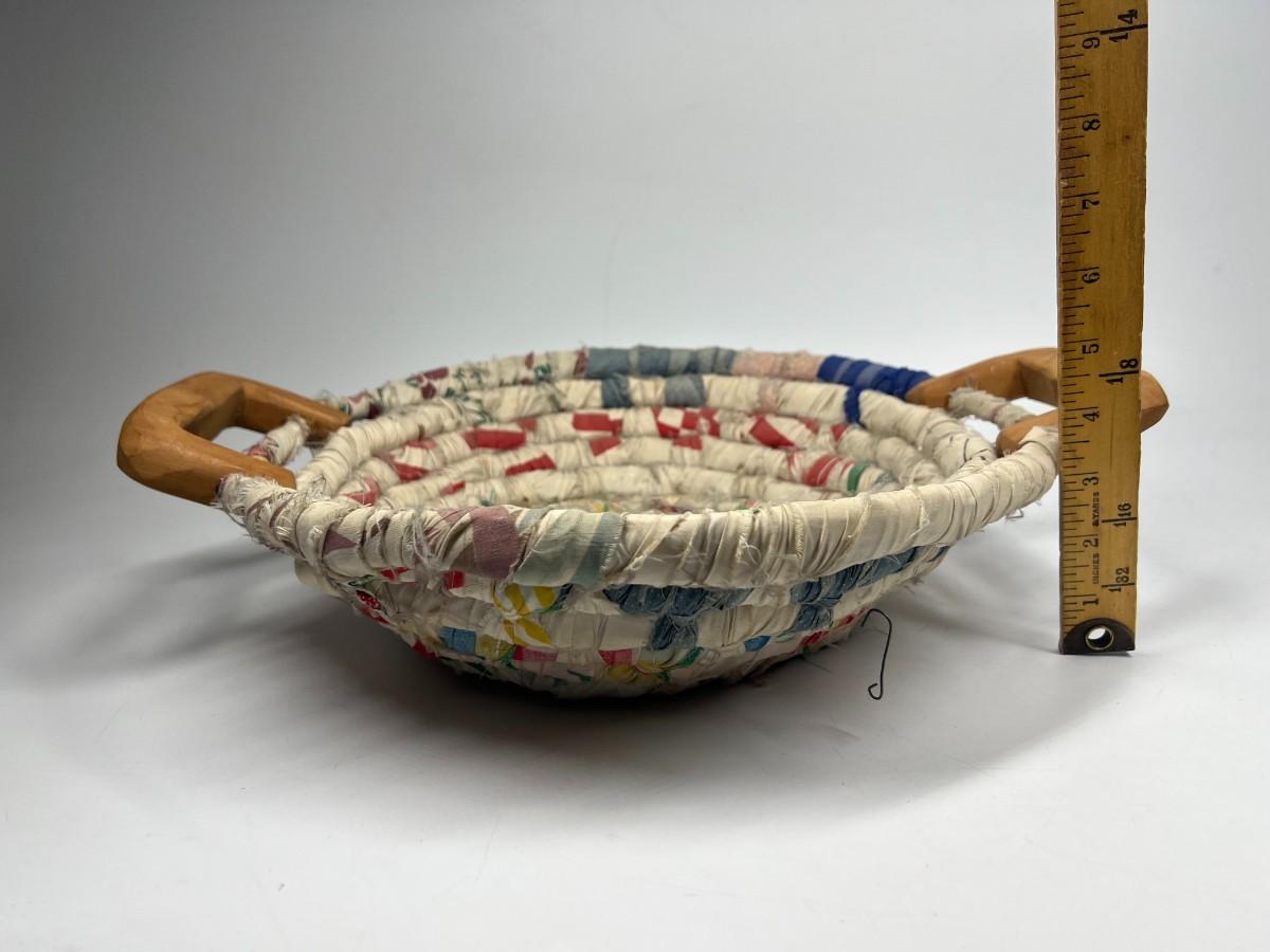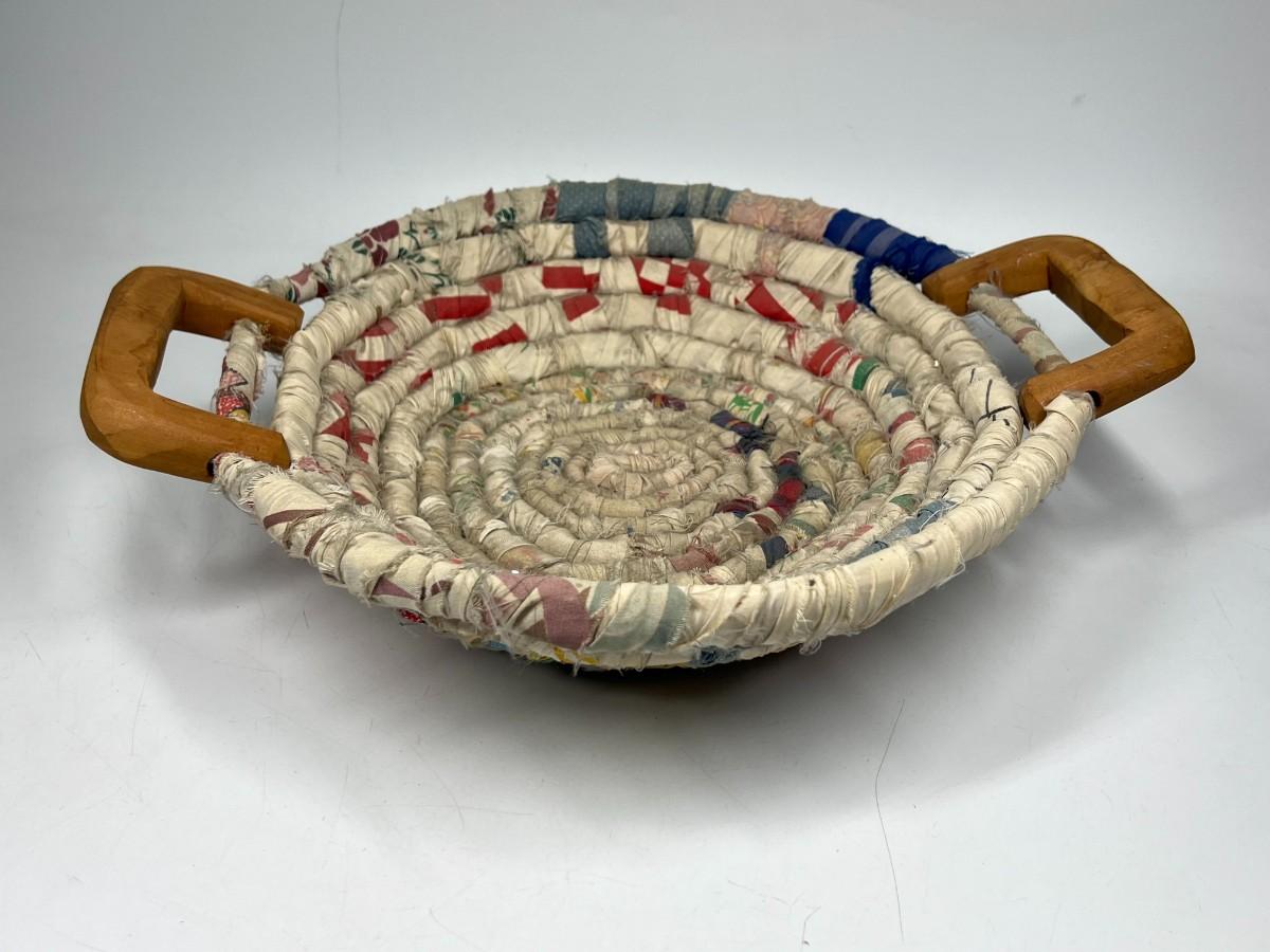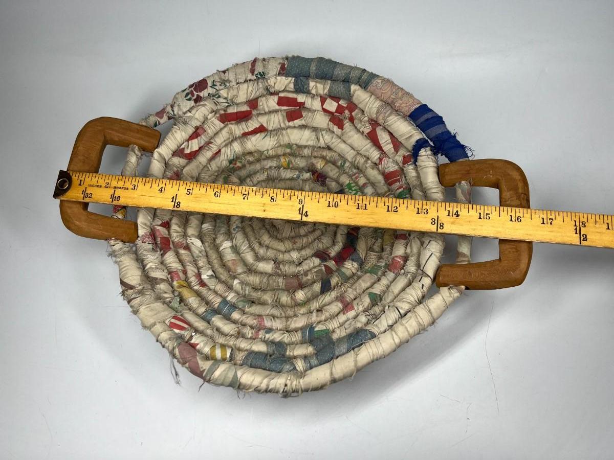 Vintage Retro Boho Twisted Braided Rag Rug Style Basket with Wood Handles