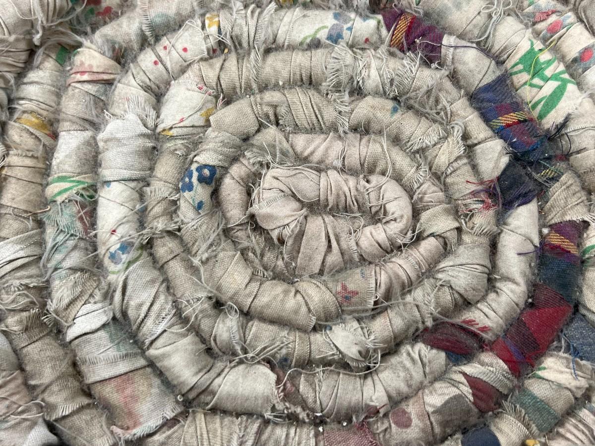 Vintage Retro Boho Twisted Braided Rag Rug Style Basket with Wood Handles. In vintage used condition. Looks a bit dusty, may be able to wash.