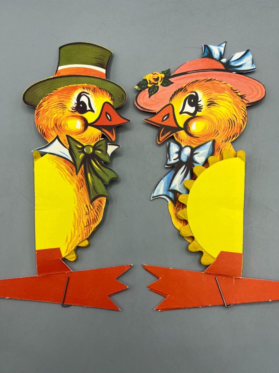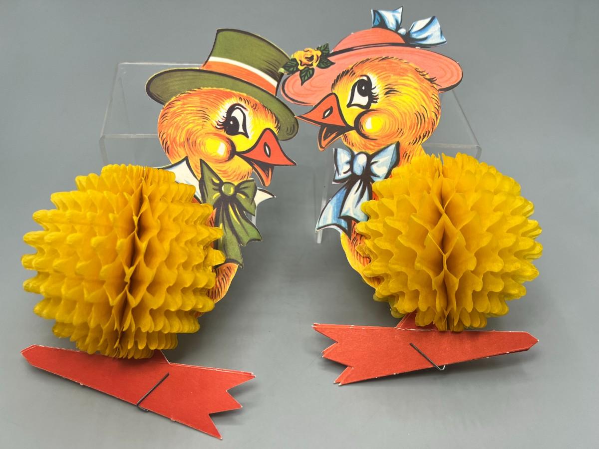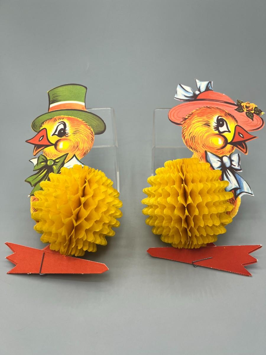 Pair of Vintage Honeycomb Spring Mr. & Mrs. Duck Chick Hanging Paper Centerpieces