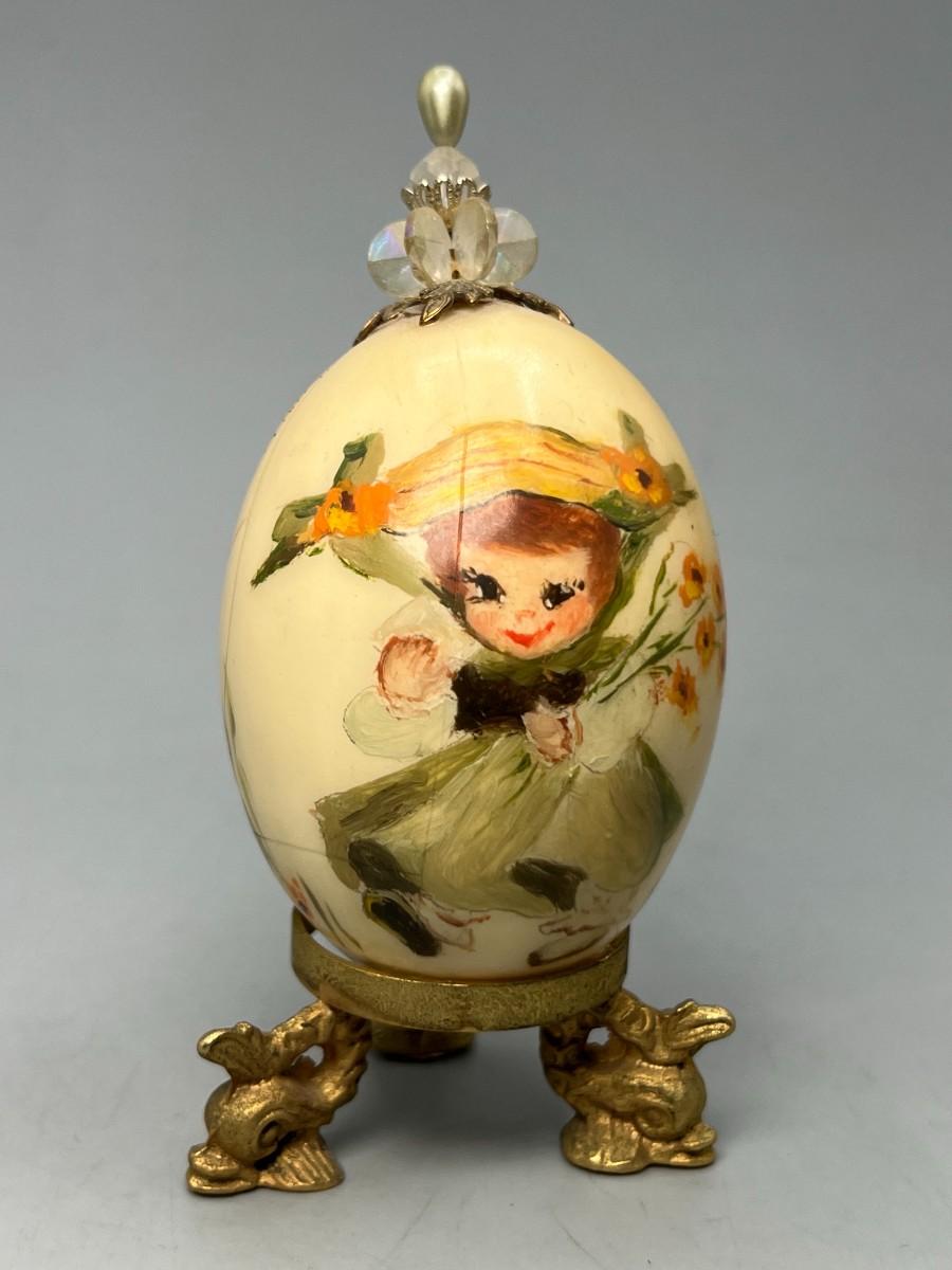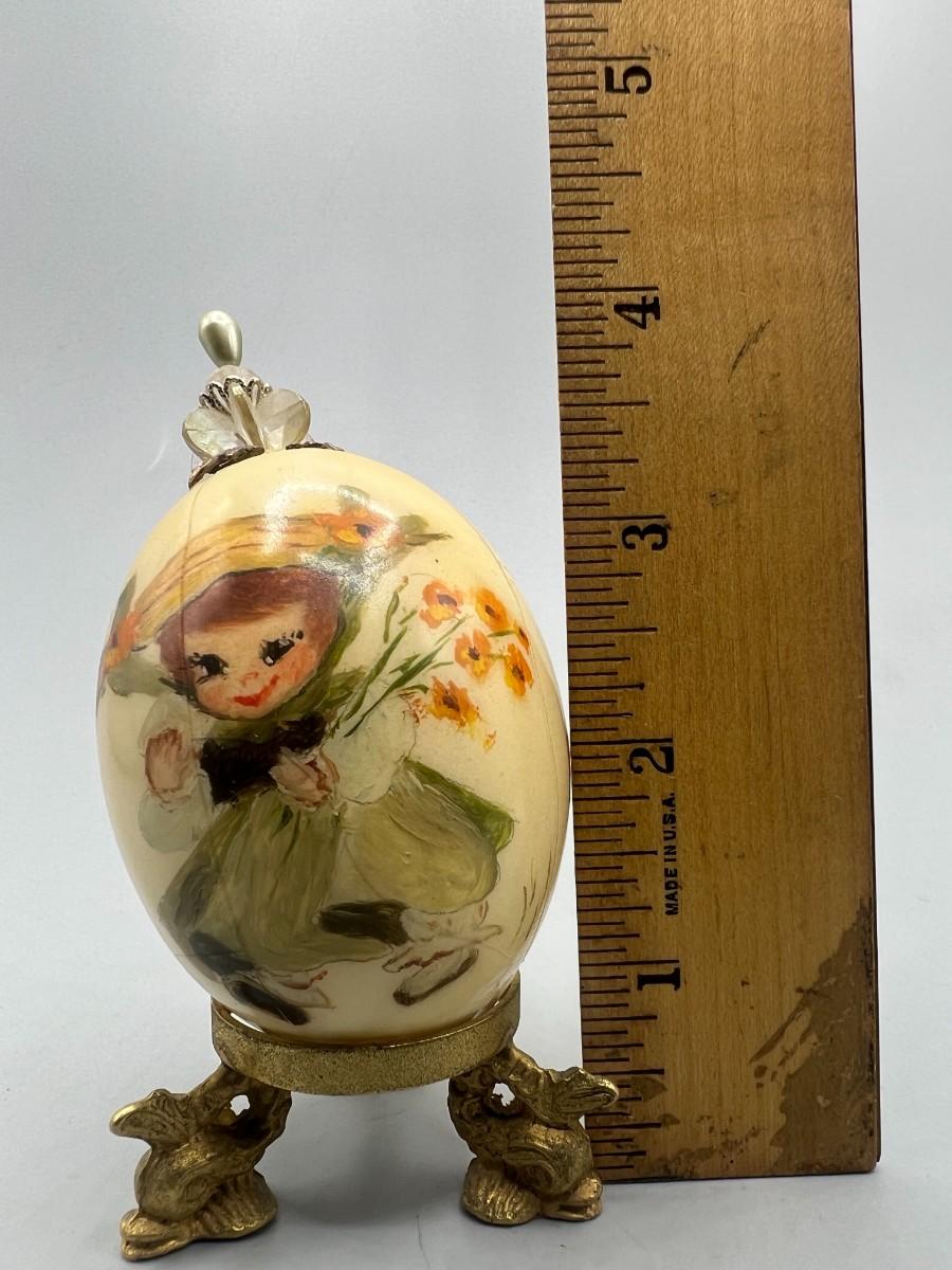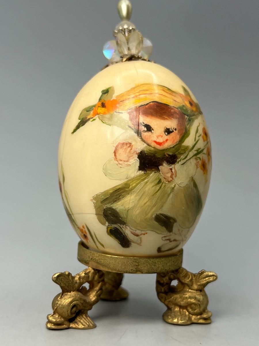Vintage Egg Shell Art Mid Century Style Woman with Flowers & Egg Stand
