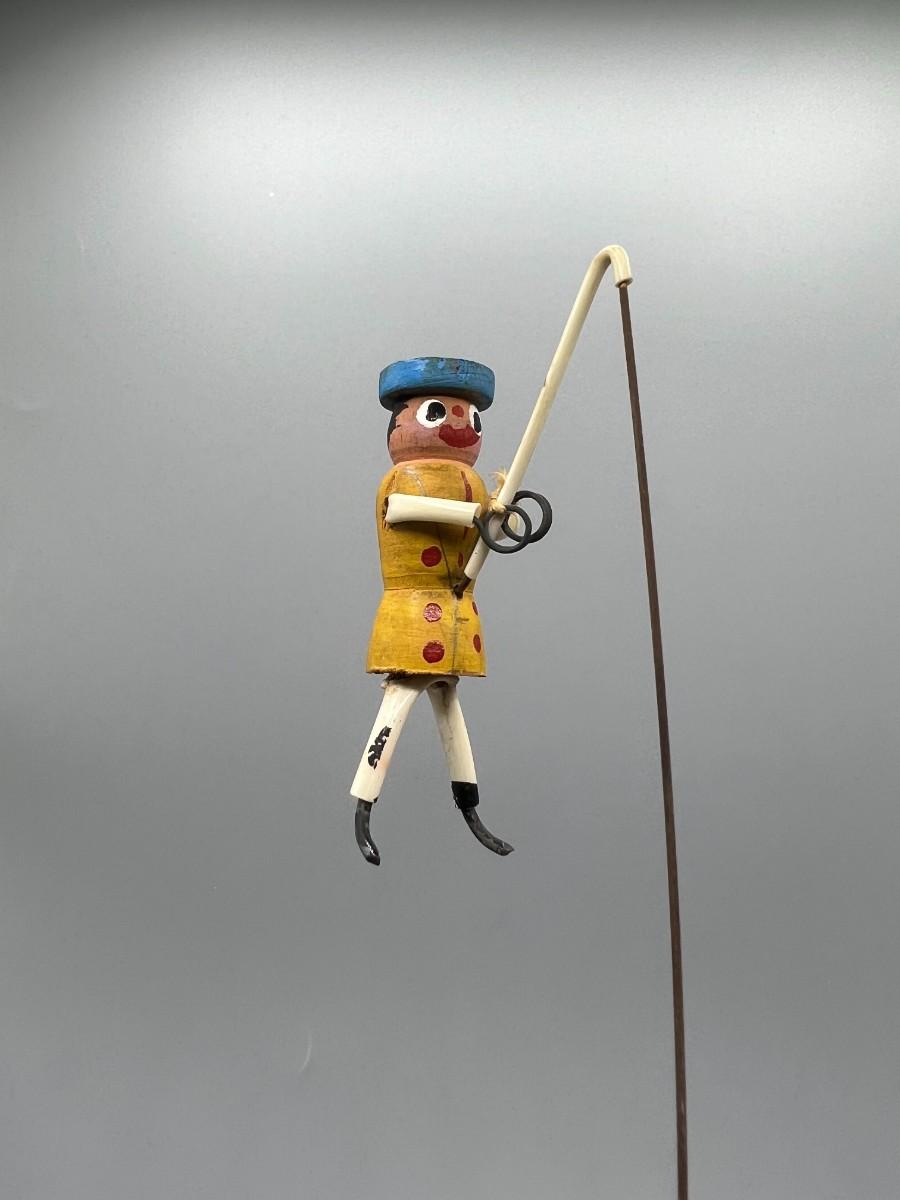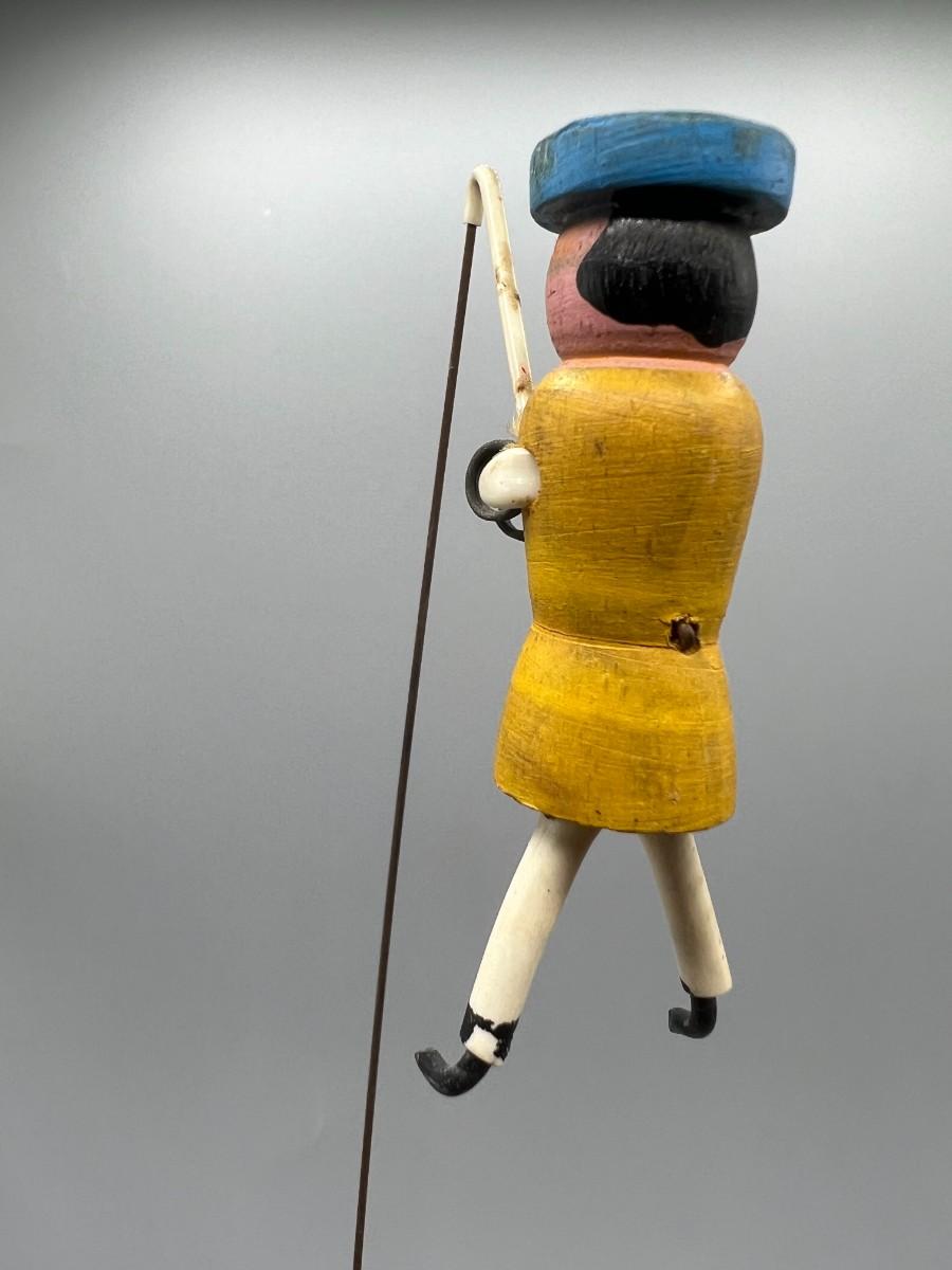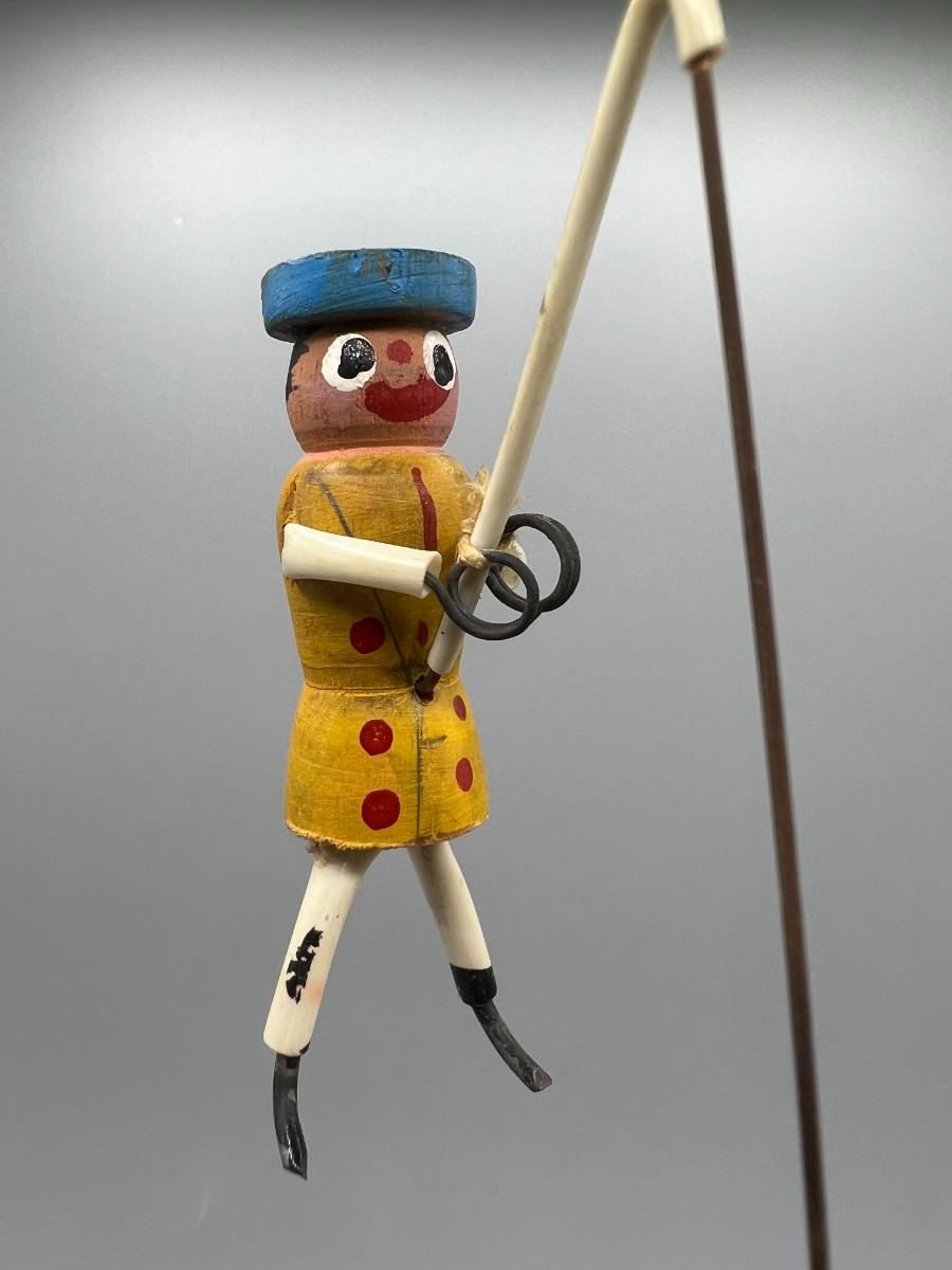 Vintage Folkart Carved Wood & Metal Little Figurine Fishing Balancing Shelf Sitter