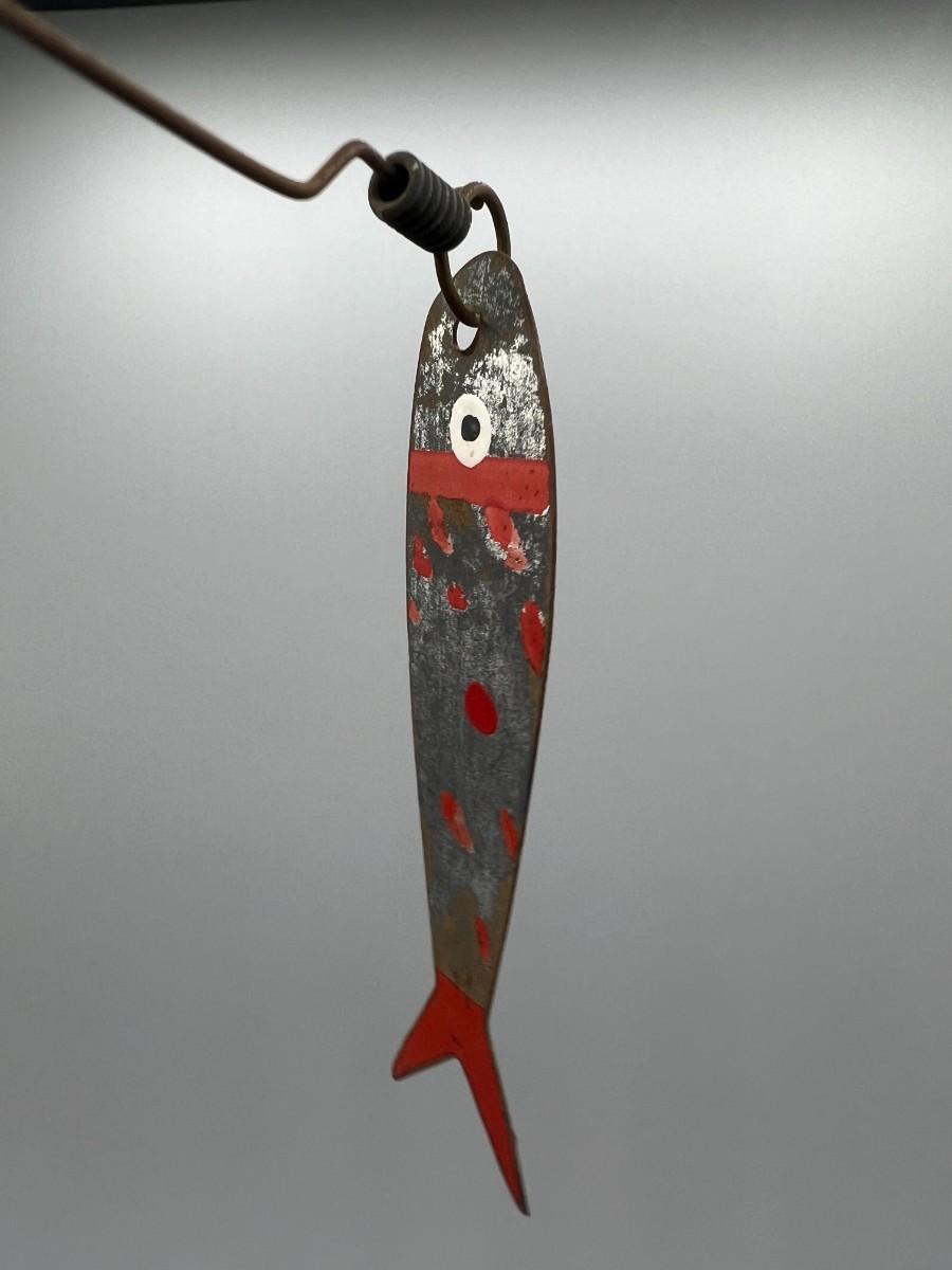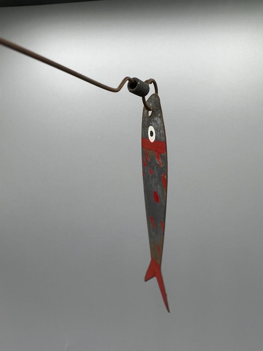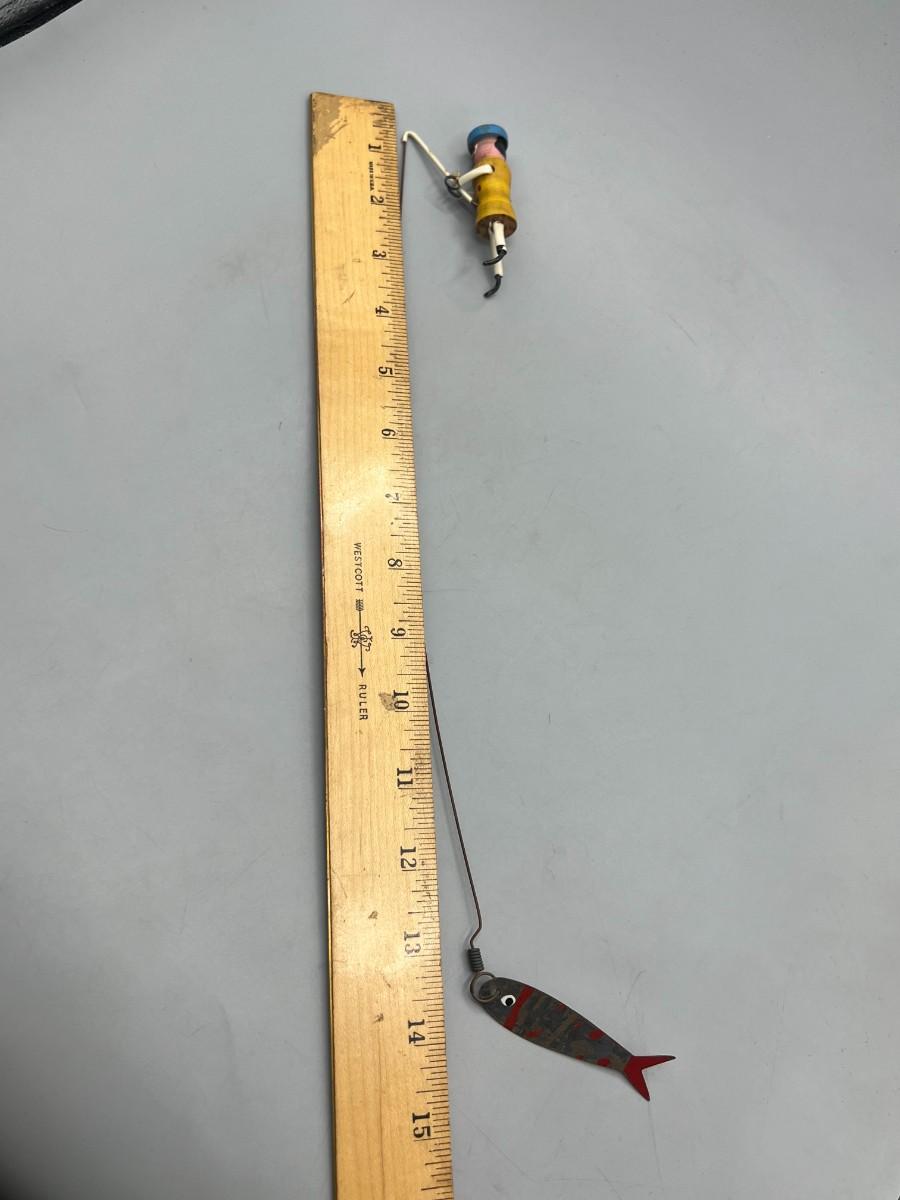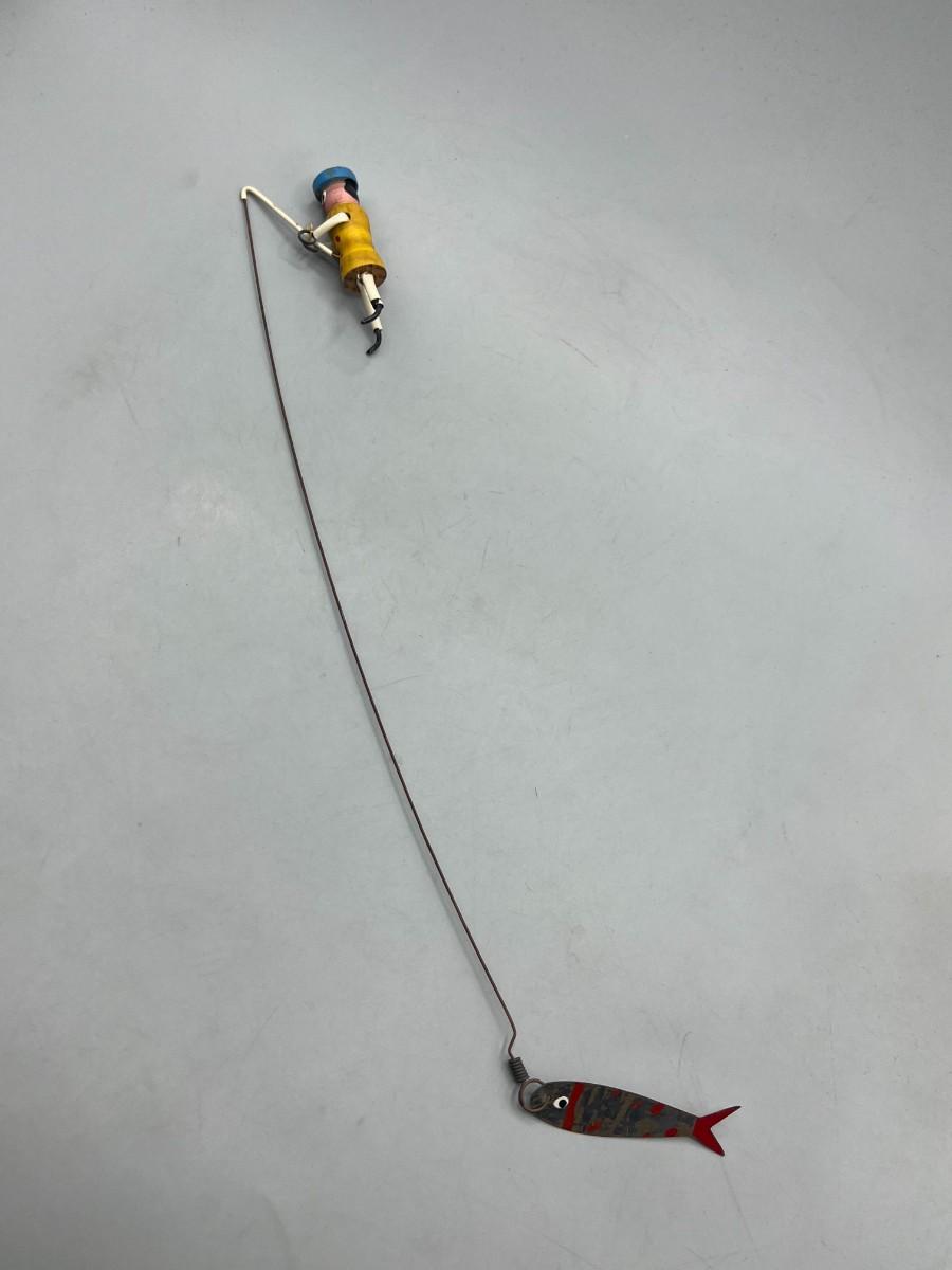Vintage Folkart Carved Wood & Metal Little Figurine Fishing Balancing Shelf Sitter