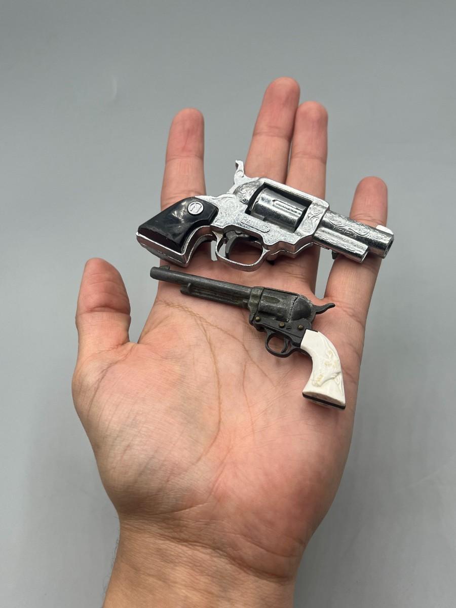 Pair of Vintage Miniature Toy Cap Guns Cowboy Pistols Revolvers. Smaller than standard toy guns. In good collectible condition.