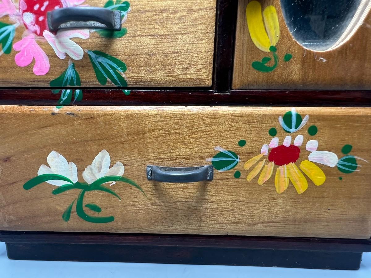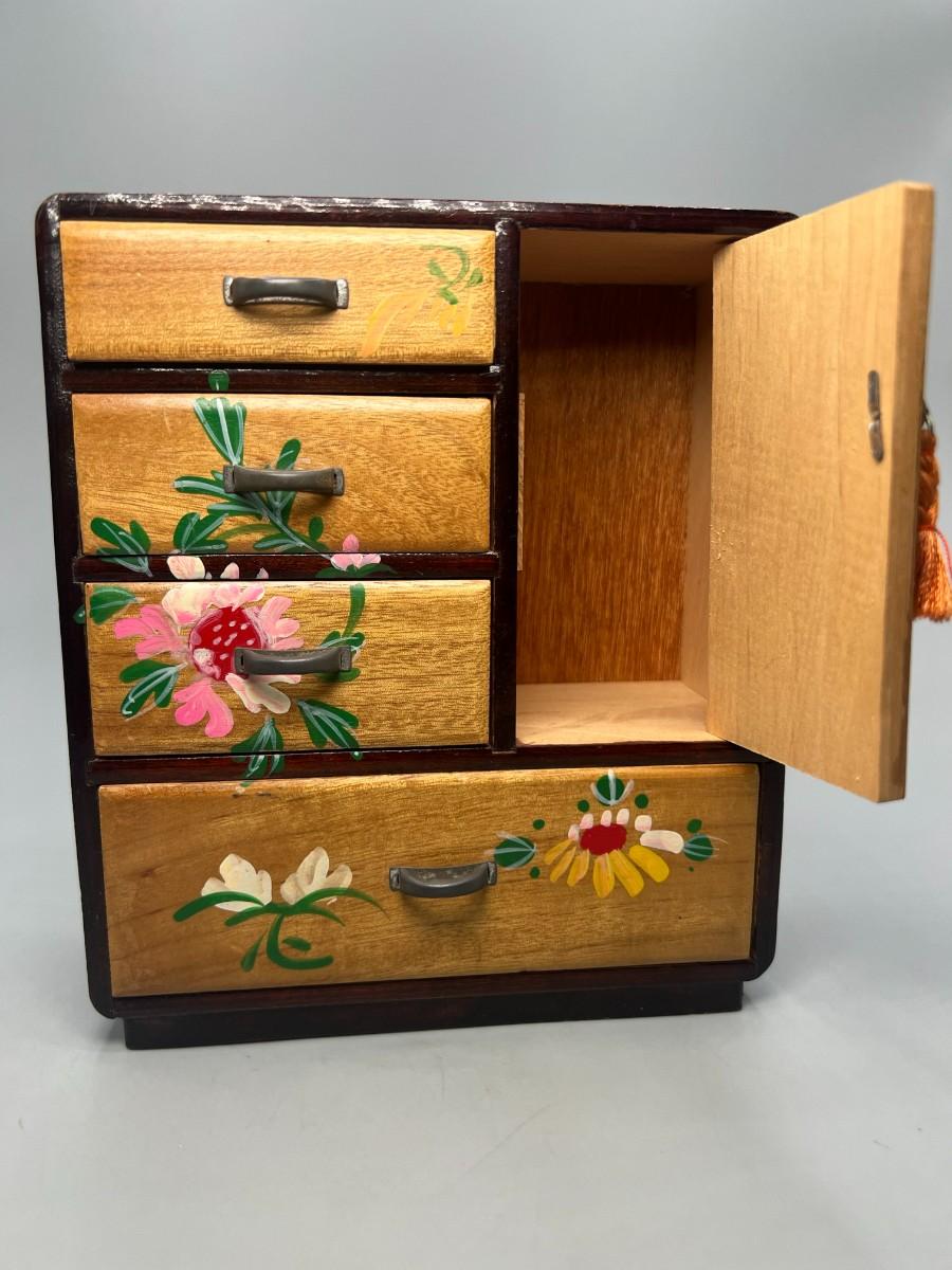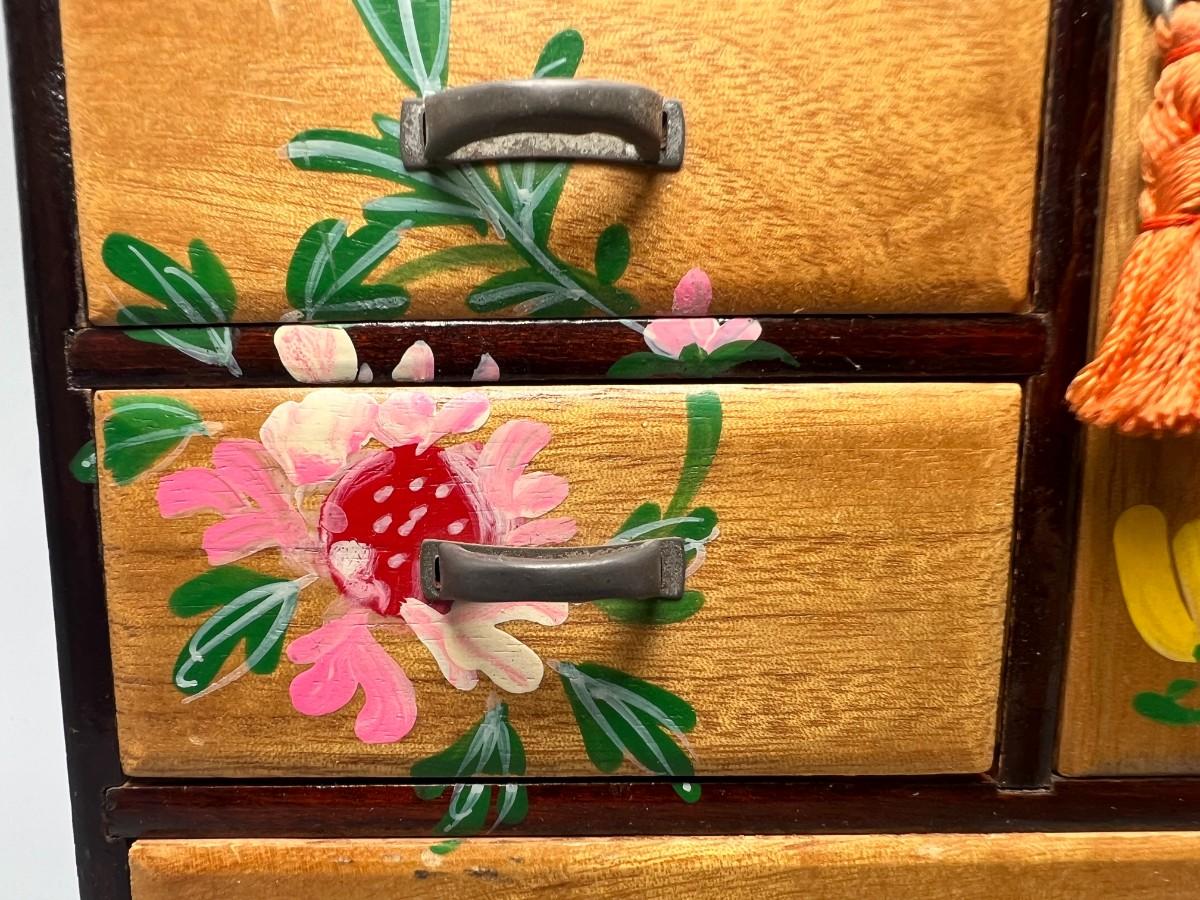 Vintage Japanese Hand Painted Colorful Flower Motif Wooden Jewelry Box Cabinet Dresser Drawers