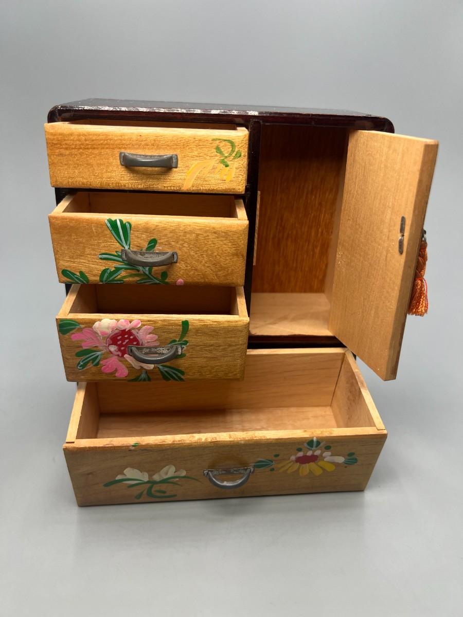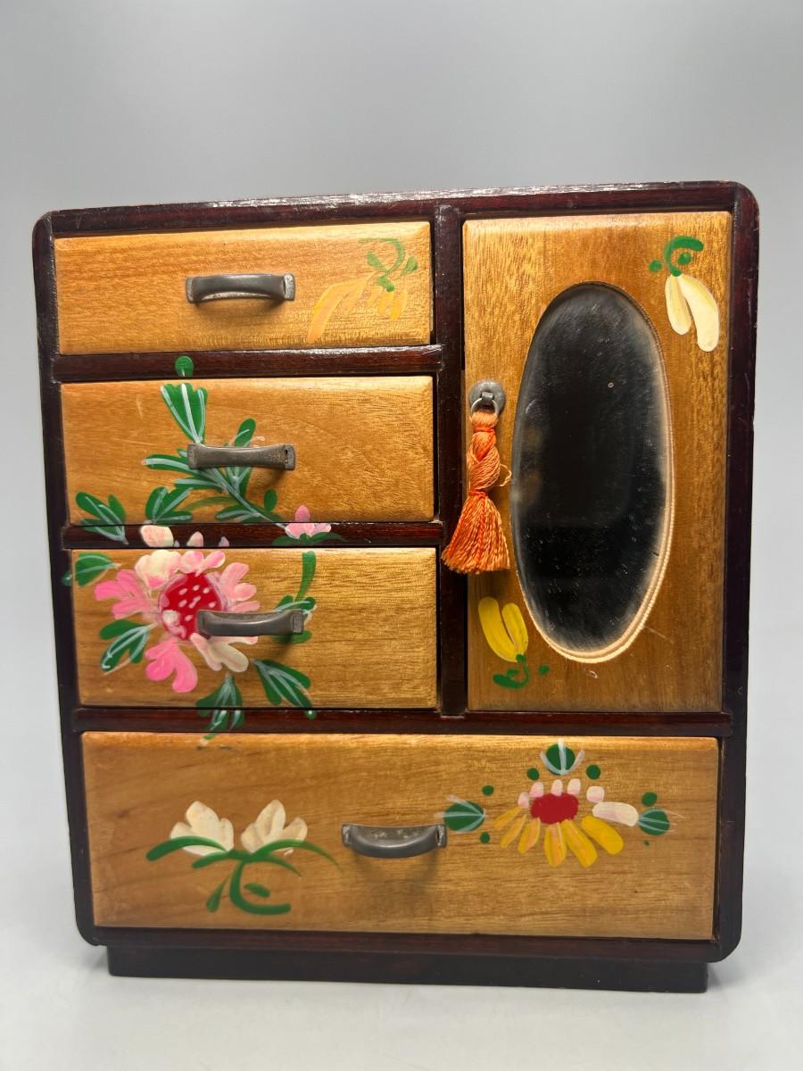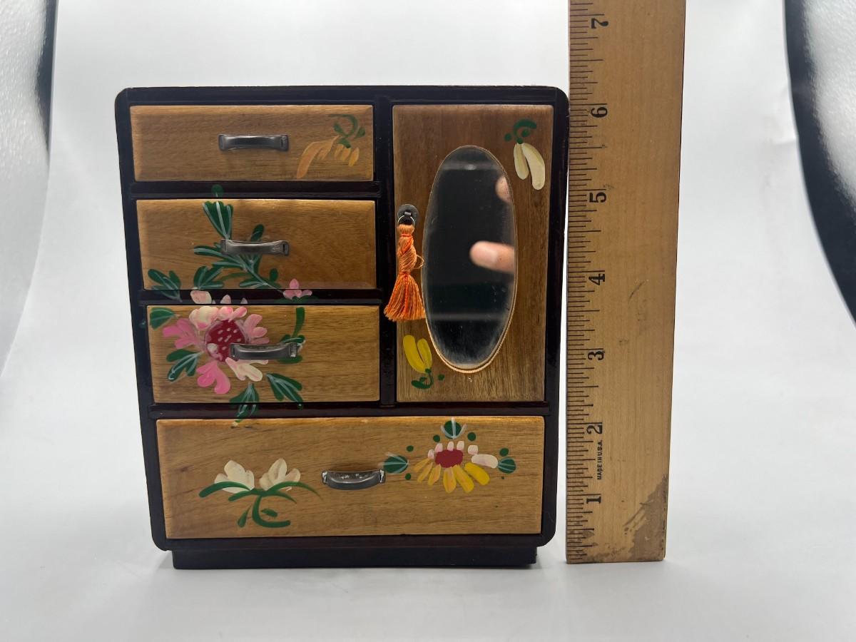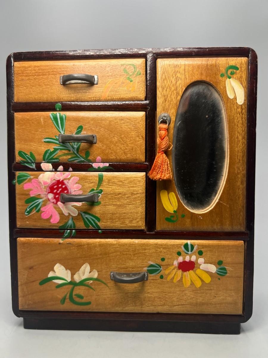 Vintage Japanese Hand Painted Colorful Flower Motif Wooden Jewelry Box Cabinet Dresser Drawers