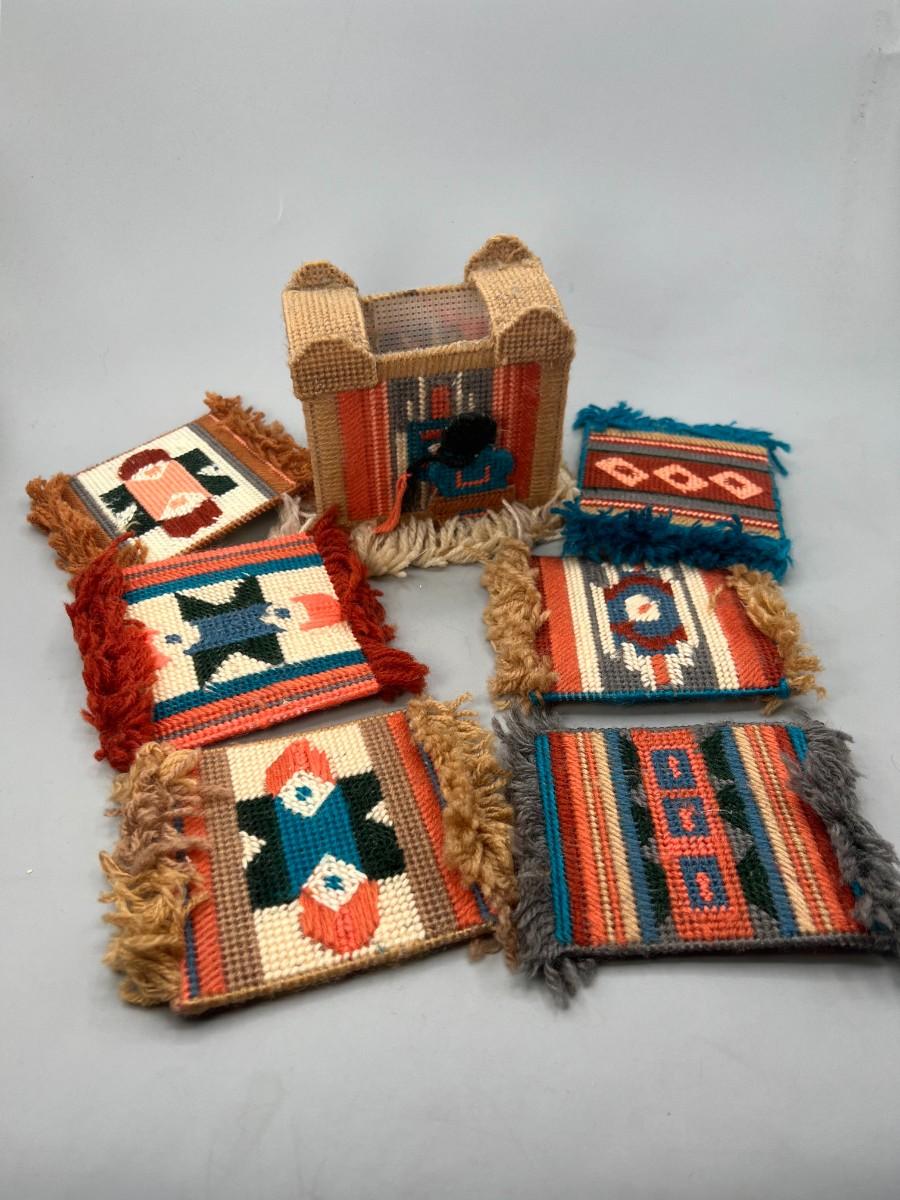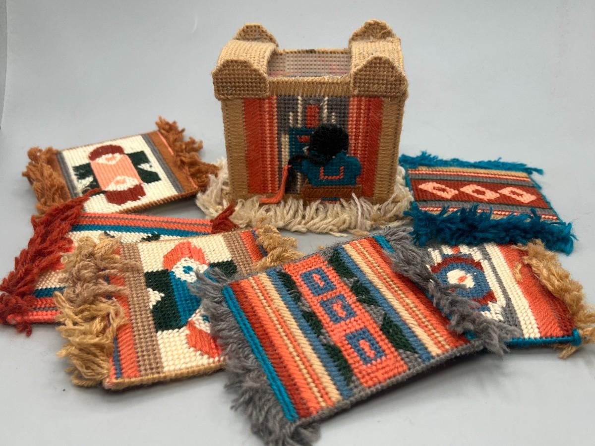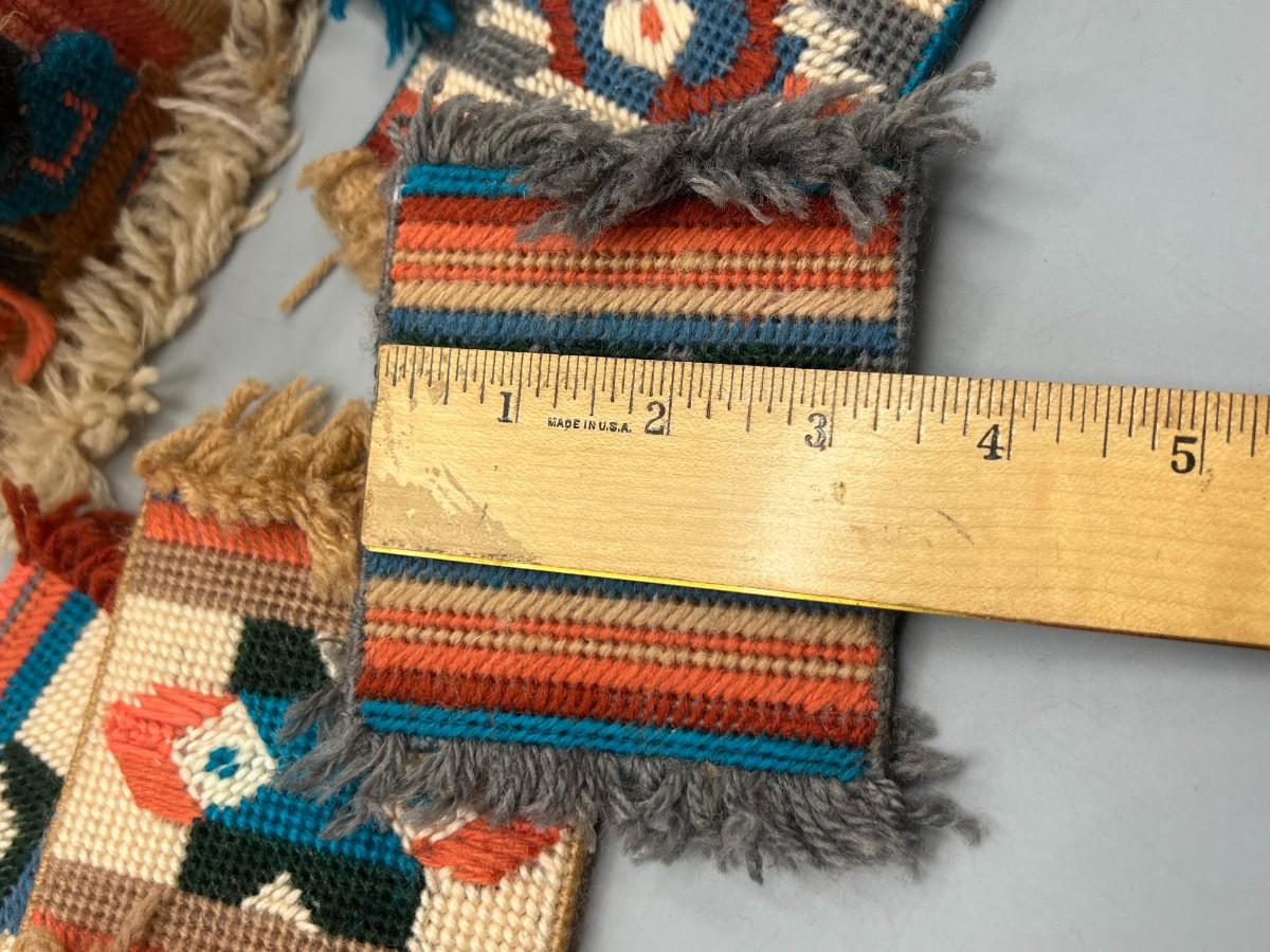 Vintage Southwestern Native Folk Pattern Crocheted Fringed Beverage Coaster Set