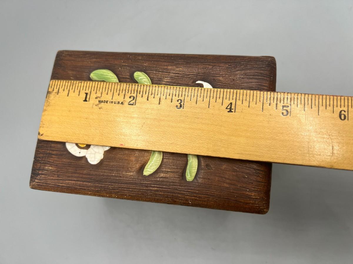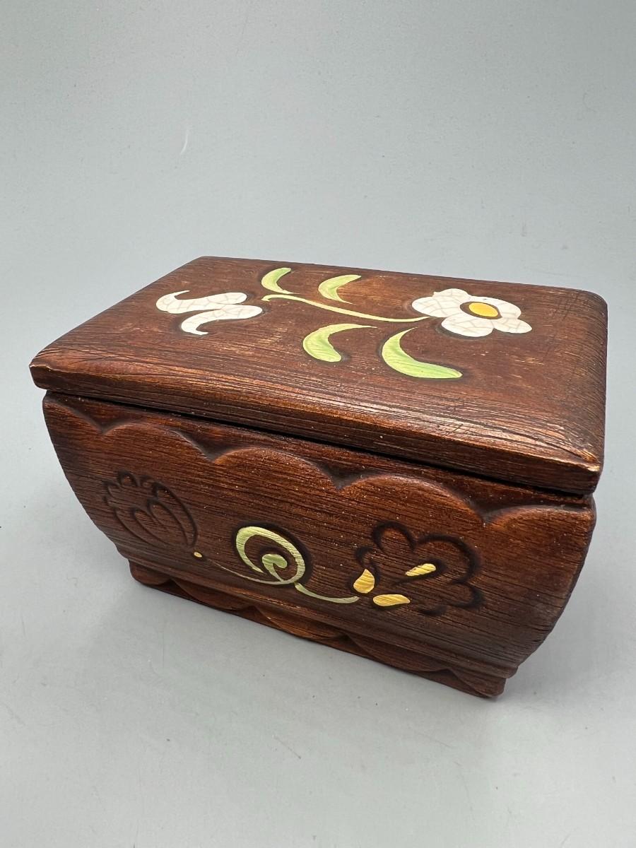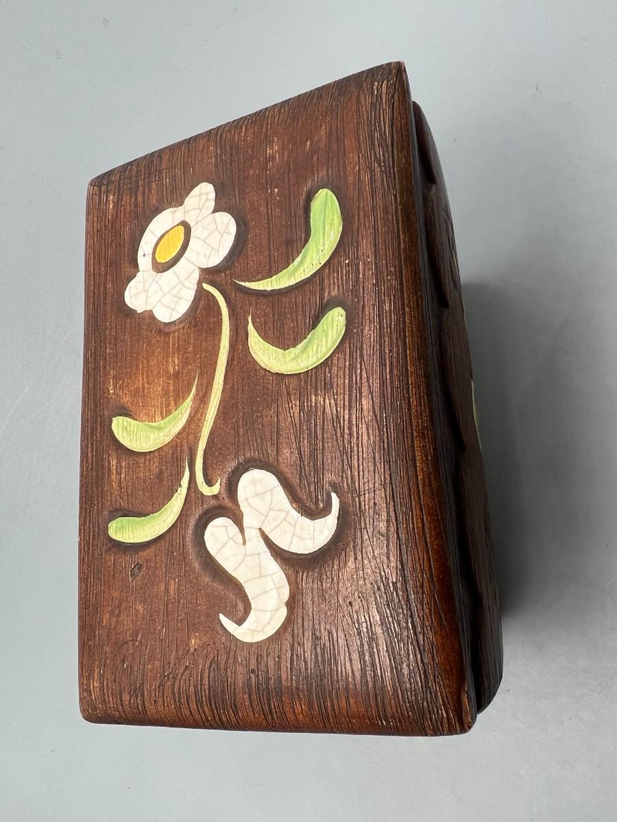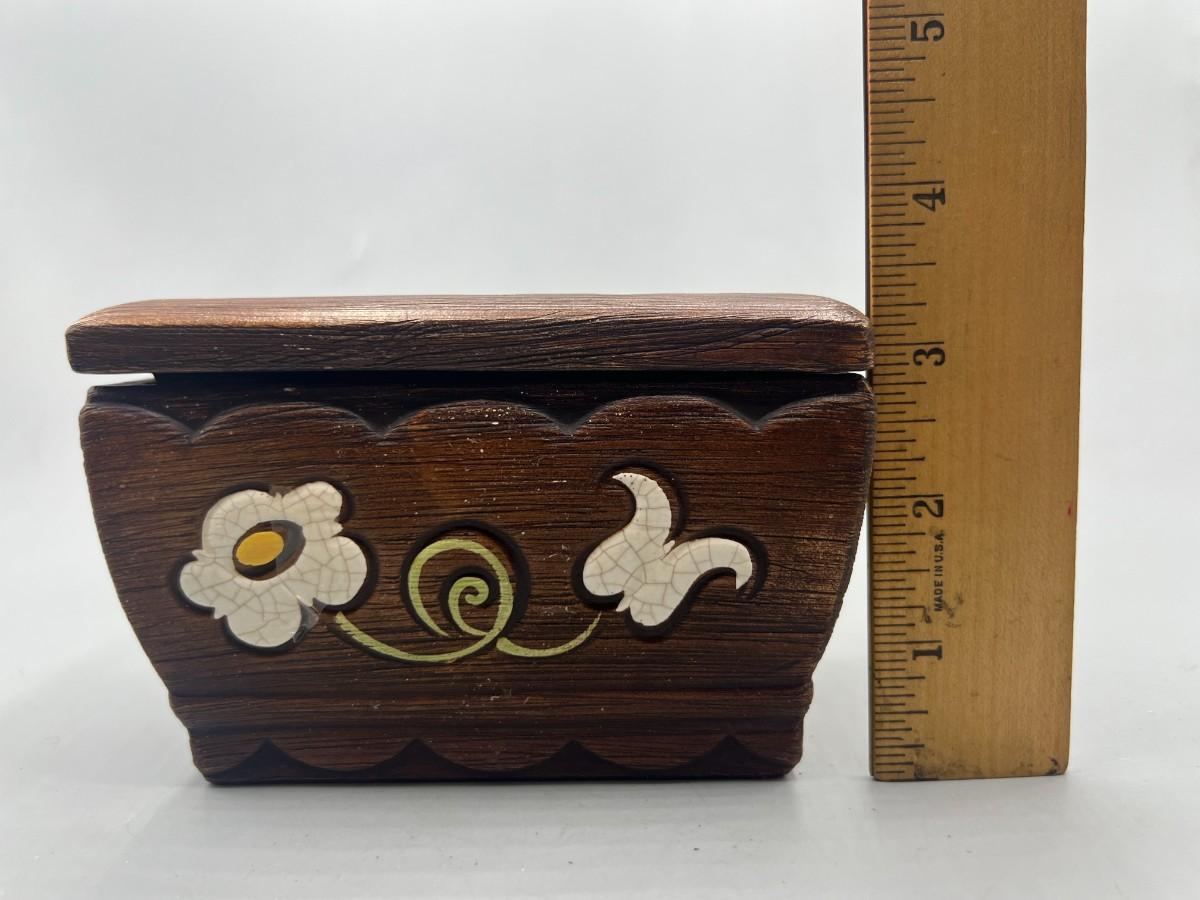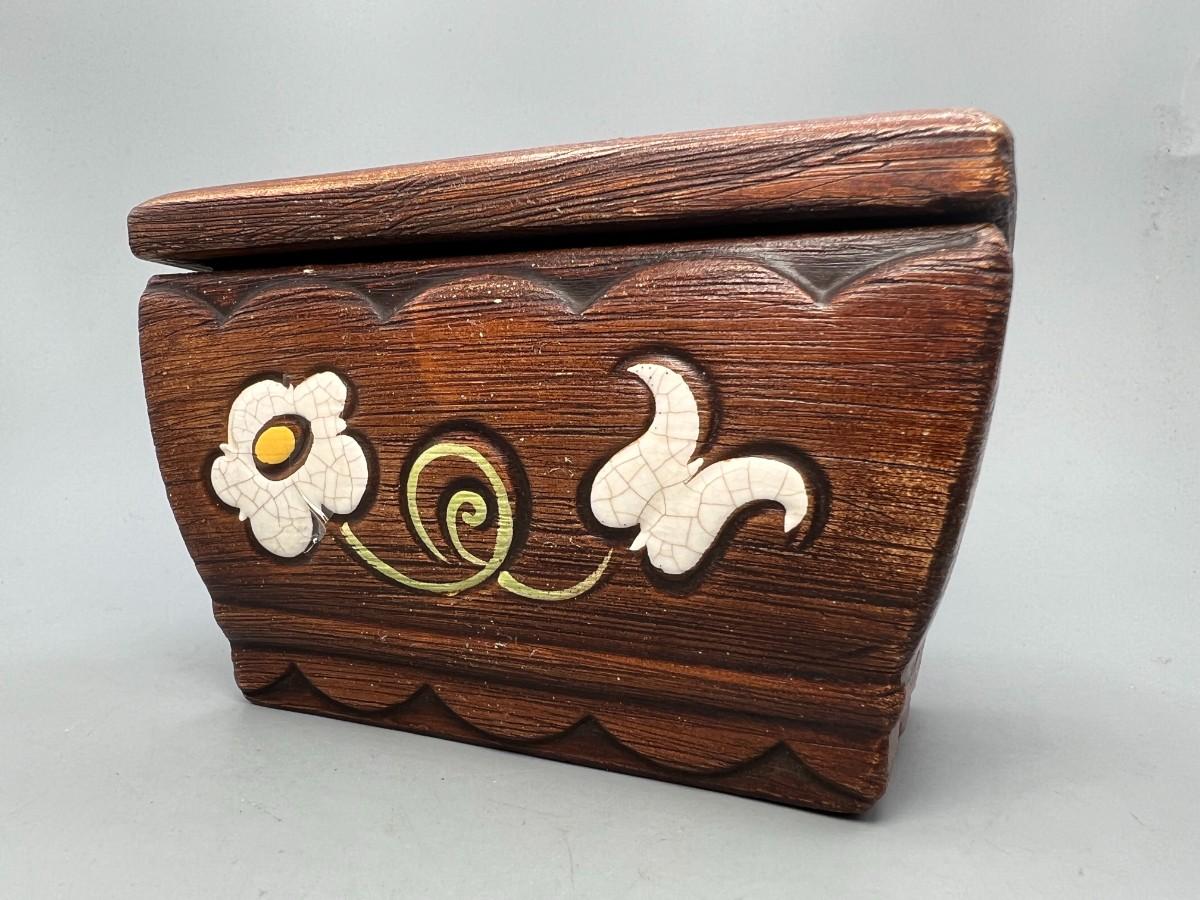 Vintage Folk Art Style California Pottery Brayton Laguna J15 Trinket Box. Has a faux wood look with flower pattern. In good vintage condition. Under 5" size.