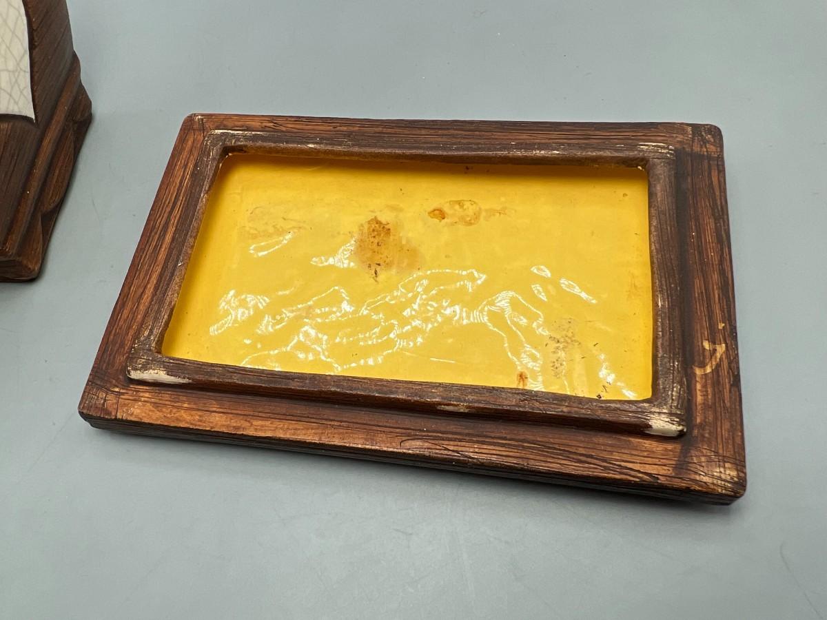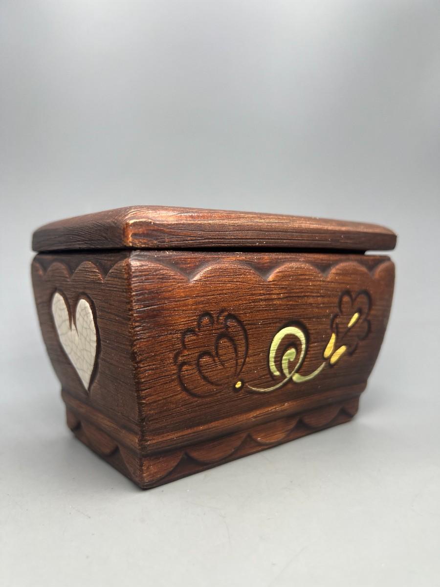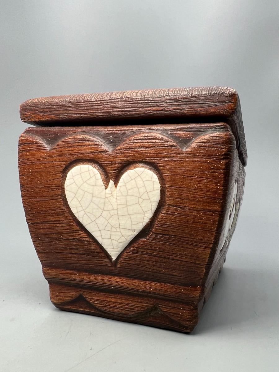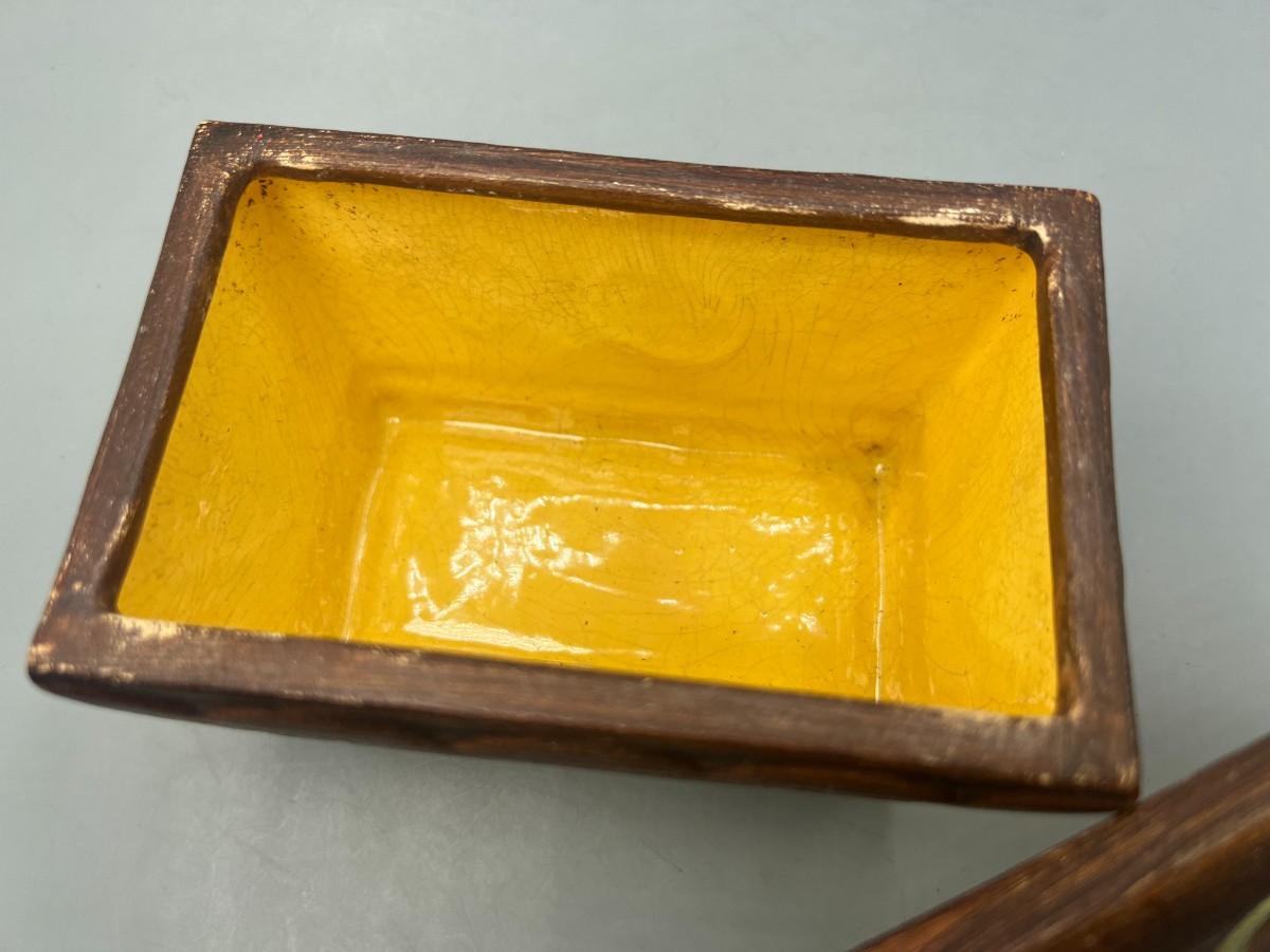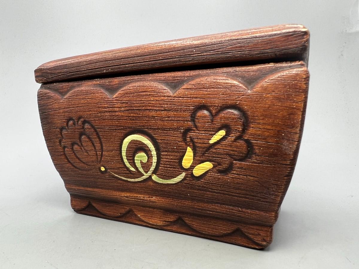 Vintage Folk Art Style California Pottery Brayton Laguna J15 Trinket Box. Has a faux wood look with flower pattern. In good vintage condition. Under 5" size.