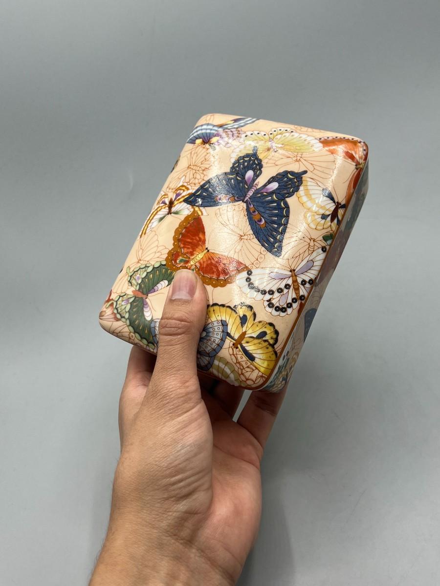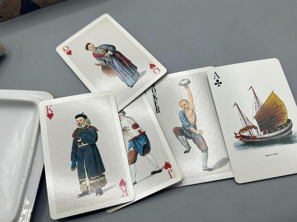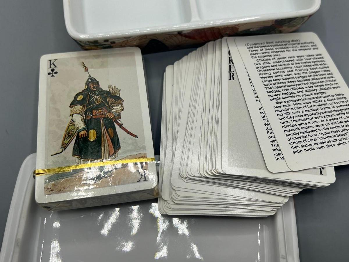 Vintage Neiman Marcus Ceramic Playing Card Holder Box with Medieval Playing Cards. In good condition. One set of cards is unopened. Beautiful butterfly patterns ceramic box.