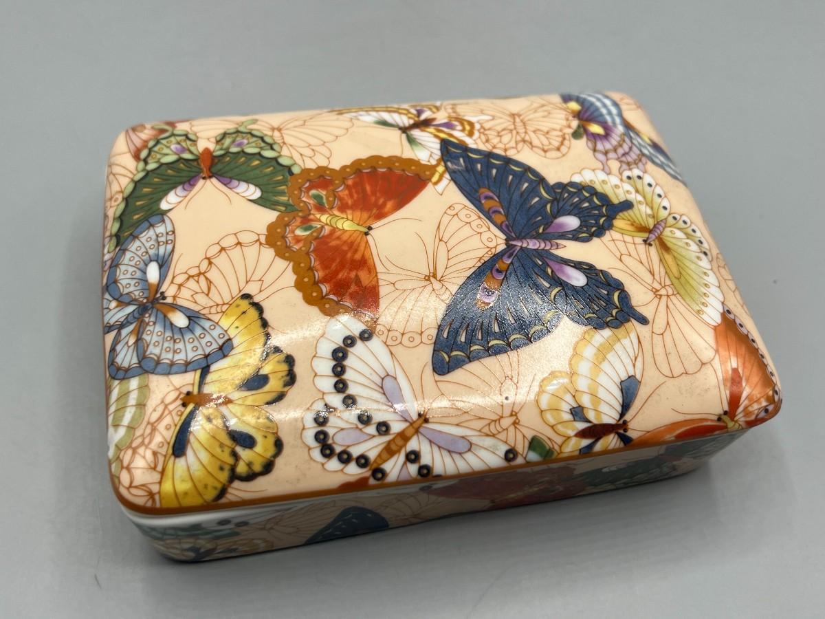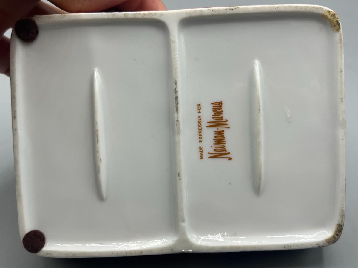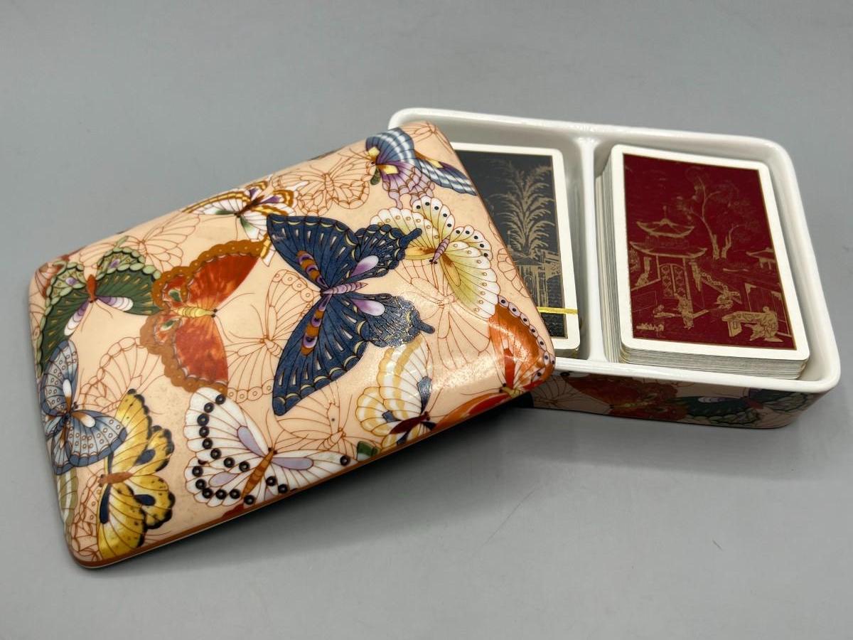 Vintage Neiman Marcus Ceramic Butterfly Patterned Playing Card Holder Box with Medieval Playing Cards