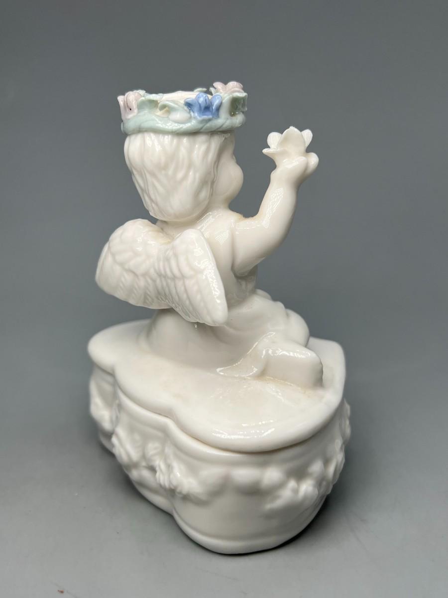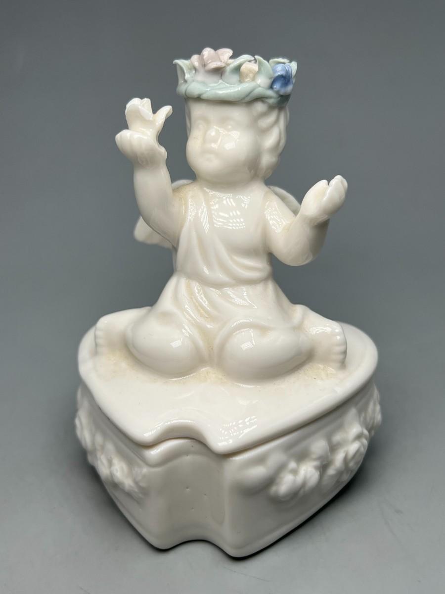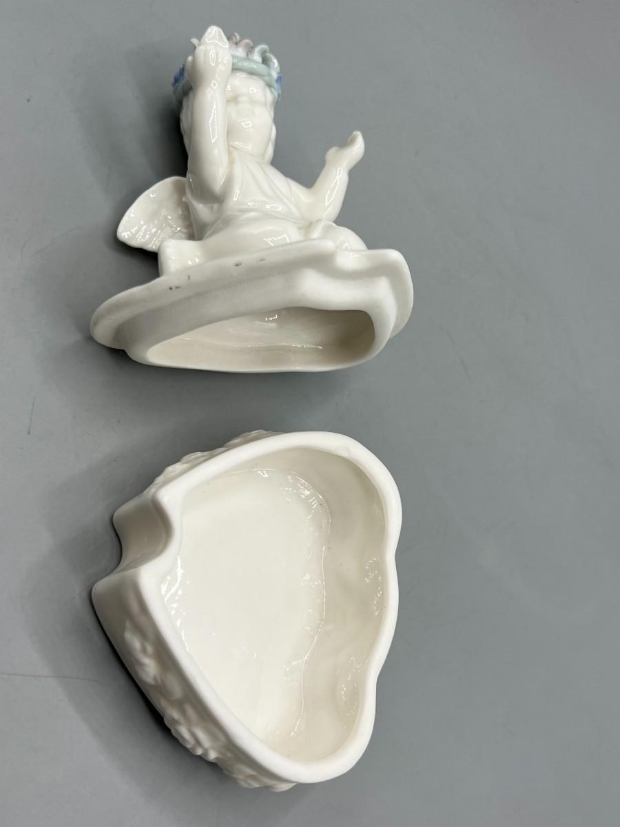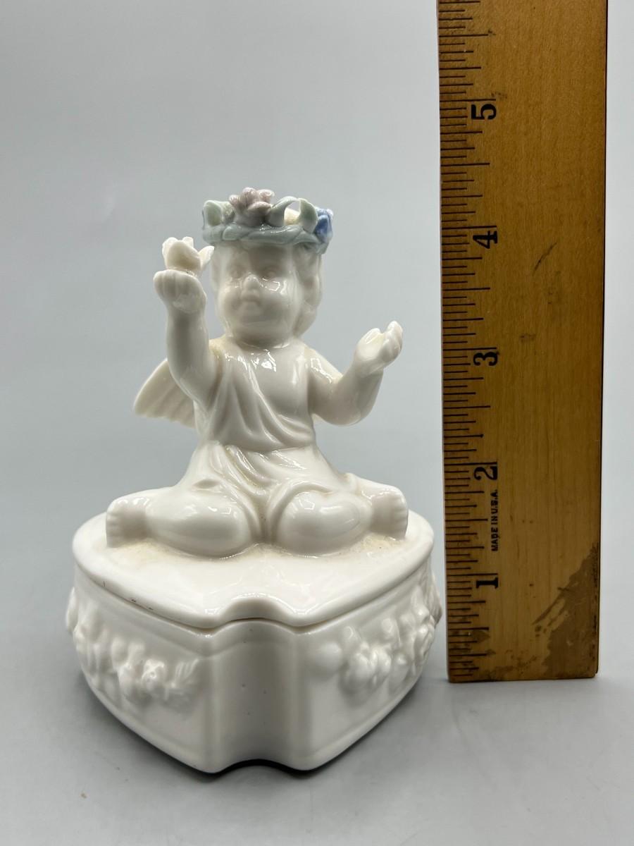 Small Heart Shaped Porcelain Trinket with Angel Cherub Sitting On Top Wearing Flower Crown