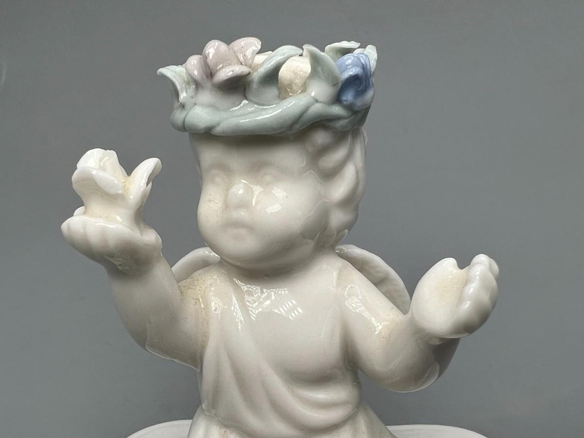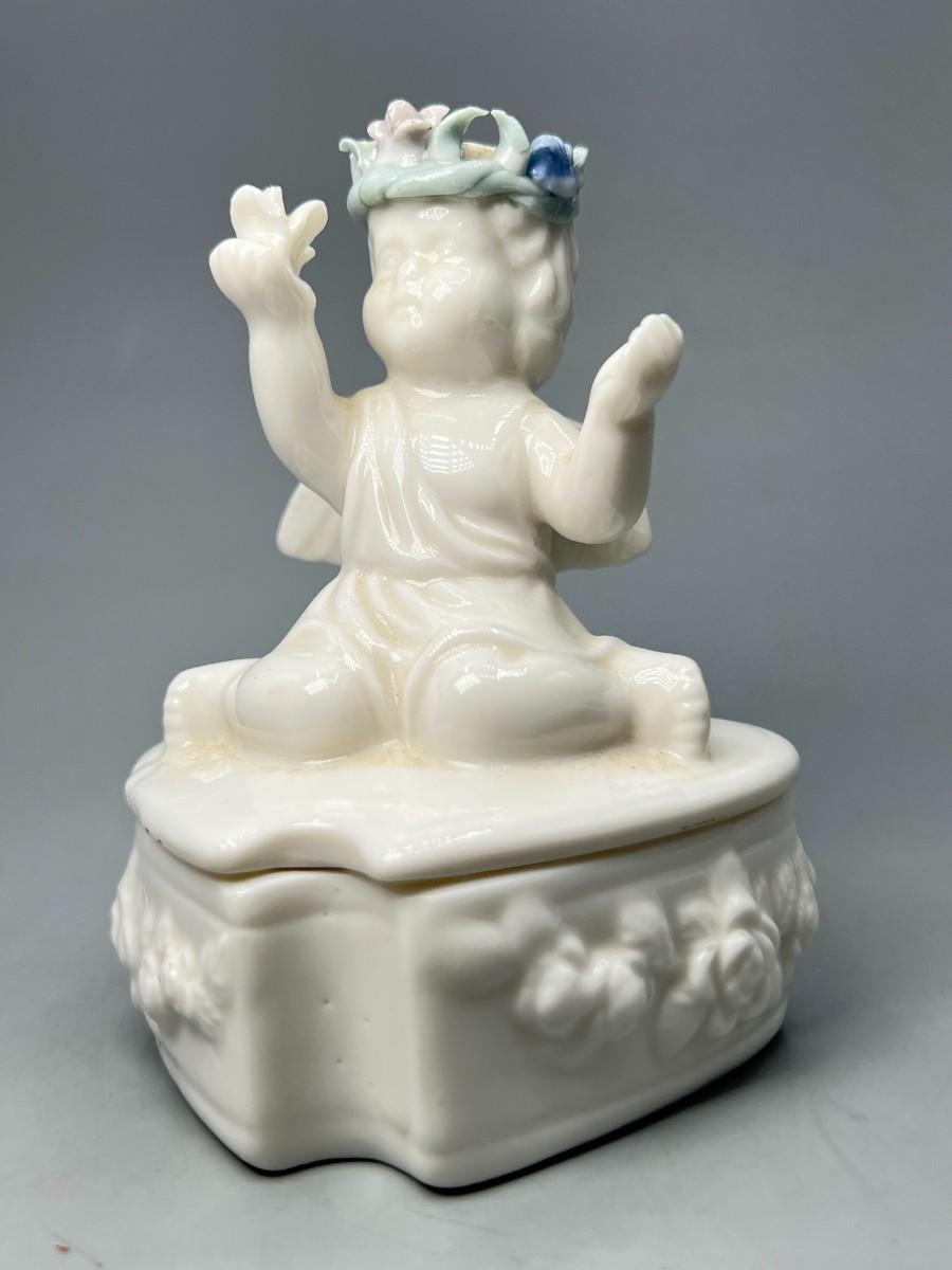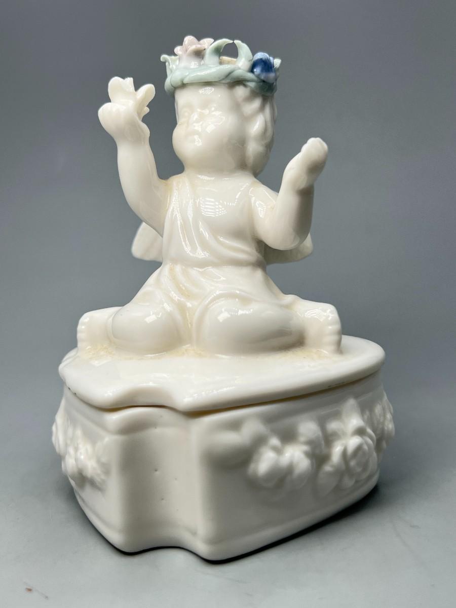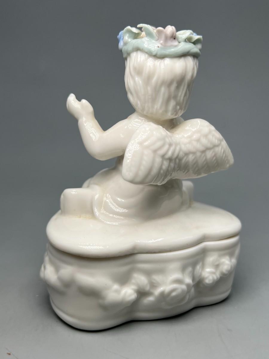Small Heart Shaped Porcelain Trinket with Angel Cherub Sitting On Top Wearing Flower Crown