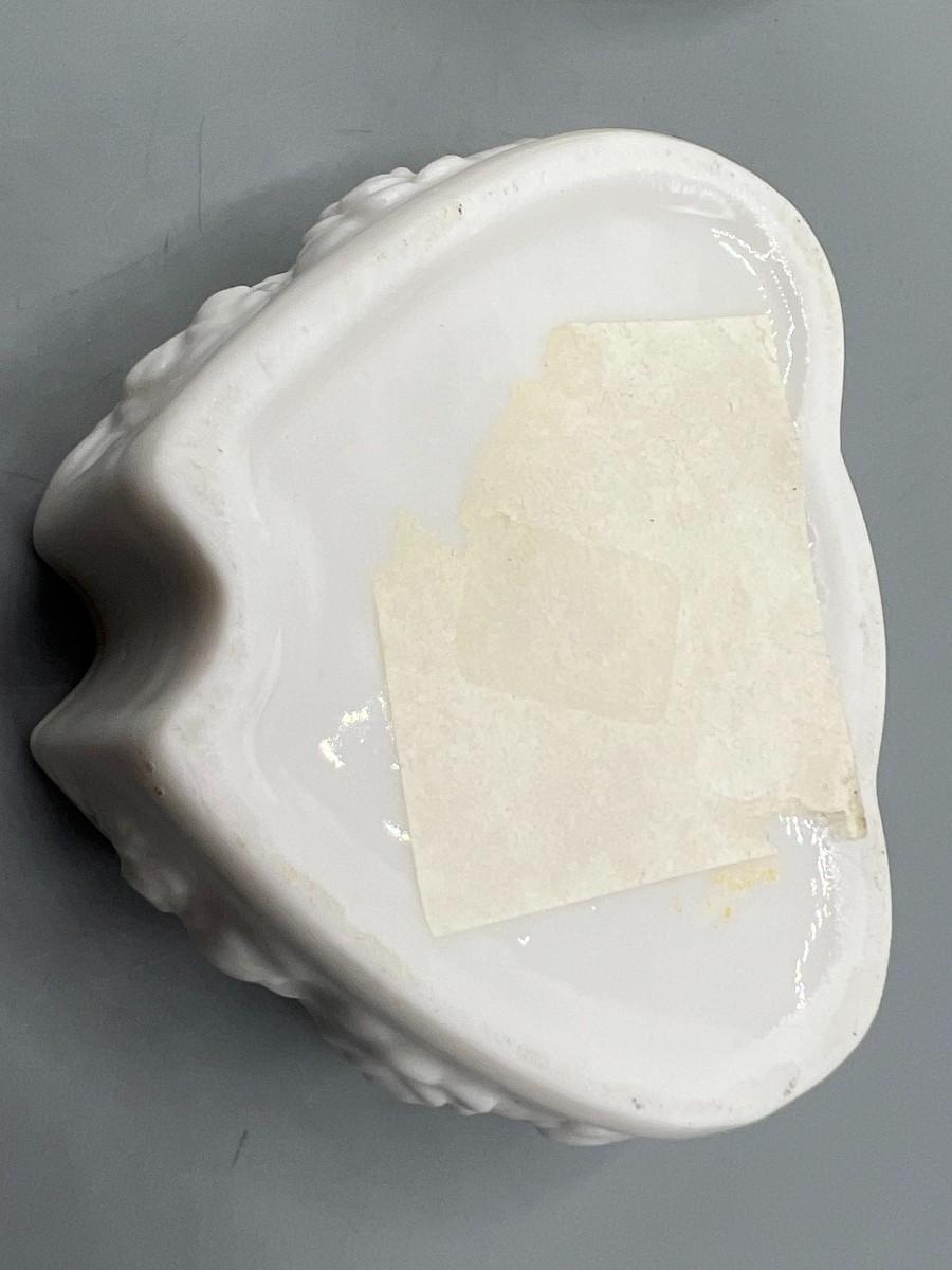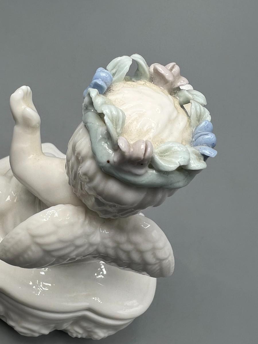 Small Heart Shaped Porcelain Trinket with Angel Cherub Sitting On Top Wearing Flower Crown. In good vintage condition. May have flea bite chipping along crown leaf edges.
