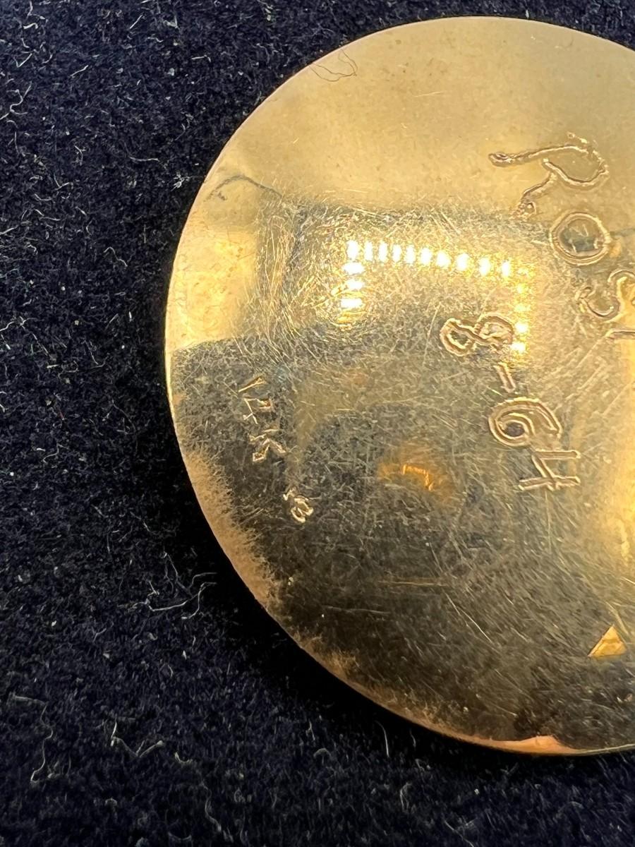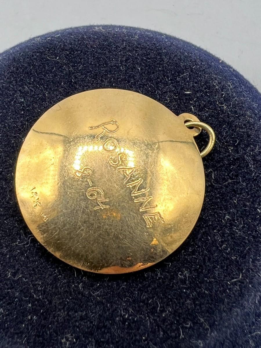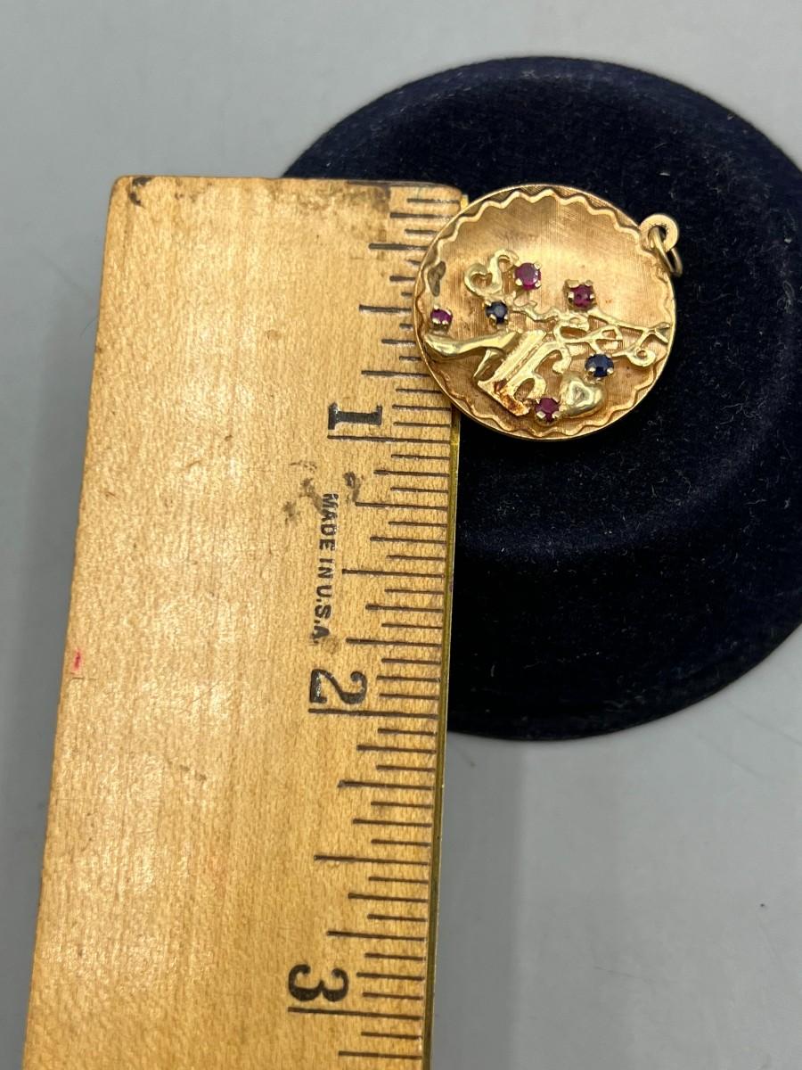 Vintage 14k Yellow Gold & Gemstone Sweet 16 Round Pendant Charm Engraved on the Back. In good vintage condition. Charm is about 1" size. It looks to have been a gift in 1964 to a girl named Rosanne. Marked 14k at the bottom on back.