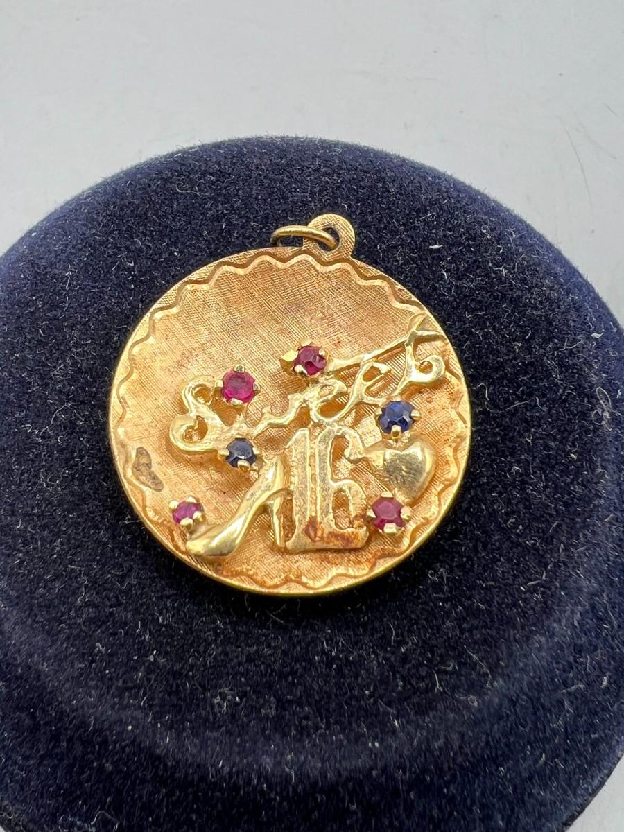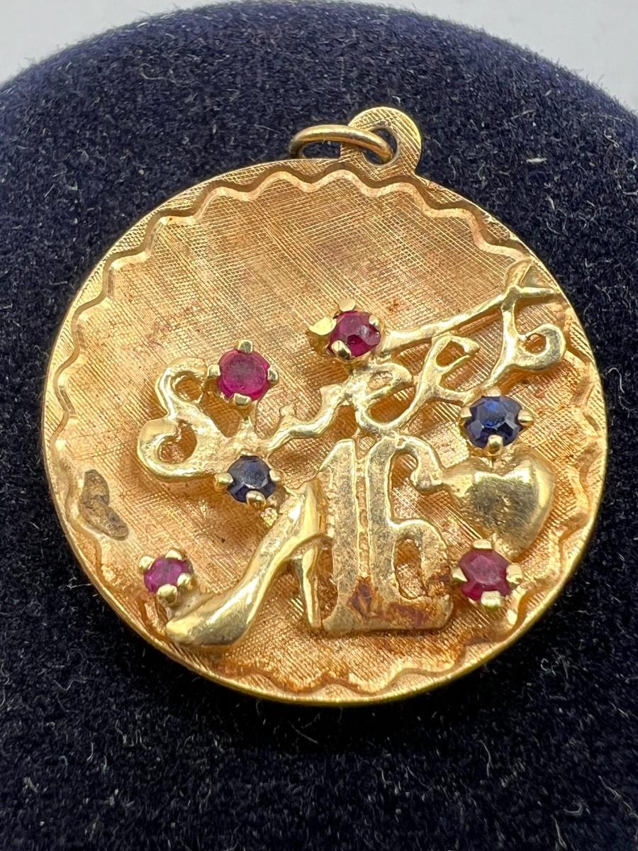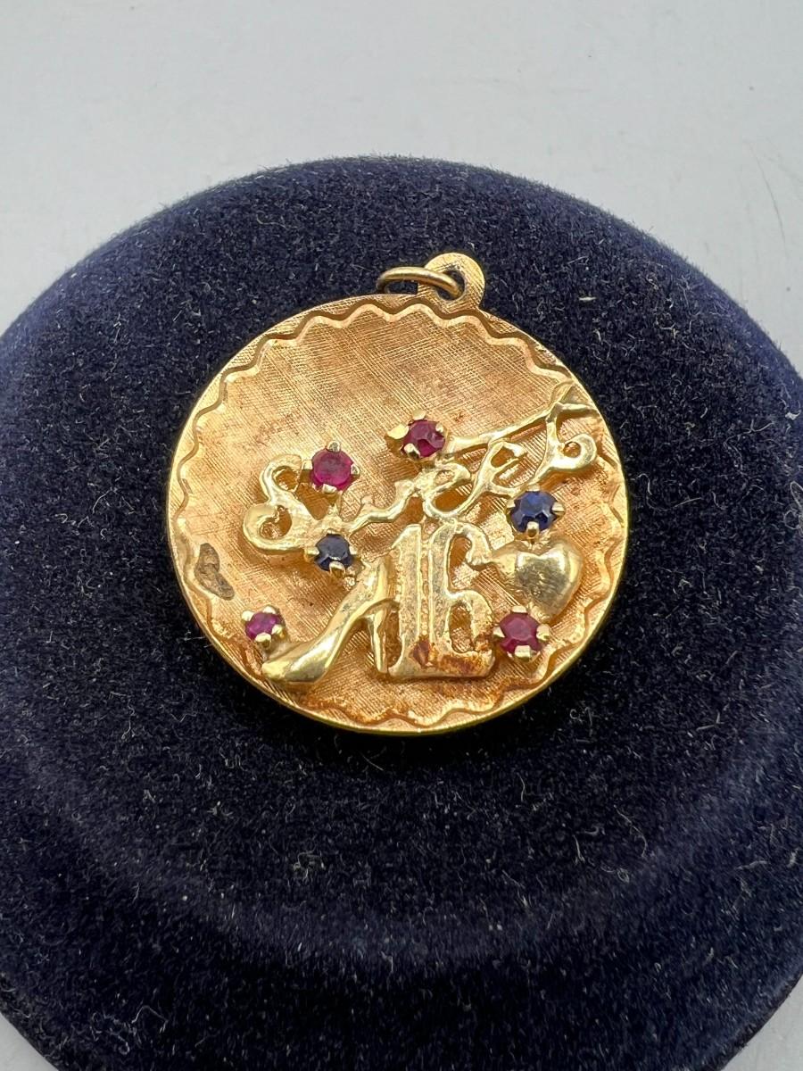 Vintage 14k Yellow Gold & Gemstone Sweet 16 Round Pendant Charm Engraved on the Back
