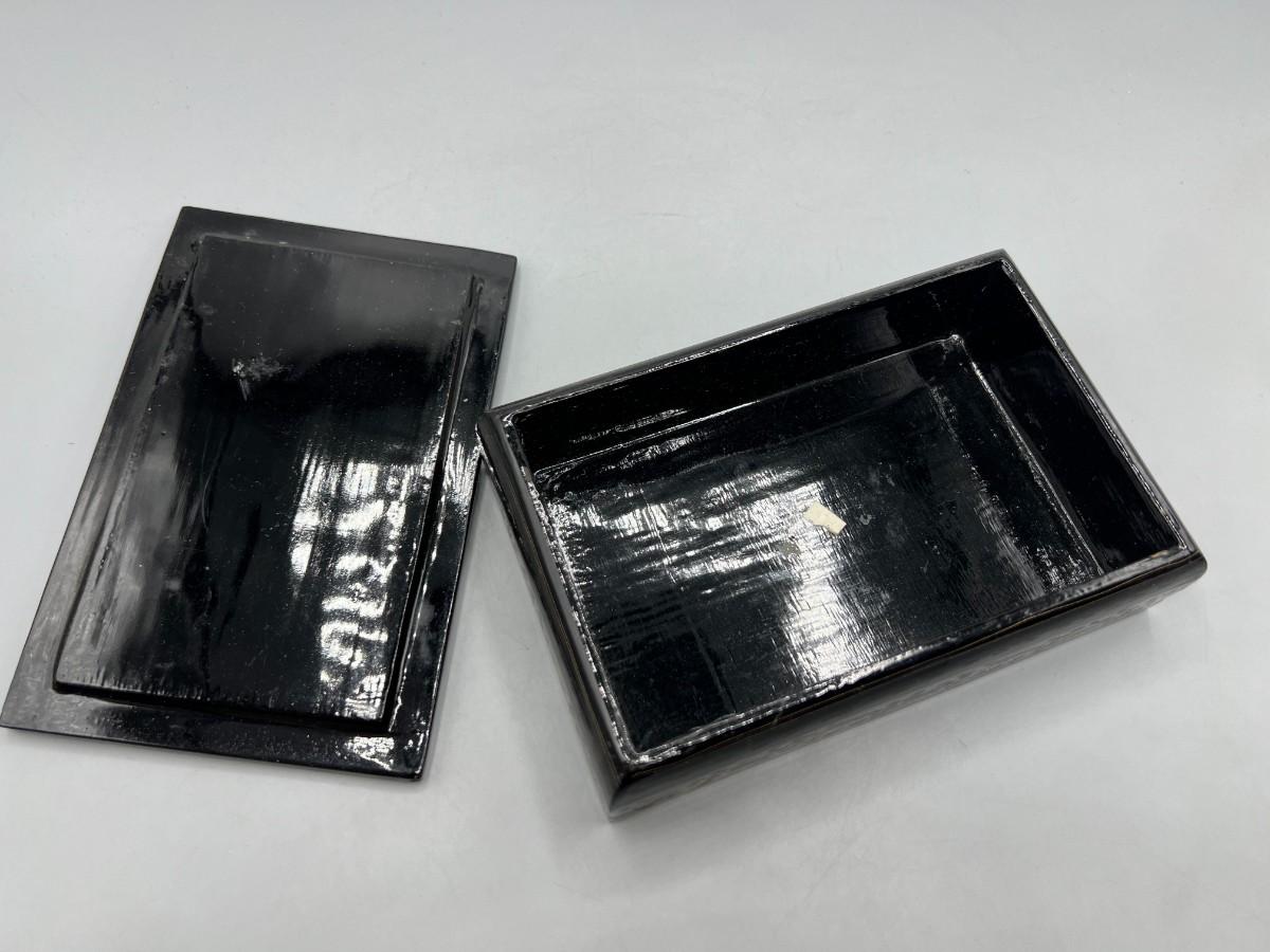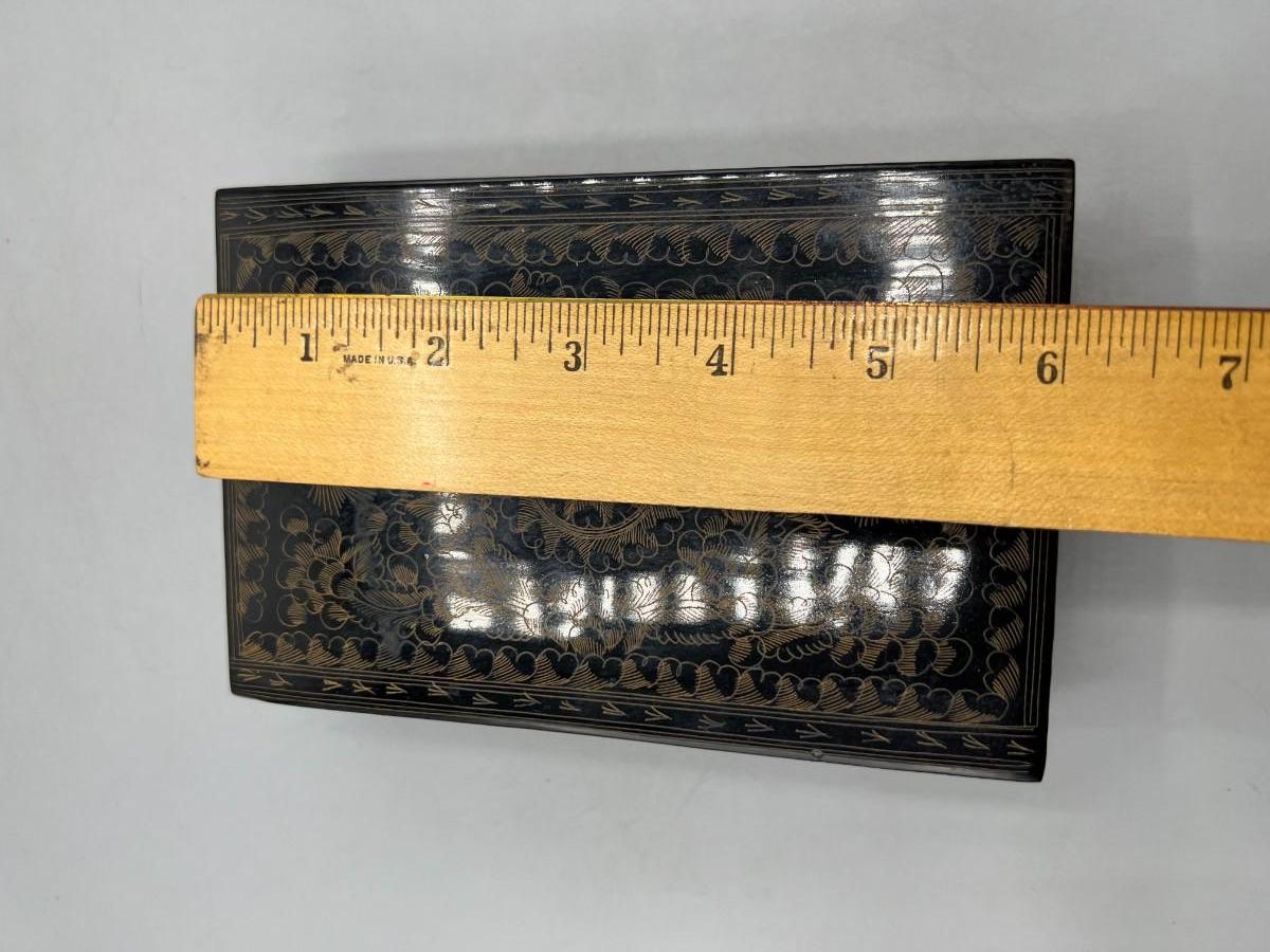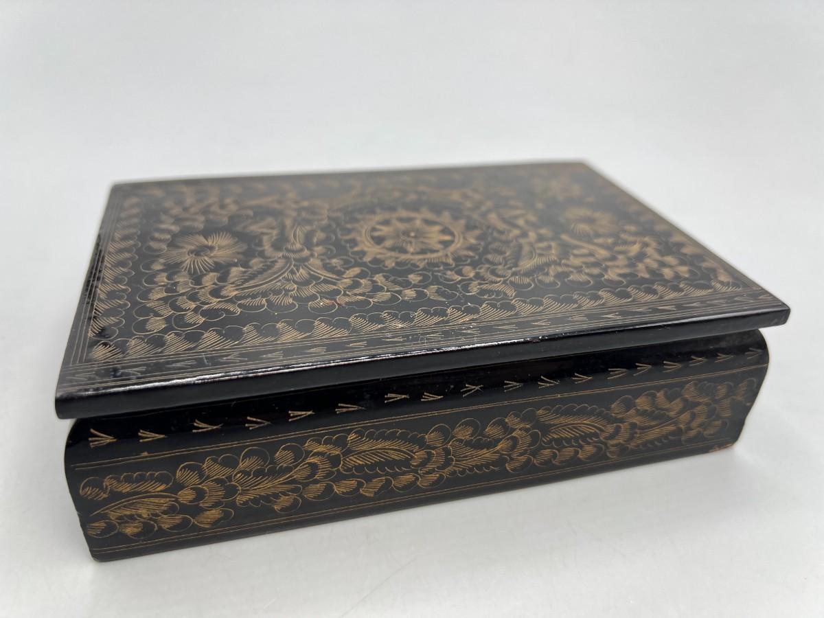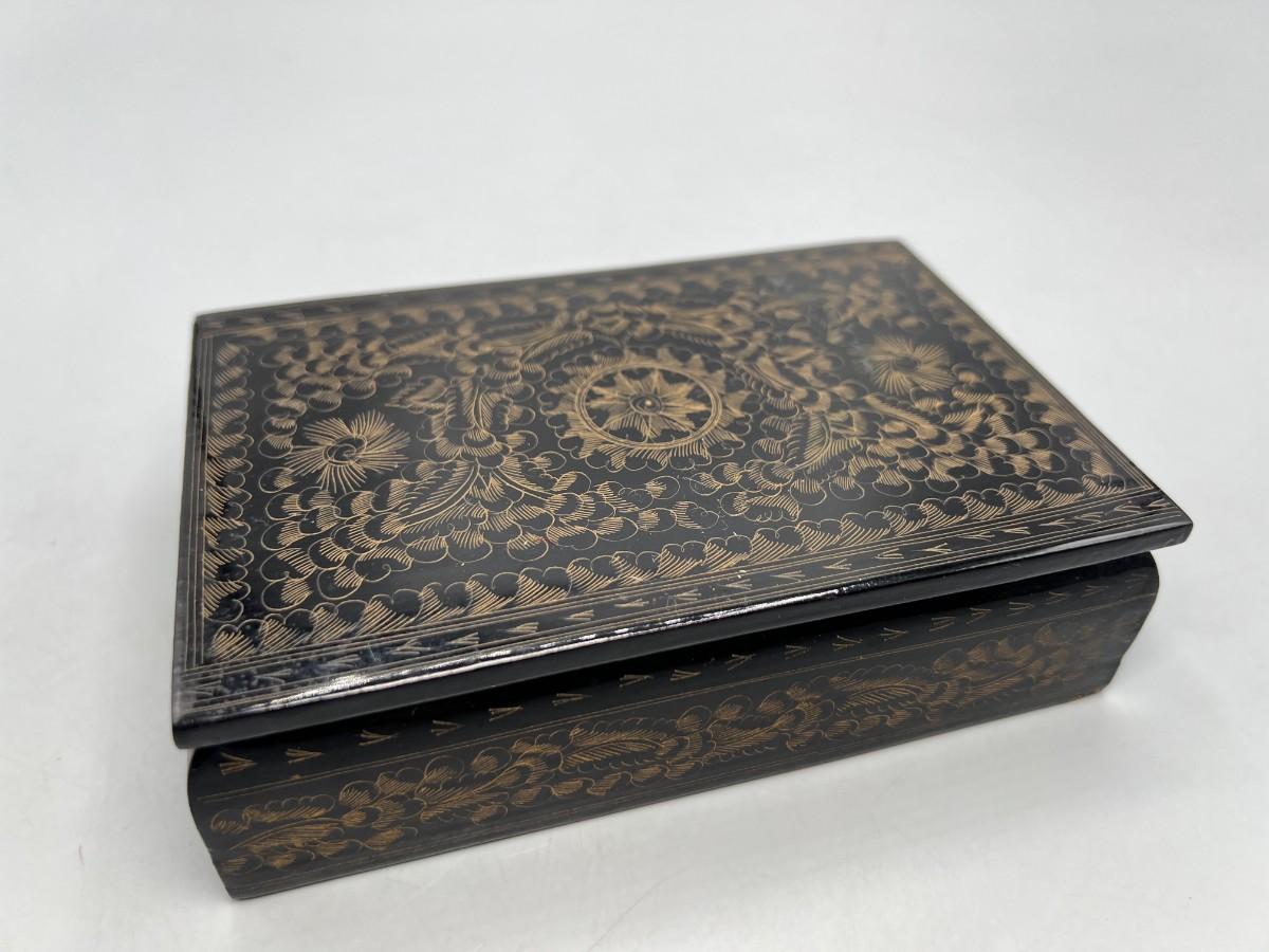 Vintage Flower & Feather Etched Carved Black Enamel Jewelry Trinket Keepsake Box
