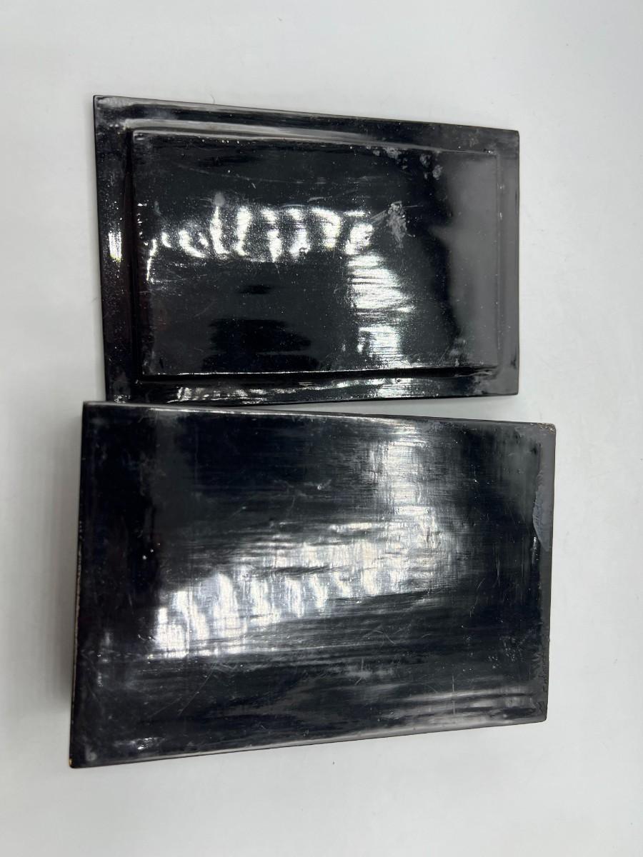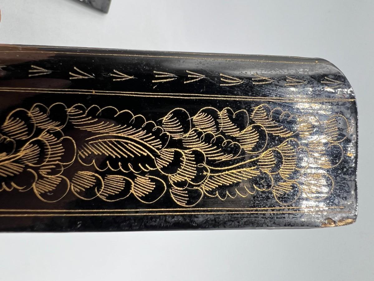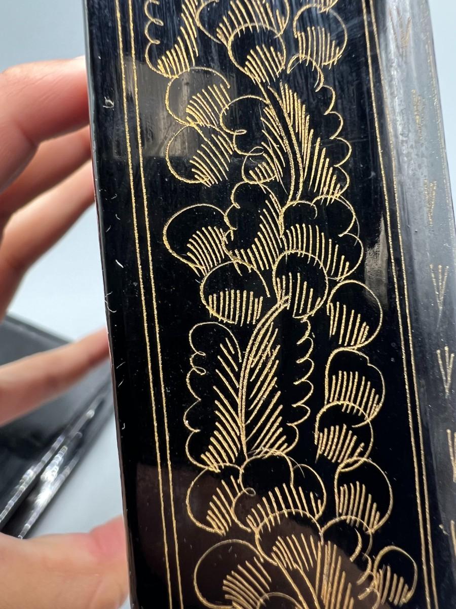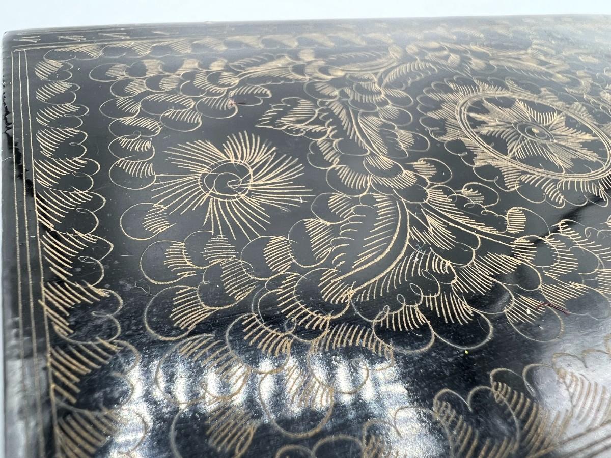 Vintage Flower & Feather Etched Carved Black Enamel Jewelry Trinket Keepsake Box