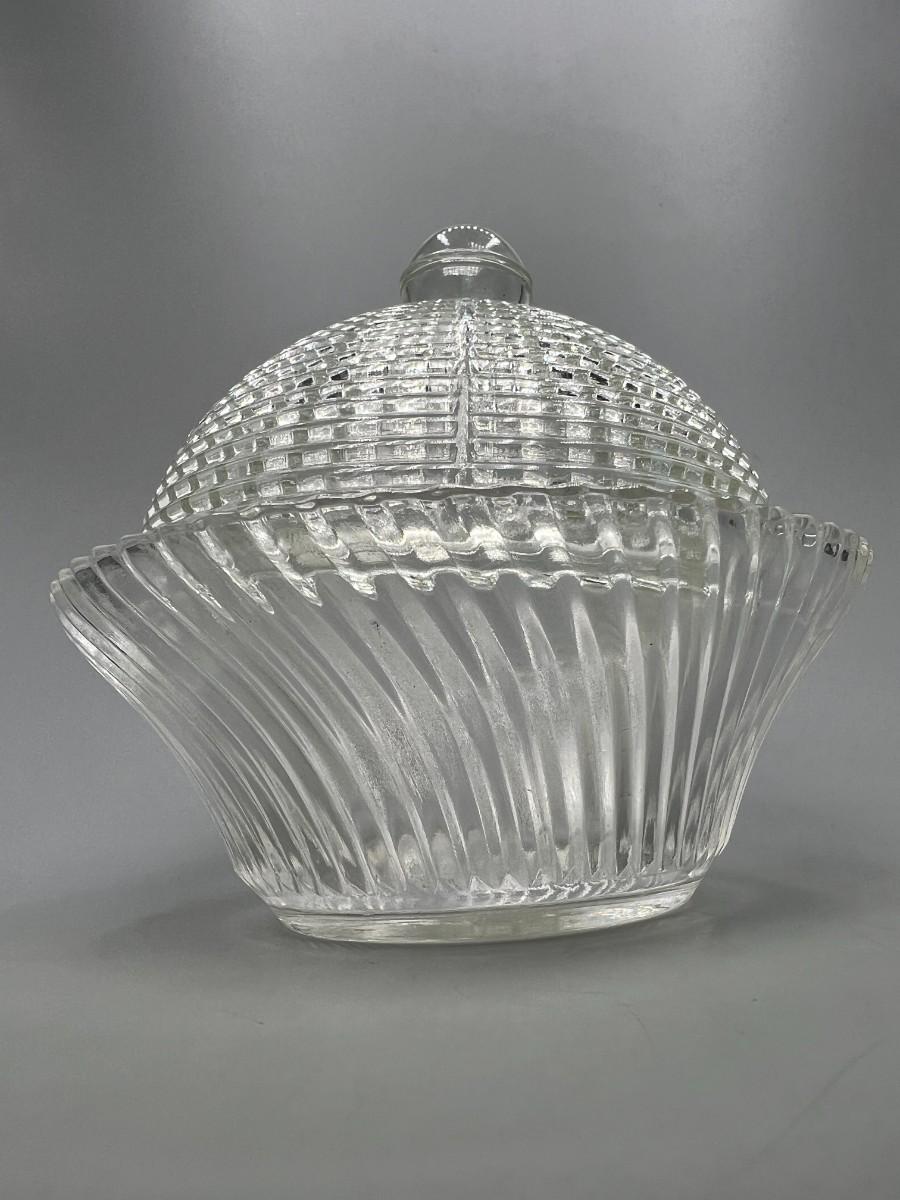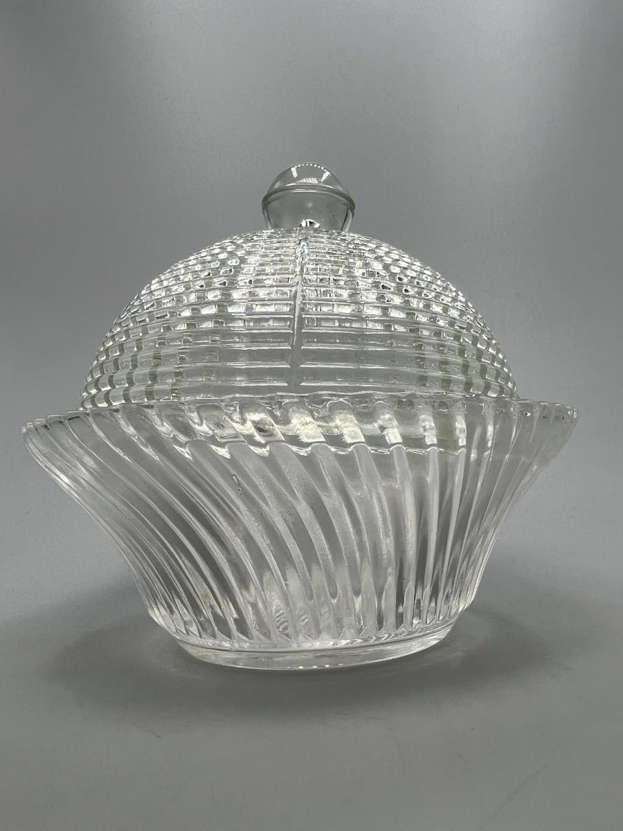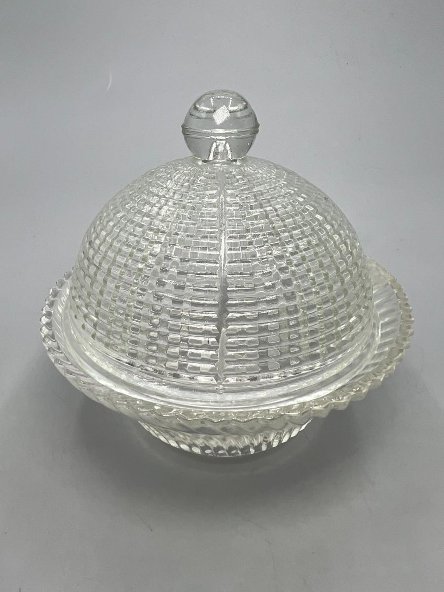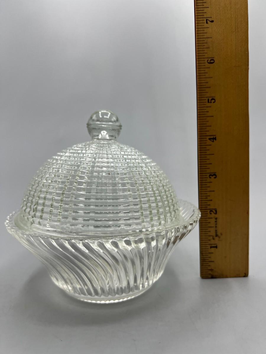 Vintage EAPG Clear Depression Glass Lidded Sugar Bowl Trinket Dish. In good condition. Swirled bowl with gridded lid.