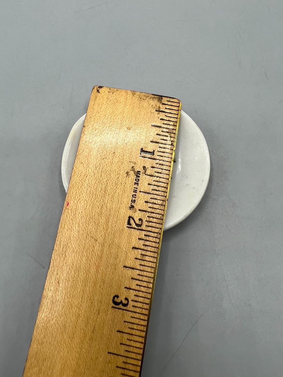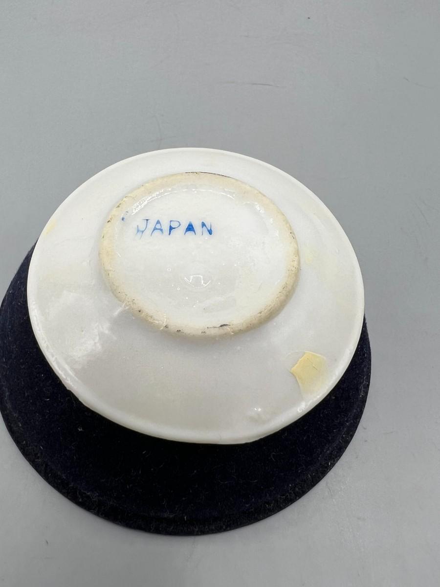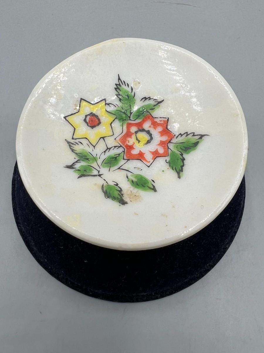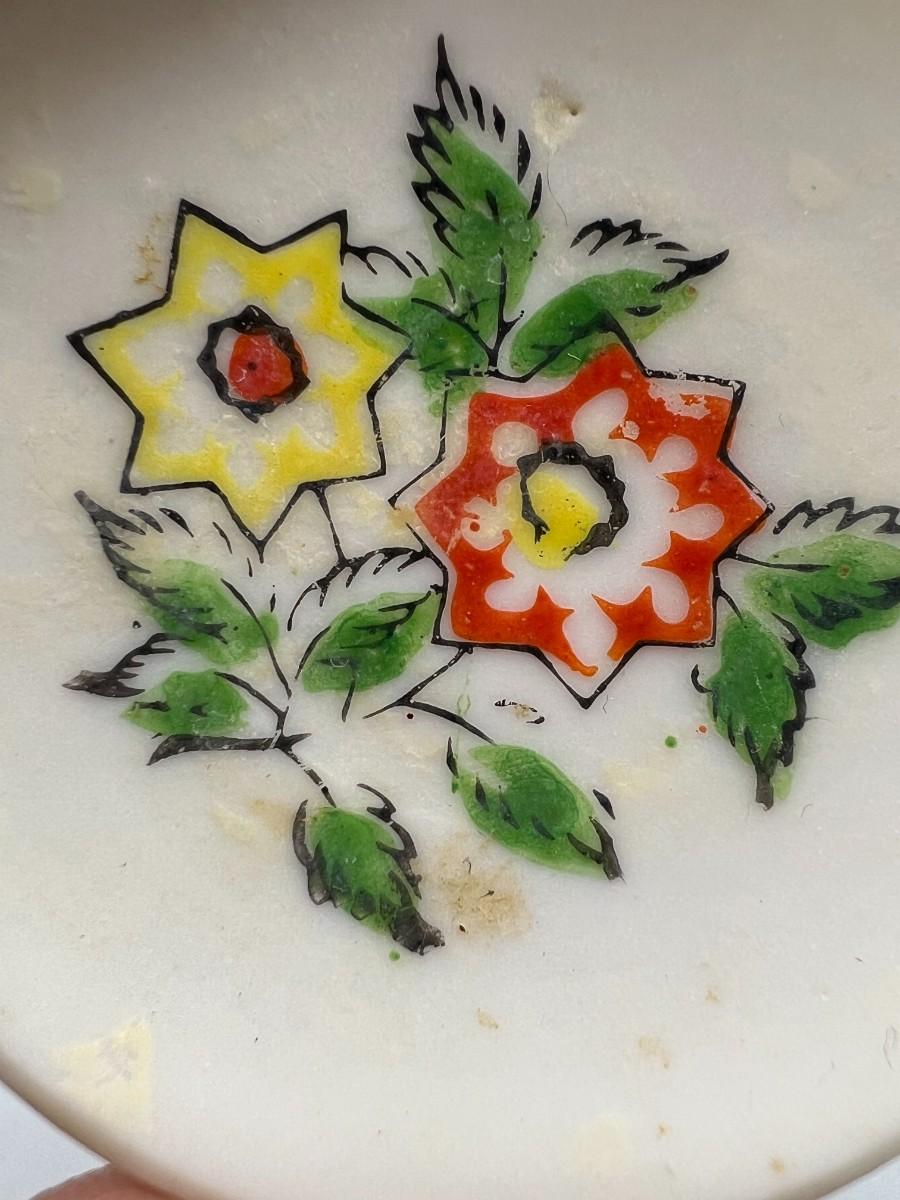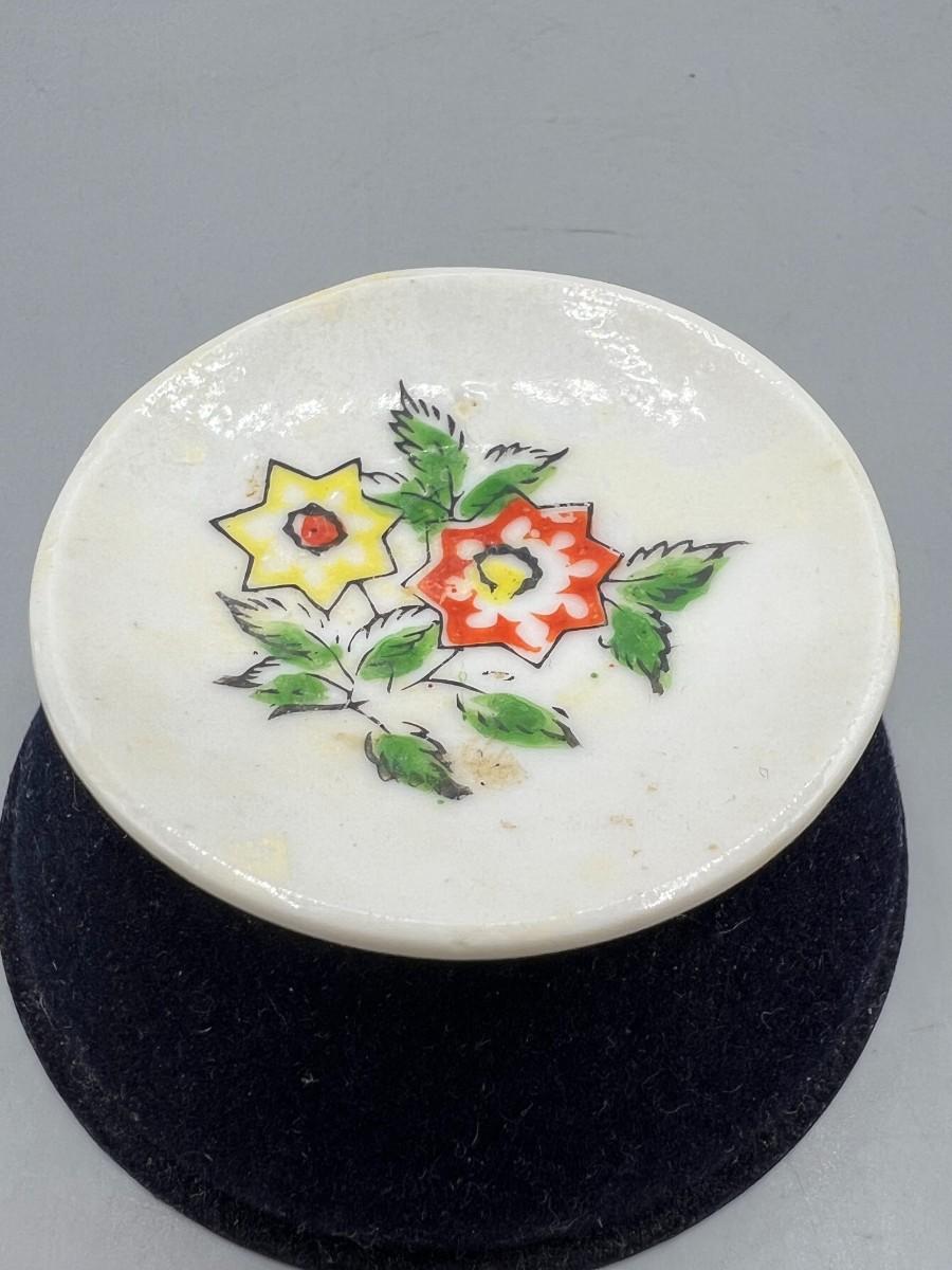 Vintage Miniature Yellow and Red Flower Painted Tiny Plate Saucer Made in Japan. In vintage condition. Design on plate has wear. 2" size.