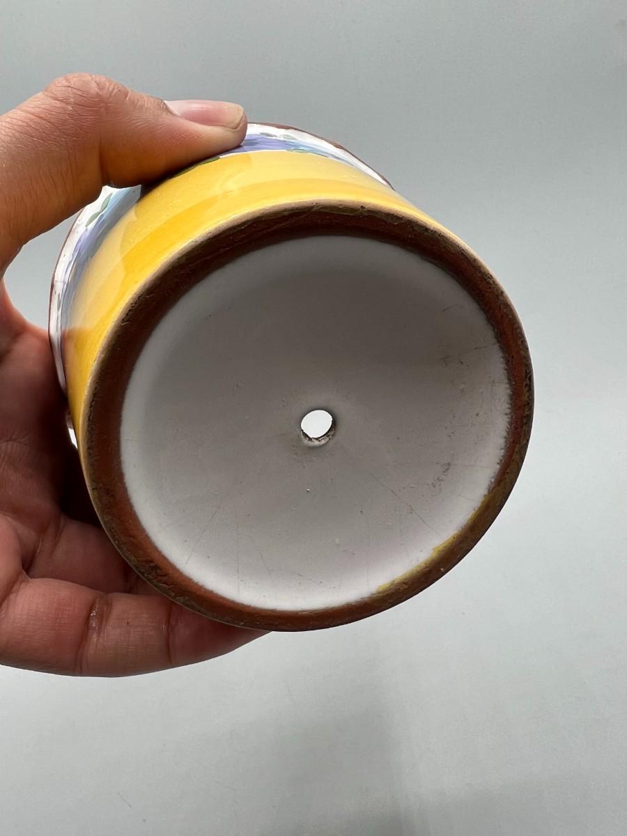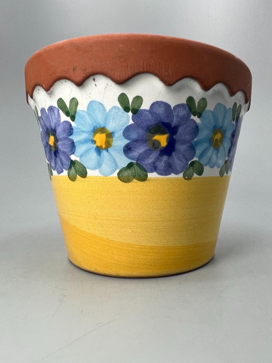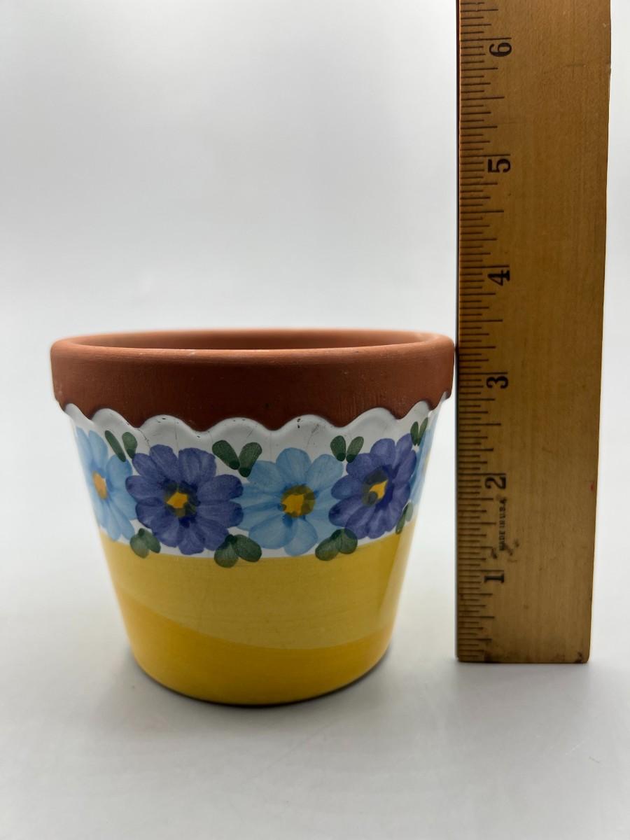 Small Colorful Blue & Purple Painted Flowers Yellow Base Terra Cotta Planter Pot. In good condition. Small, about 3" size.