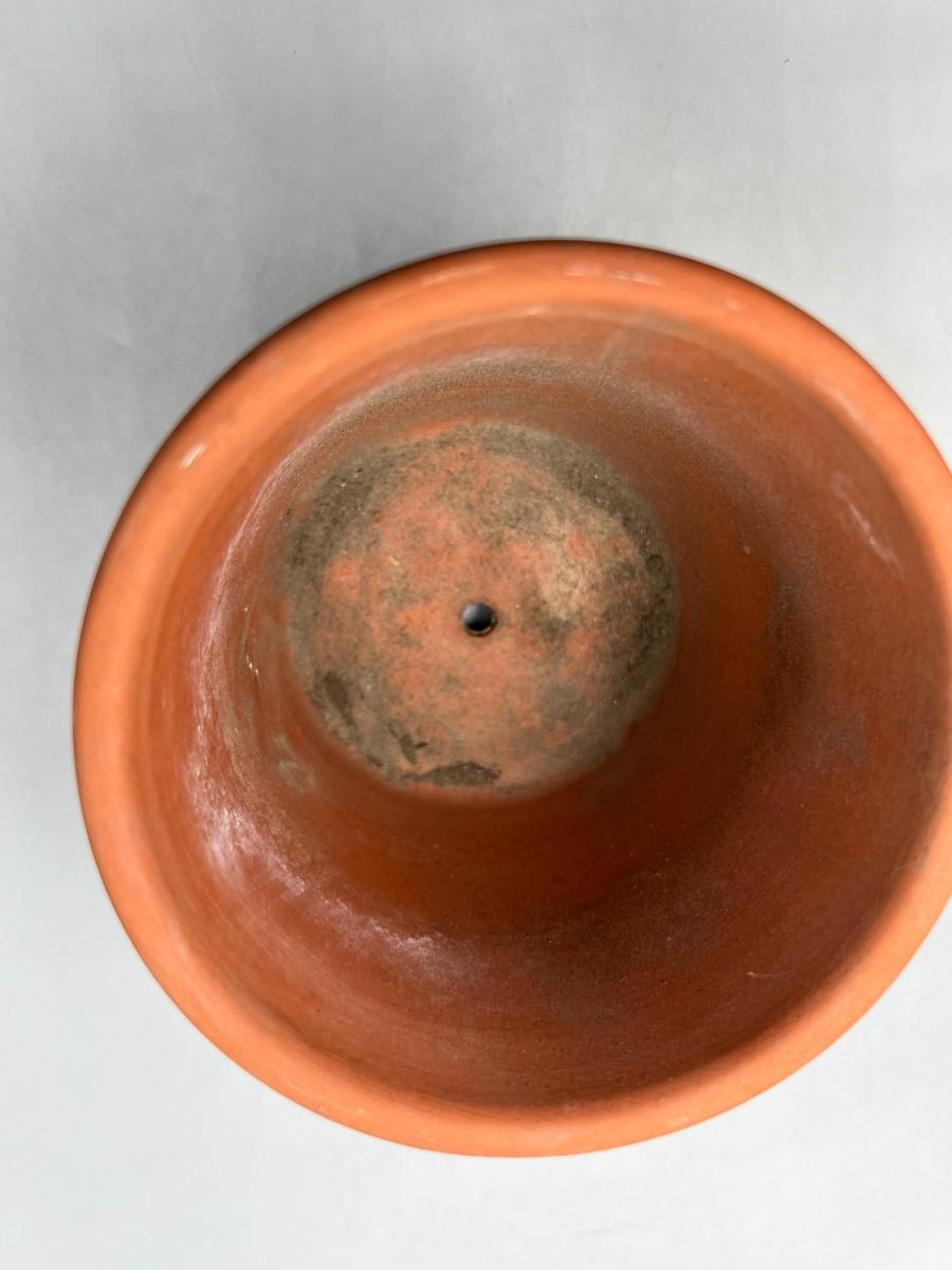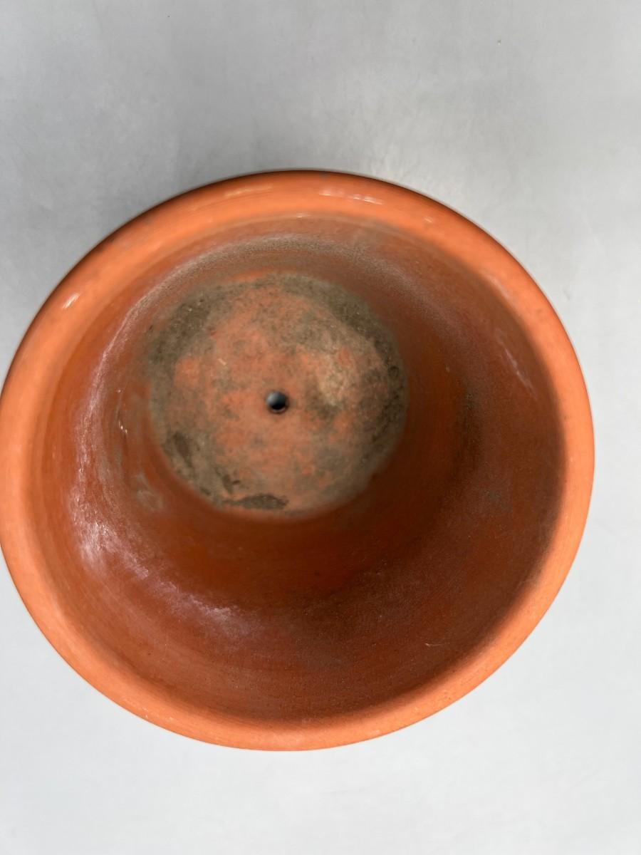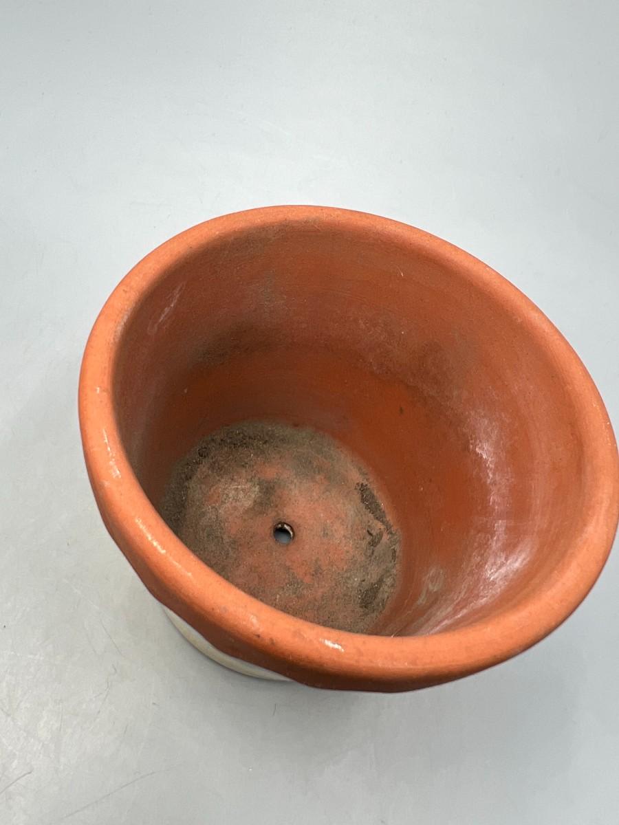 Small Colorful Blue & Purple Painted Flowers Yellow Base Terra Cotta Planter Pot. In good condition. Small, about 3" size.