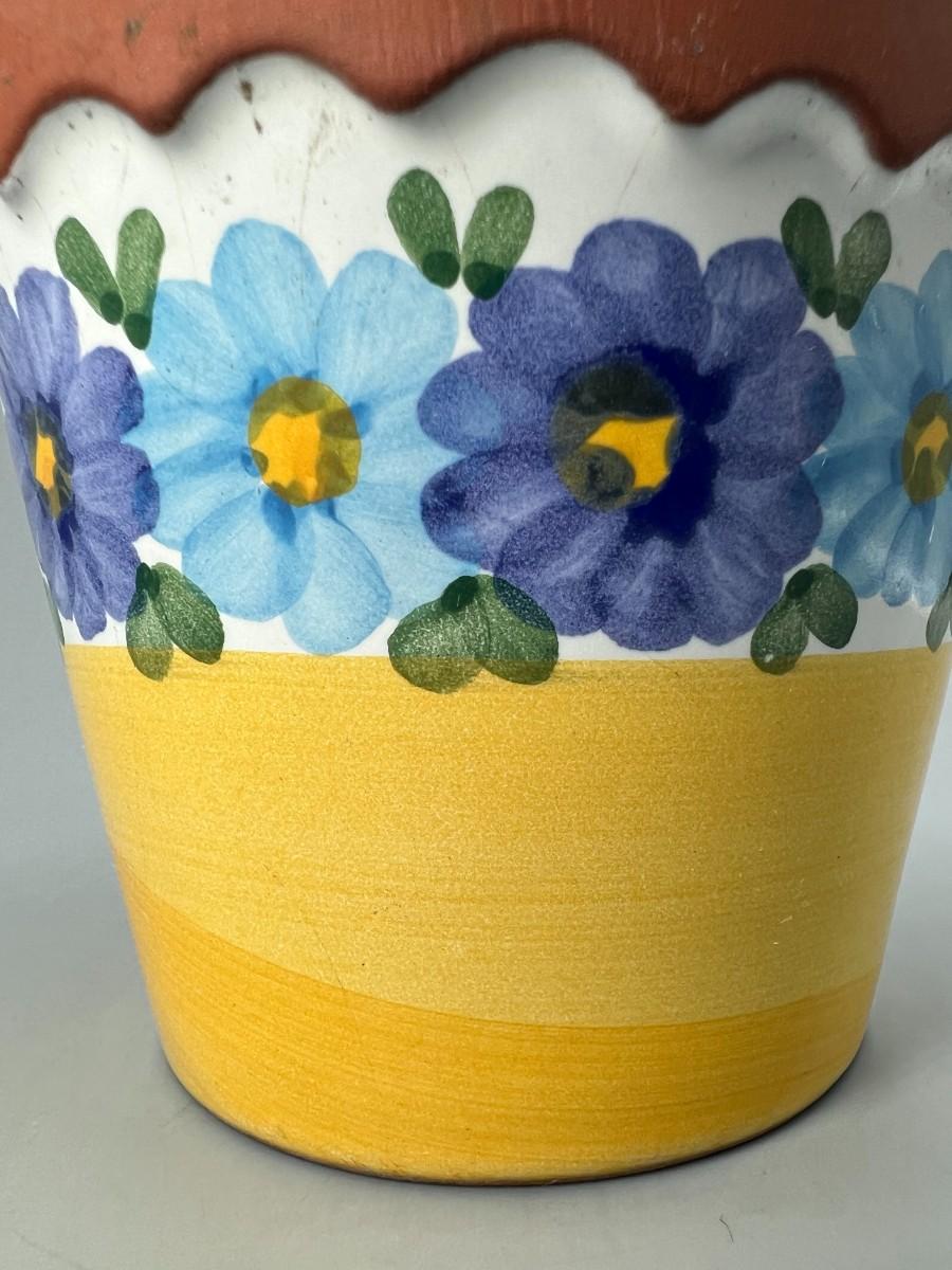 Small Colorful Blue & Purple Painted Flowers Yellow Base Terra Cotta Planter Pot