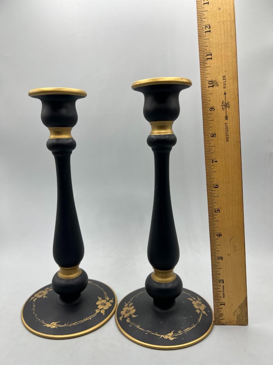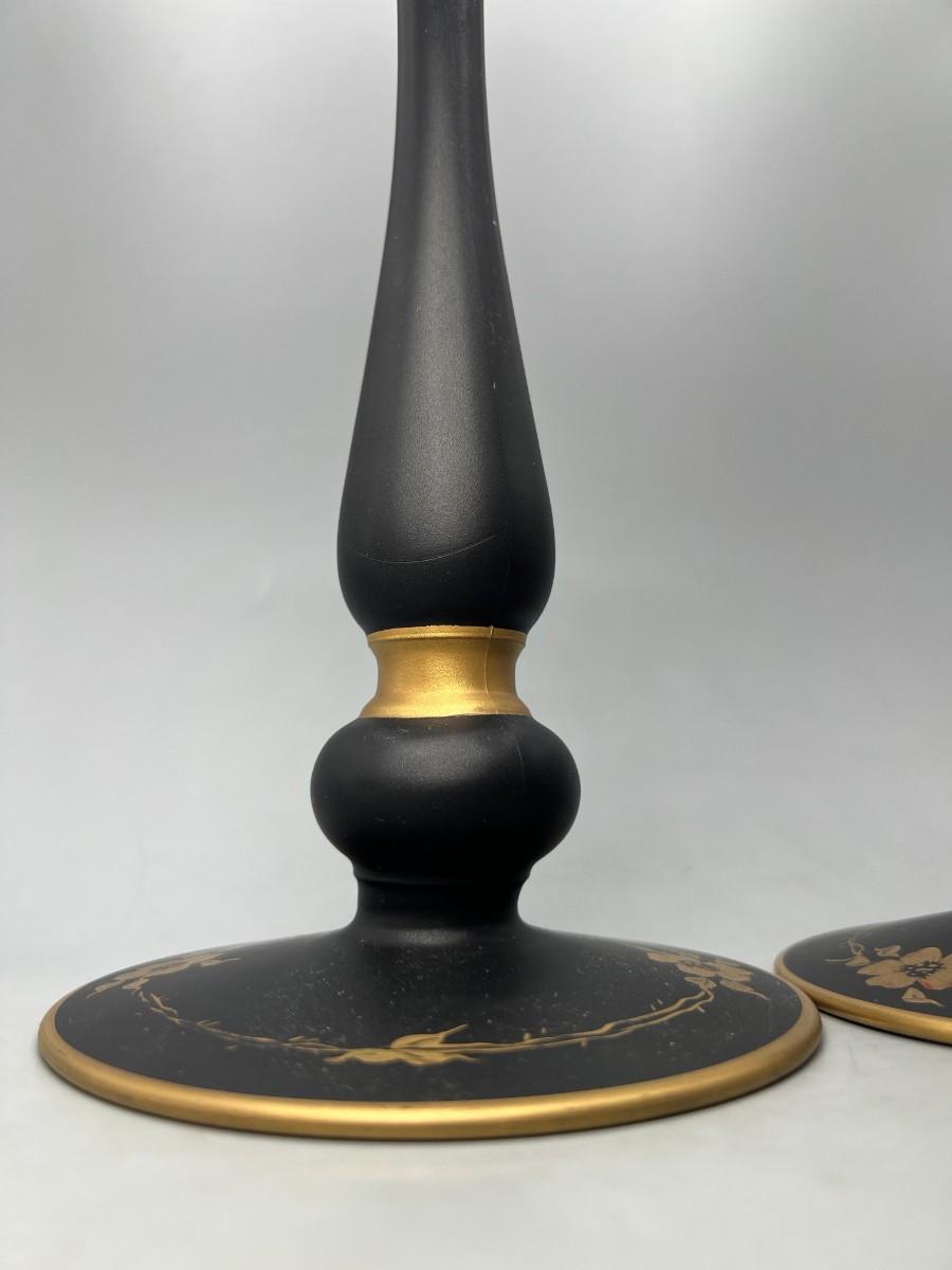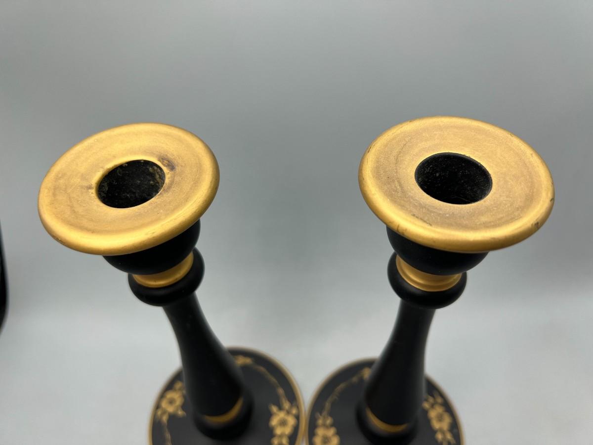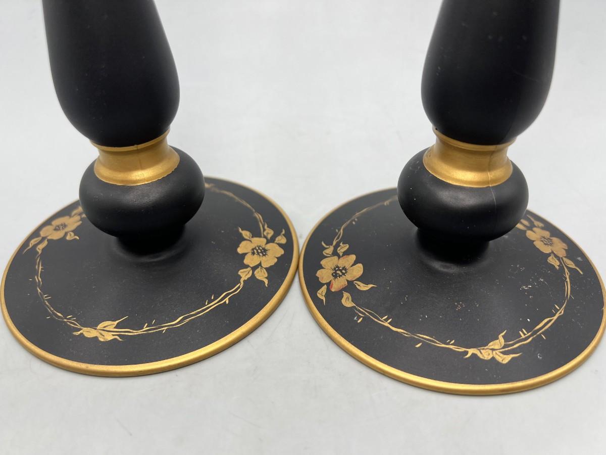 Vintage Pair of Black Satin Gold Motif Rose Flower Motif Gothic Candlesticks